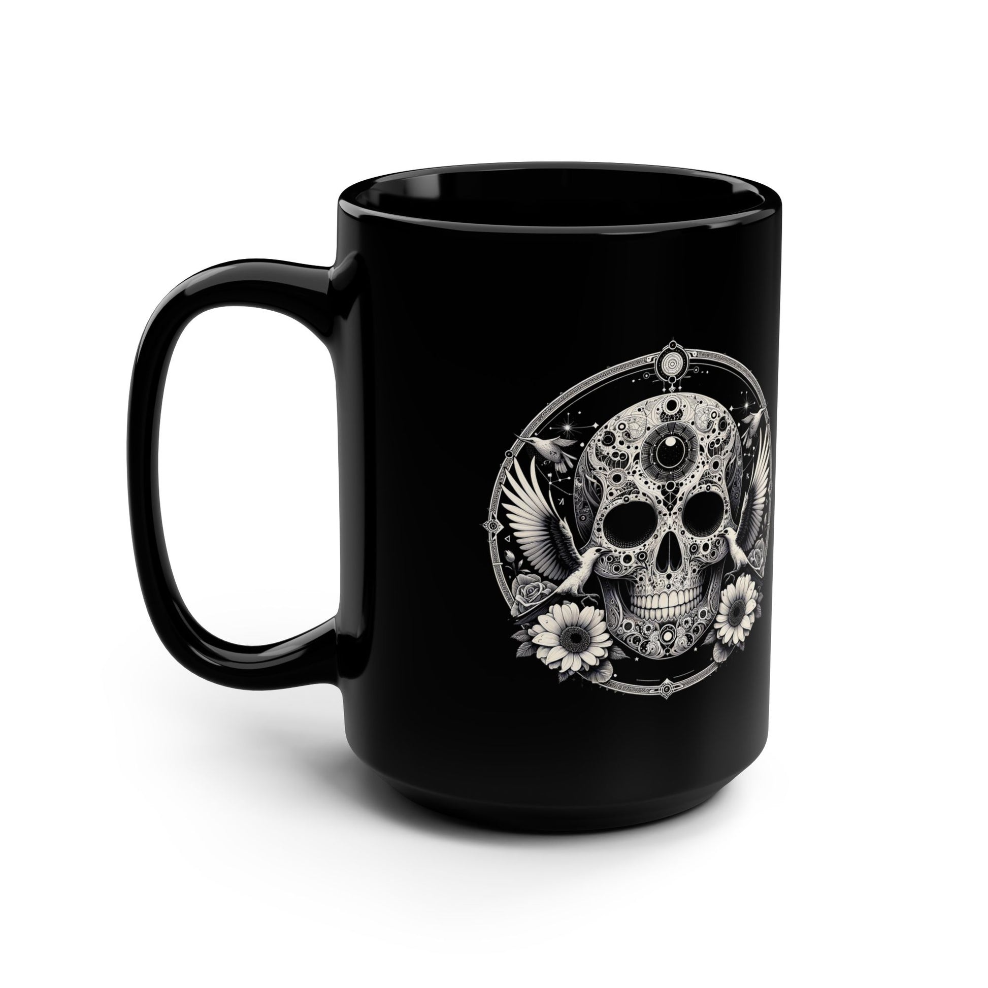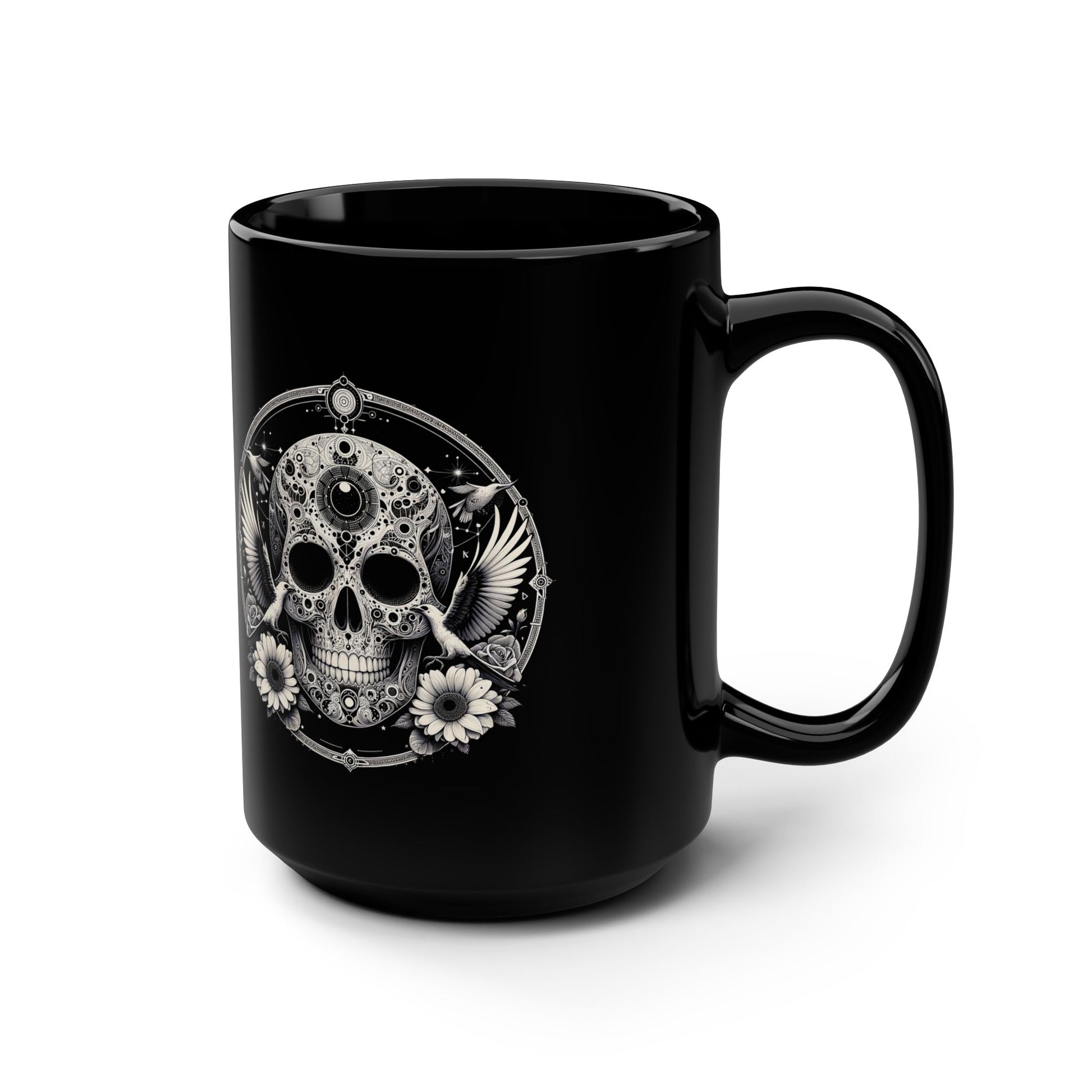 15oz Black Mug — Gothic Skull with Doves & Daisies Coffee Cup
