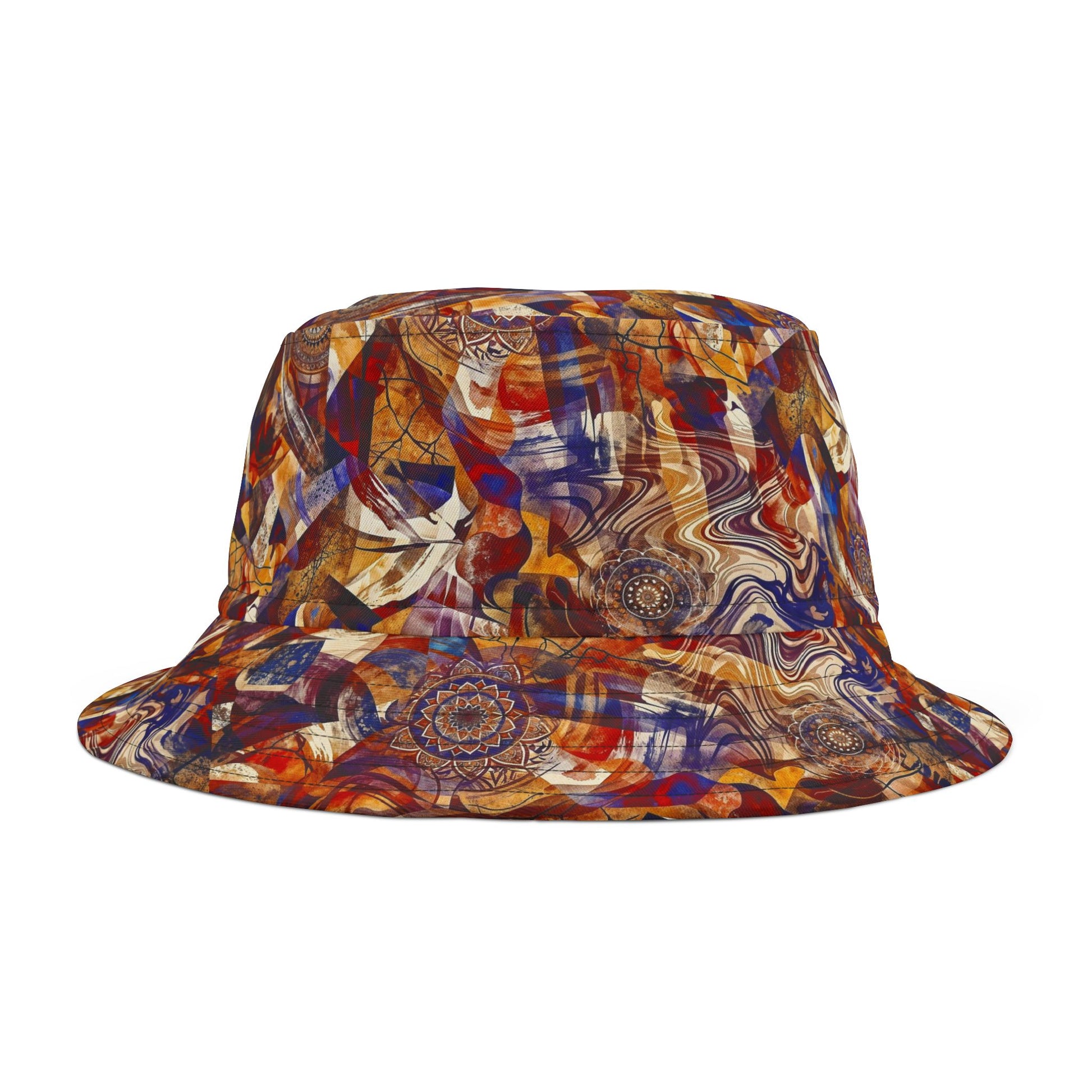 This printed bucket hat brings a bold, painterly energy to everyday outings. Rich swirls of rust, indigo, and ochre blend into an abstract, almost tie-dye landscape that feels both vintage and modern. Lightweight polyester keeps the hat structure crisp while allowing the colors to stay vibrant after repeated wear. Decorative top and brim stitching adds subtle texture and a handcrafted touch. Wear it to shade your face at midday markets, to ground a layered festival look, or as a colorful finishing piece for weekend city walks — it lifts casual outfits without shouting.