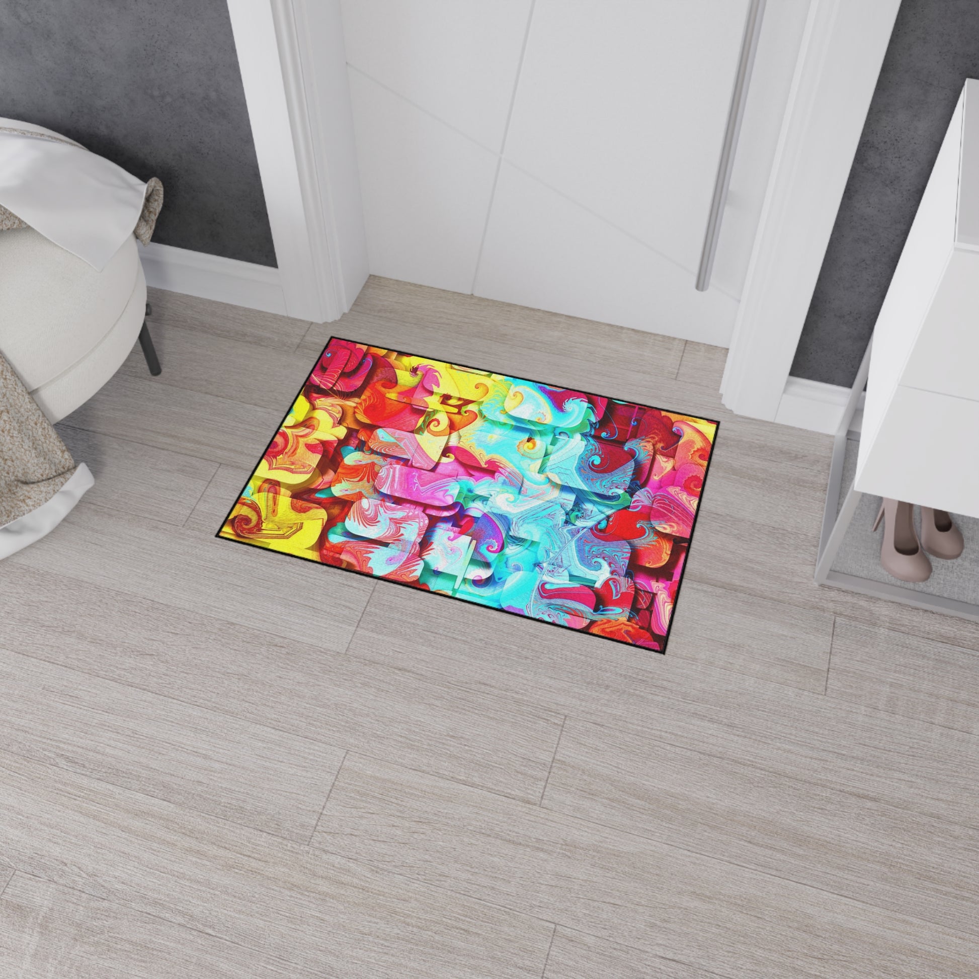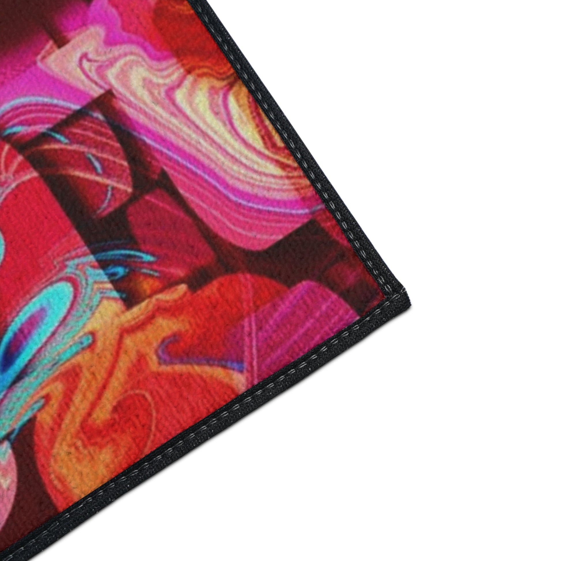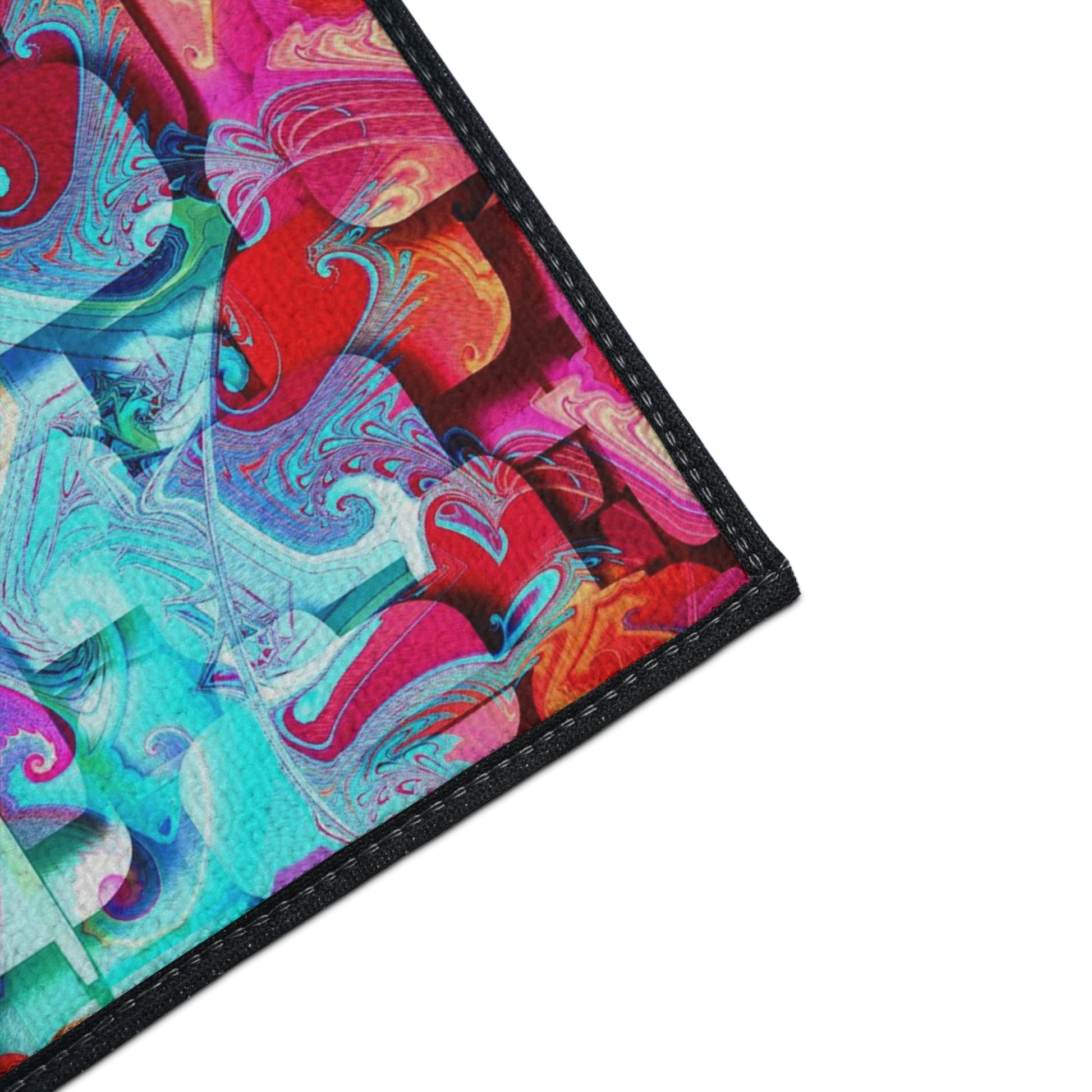 Bright, energetic floor mat designed to bring color and movement into everyday spaces. The printed polyester surface shows a swirling mosaic of vivid hues—pink, teal, yellow and crimson—layered like painted tiles. It lays flat and quiet underfoot, while the textured rubber backing grips floors to prevent slipping. This mat works as a mood-lifting anchor in entryways, studios, or lively kitchens, and stands up to heavy use without fading or fraying. Lightweight to move but built to last, it adds a burst of playful personality to homes that celebrate color and creativity.