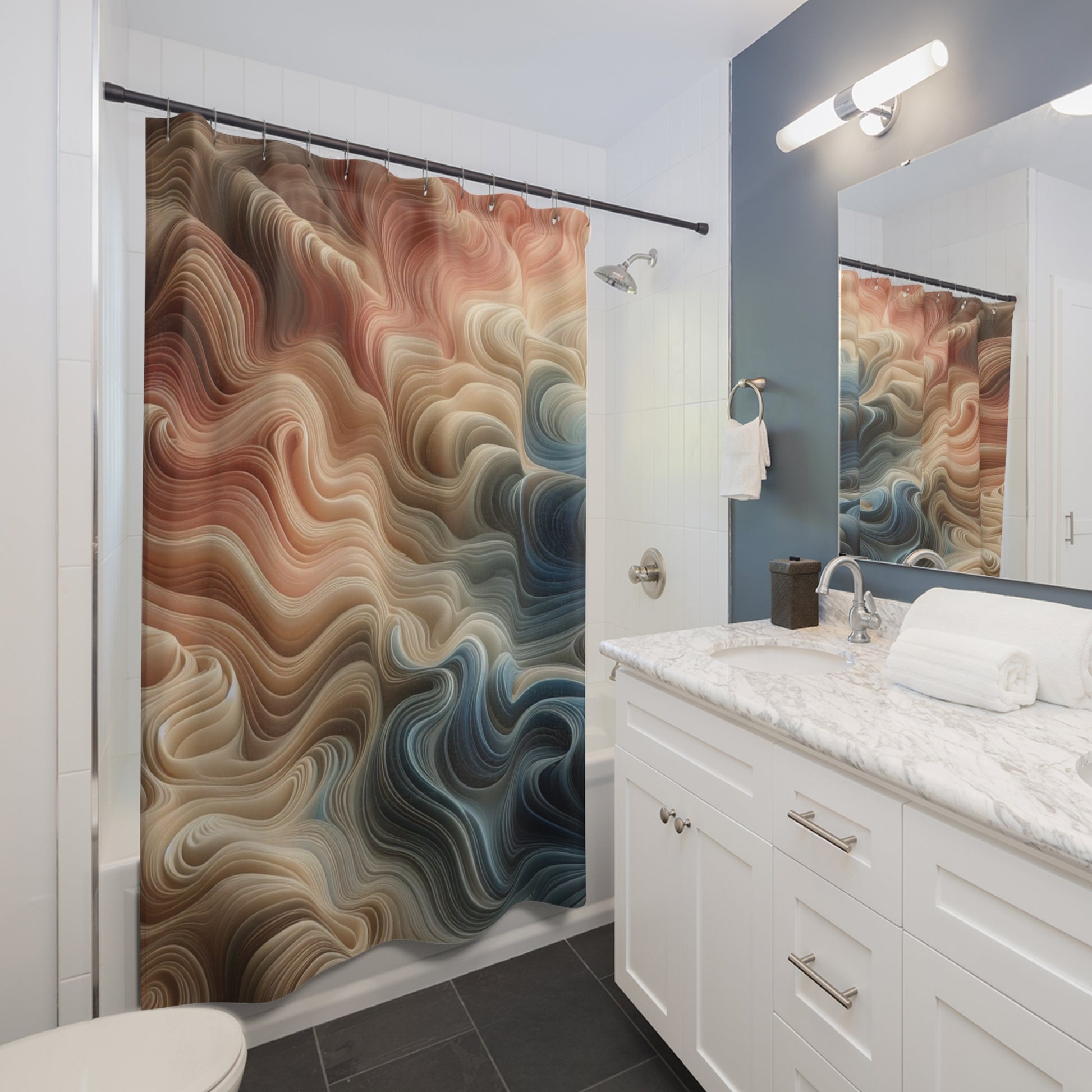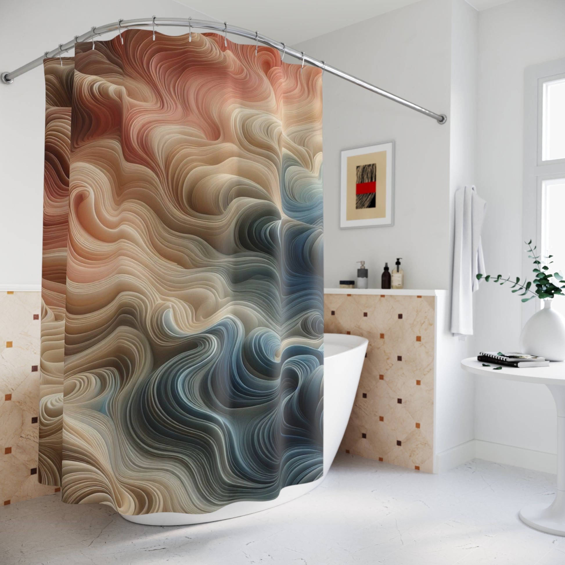 This shower curtain brings a warm, flowing energy to the bathroom — like a calm current of color moving through the room. Soft, layered swirls in sandstone, cream, and slate blue blend together in an almost tactile way, turning a routine shower into a moment of quiet atmosphere. The rich, painterly pattern hides water spots and light wear, so it stays visually inviting day after day. Hang it on a simple rod and watch the space shift from utilitarian to serene; it pairs especially well with natural wood, matte black fixtures, and textured linens.