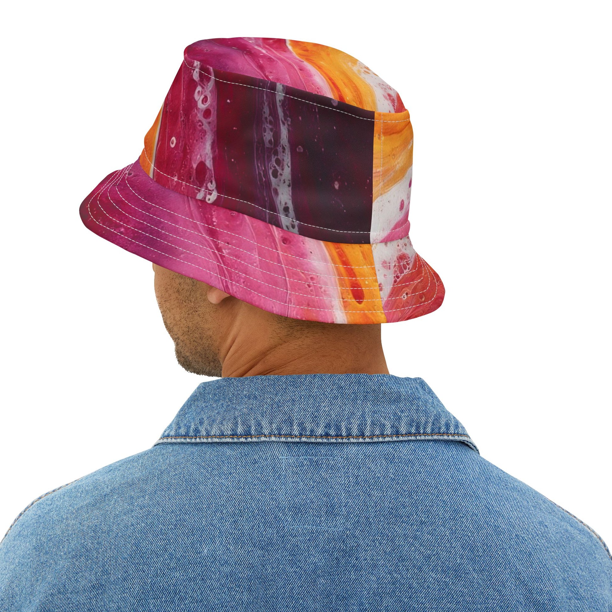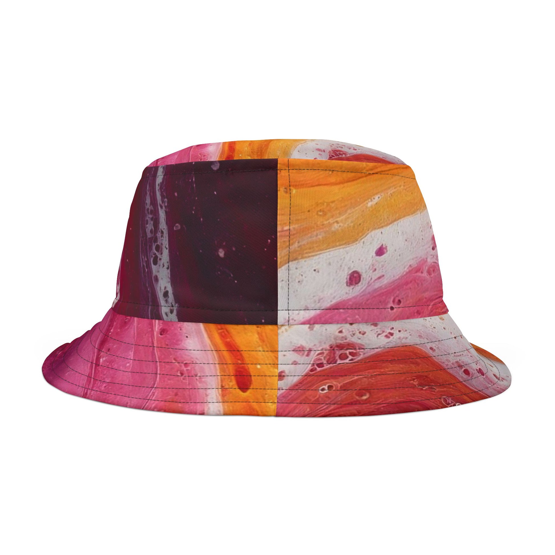 A vibrant, hand-painted-feel bucket hat that brings sunset hues and painterly texture to everyday wear. The bold swaths of orange, magenta, and soft cream create movement across the brim and crown, like a warm watercolor washed across your head. Lightweight polyester keeps the shape crisp while the decorative top-and-bottom brim stitching adds a crafted look. Wear it to shade your face on a festival field, strolls at golden hour, or any day you want an artful pop of color.
