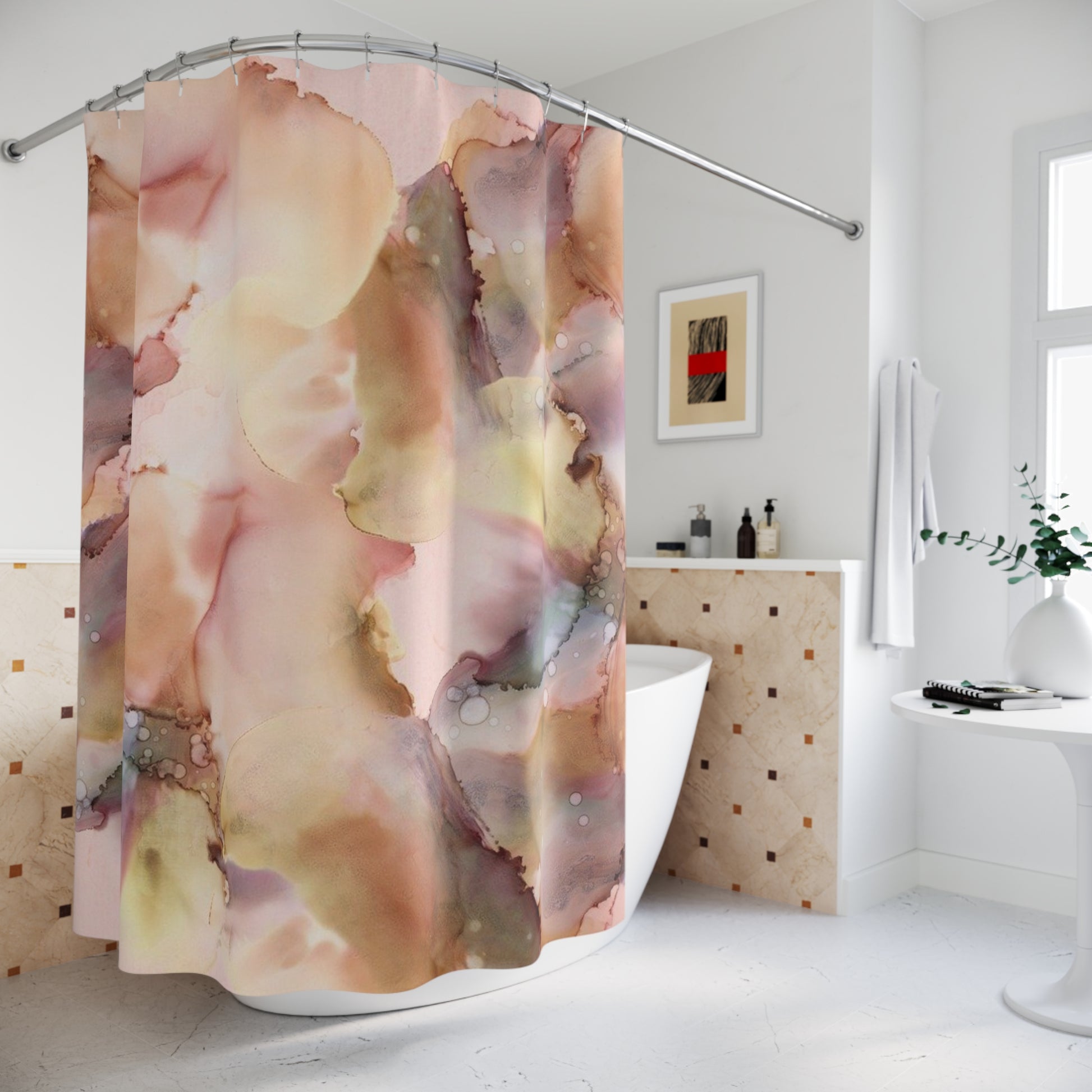 Abstract Watercolor Shower Curtain — Blush, Mauve & Gold Bathroom Decor