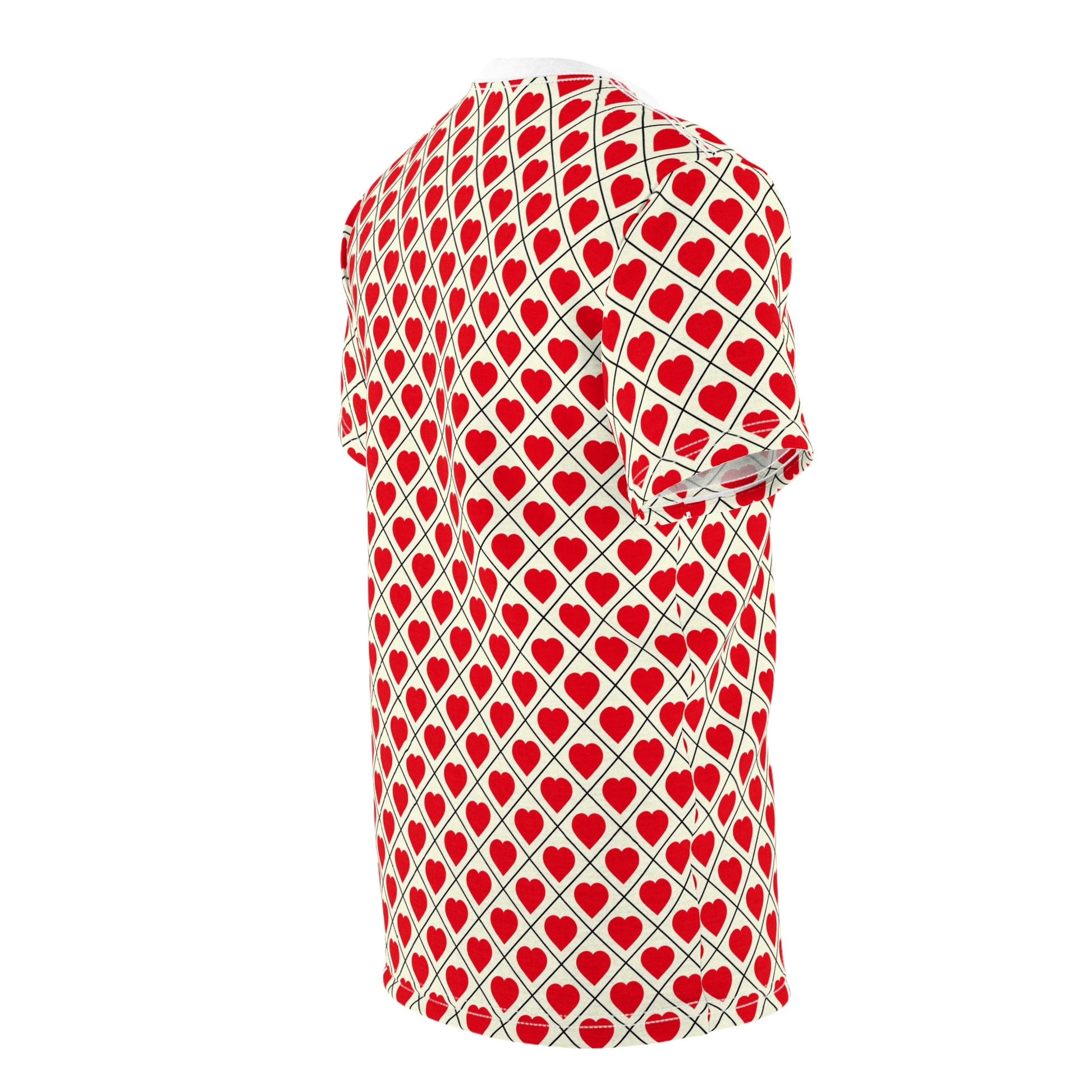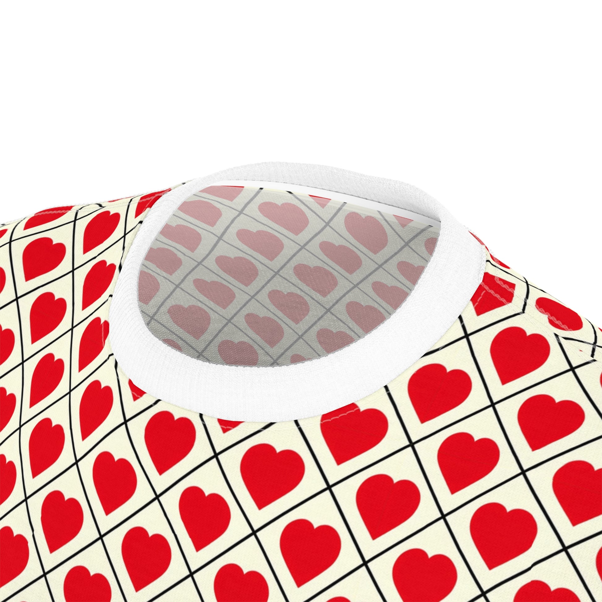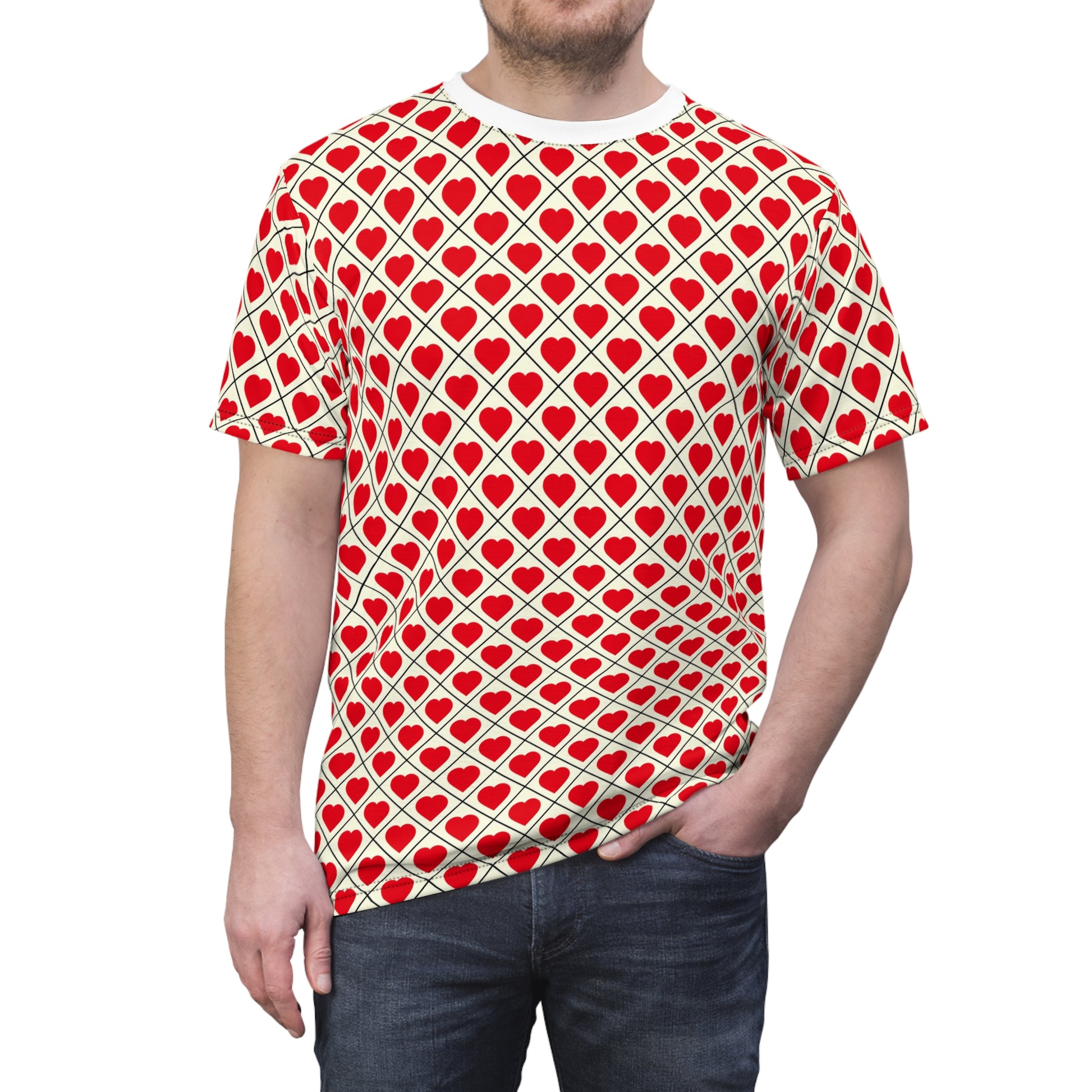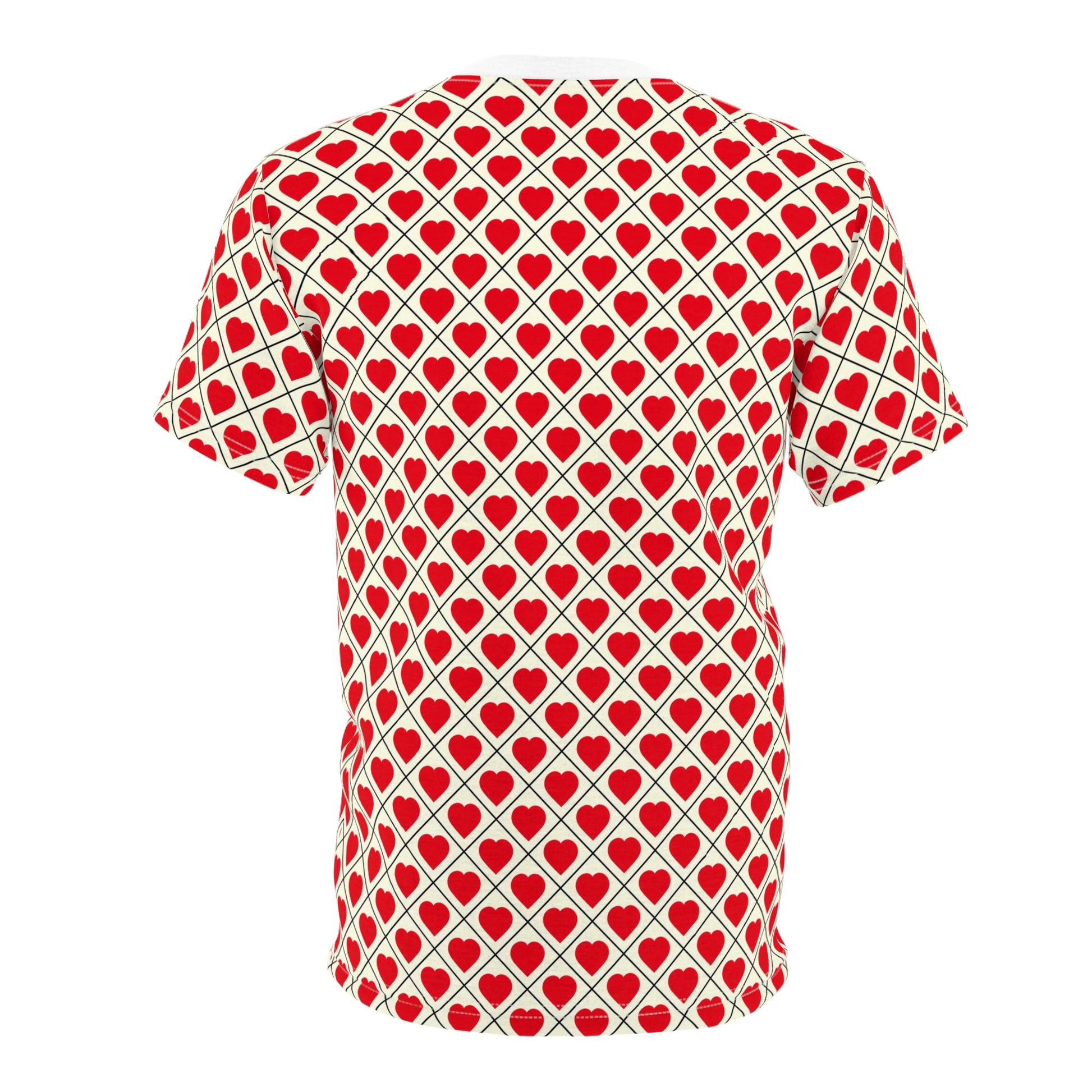 This all-over print tee wraps you in a playful, retro heart lattice—small red hearts set inside a diagonal grid on a warm cream ground. Lightweight and breathable, the smooth polyester surface keeps the vivid red crisp and vivid wash after wash. Wear it when you want to add a wink of romance to your day: under a denim jacket for coffee runs, layered for a date night, or solo with jeans when you want to make a cheerful statement. The regular fit and clean ribbed collar create a relaxed silhouette that moves with you, while the tagless finish and reinforced shoulder tape keep comfort at the forefront. It’s a bright, joyful piece that reads both nostalgic and modern—made for people who like their patterns bold and their mood even bolder.