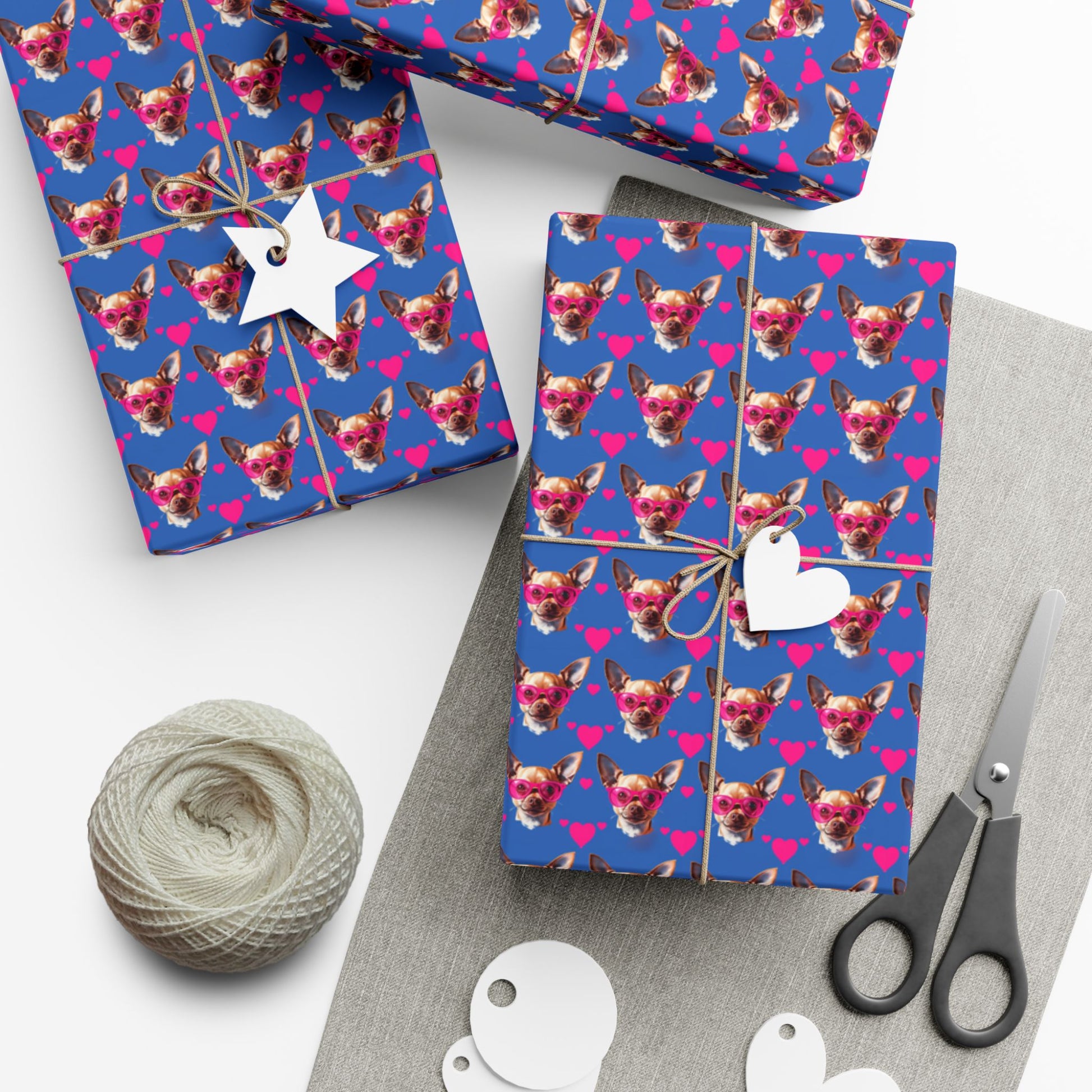 Bright, durable gift wrap that brings playful energy to every present. The bold blue background features a repeating, cheerful dog-face motif with tiny hearts — a little wink of joy that makes unwrapping feel like a celebration. Choose satin for a lively sheen that catches light, or matte for a refined, modern look. The paper resists scratches, water, and cracking when folded, so bows, corners, and layers stay crisp. Printed with water-based, Greenguard UL certified inks on 100% recyclable paper, it’s designed to look great and hold up from ribbon to reveal. Sizes available let you wrap small trinkets or larger boxes with the same vibrant finish, and each sheet is assembled in the USA from globally sourced parts.