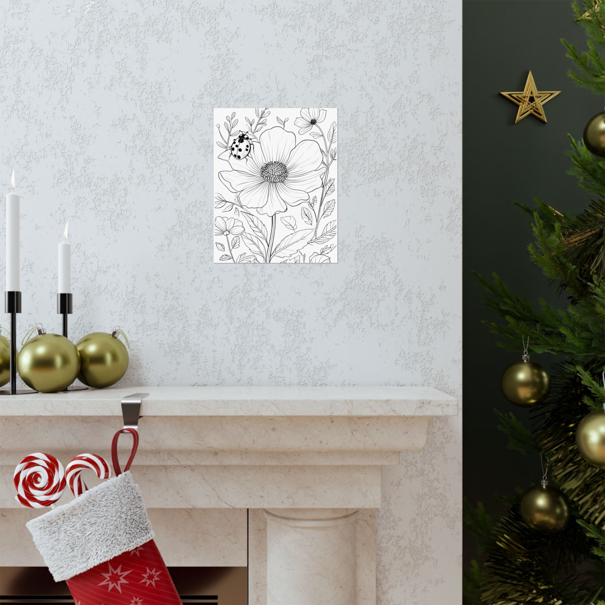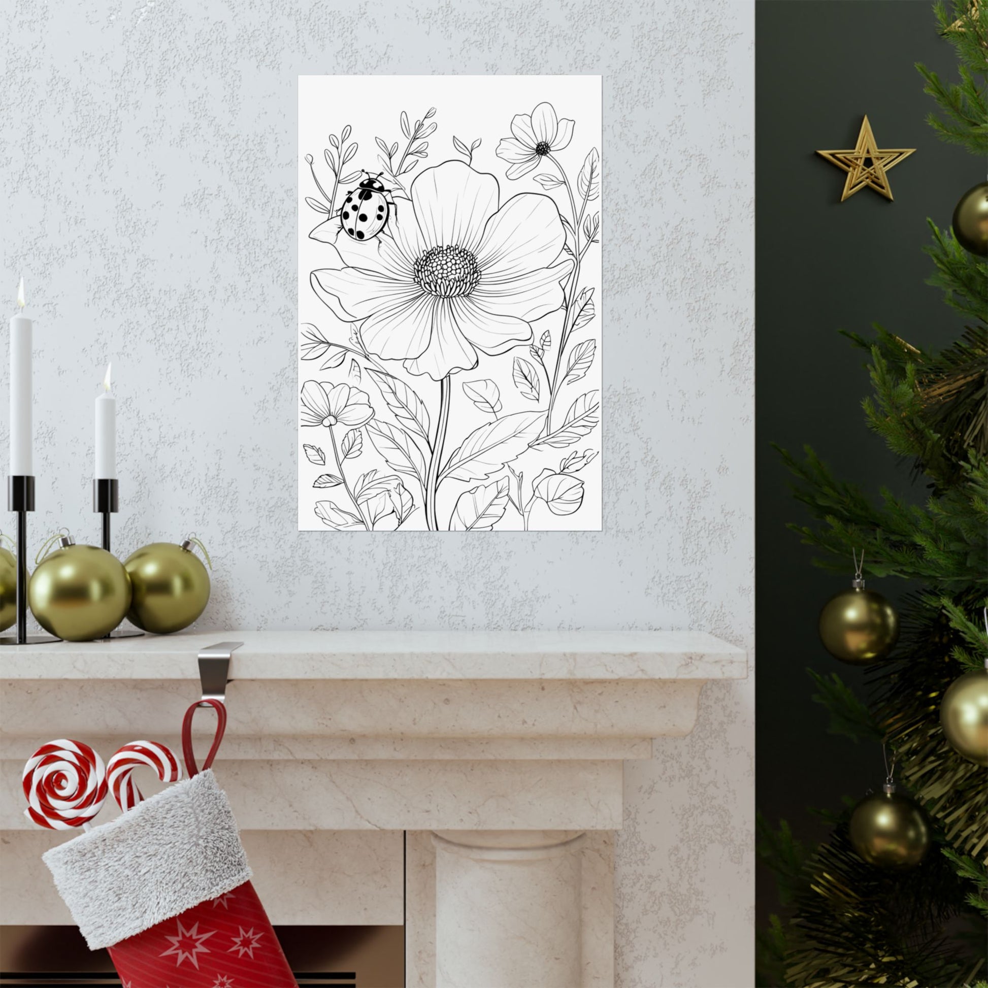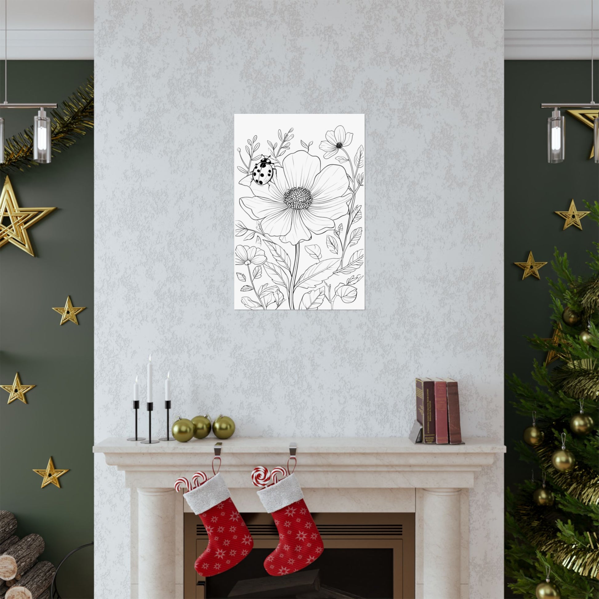 Botanical Ladybug Matte Poster — Floral Line Art Vertical Wall Print