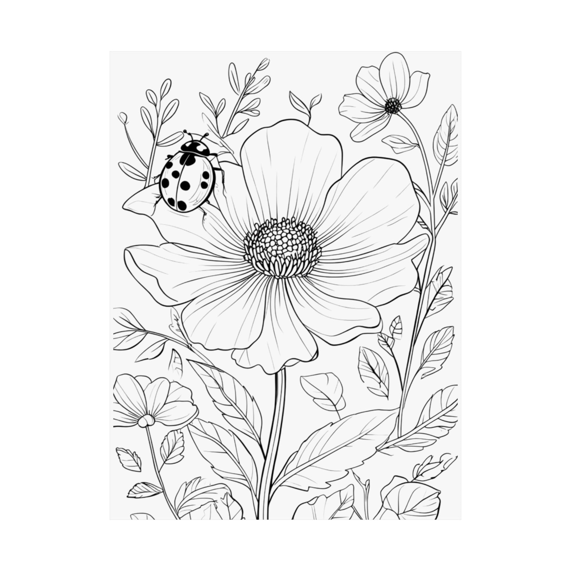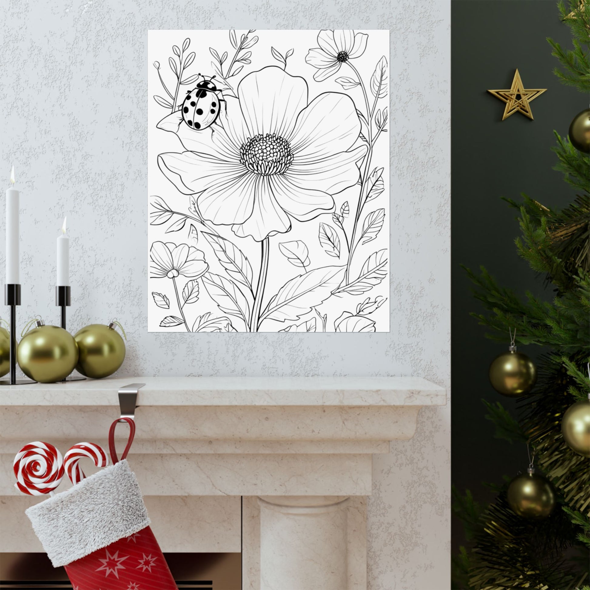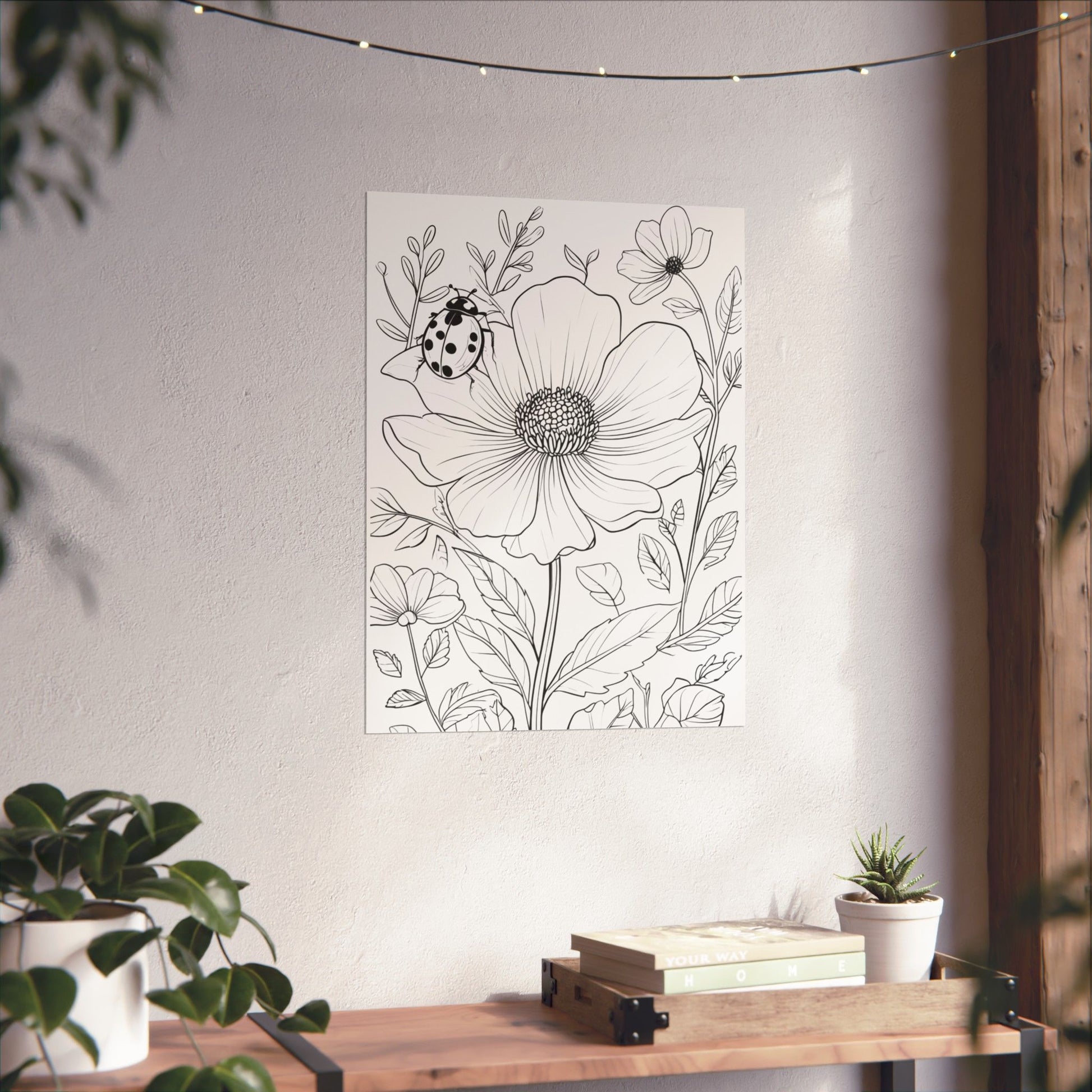 Botanical Ladybug Matte Poster — Floral Line Art Vertical Wall Print