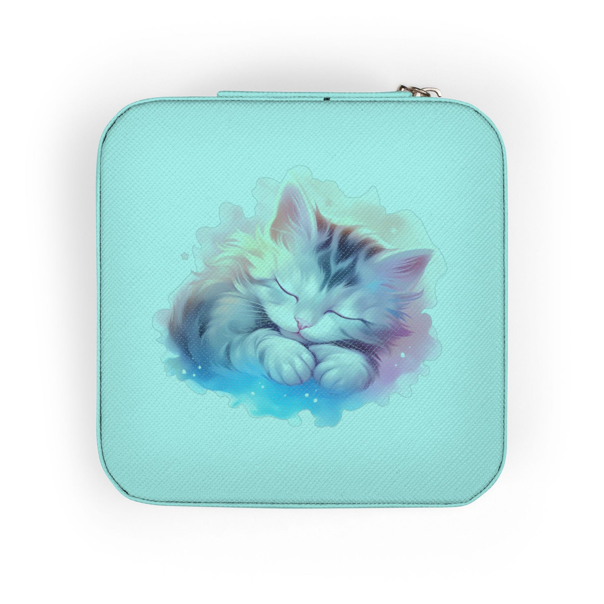 A compact travel jewelry case that keeps treasured pieces safe and beautifully organized on the go. Soft blush PU leather wraps a plush, scratch-resistant interior with divided compartments, ring rolls, and three necklace hooks so chains stay tangle-free. The square zip-around design closes securely and fits neatly inside a purse or carry-on. Subtle watercolor cat artwork on the lid adds a gentle, personal touch—small enough to carry everywhere, yet thoughtfully arranged to protect delicate rings, studs, and chains during weekend trips or longer journeys.