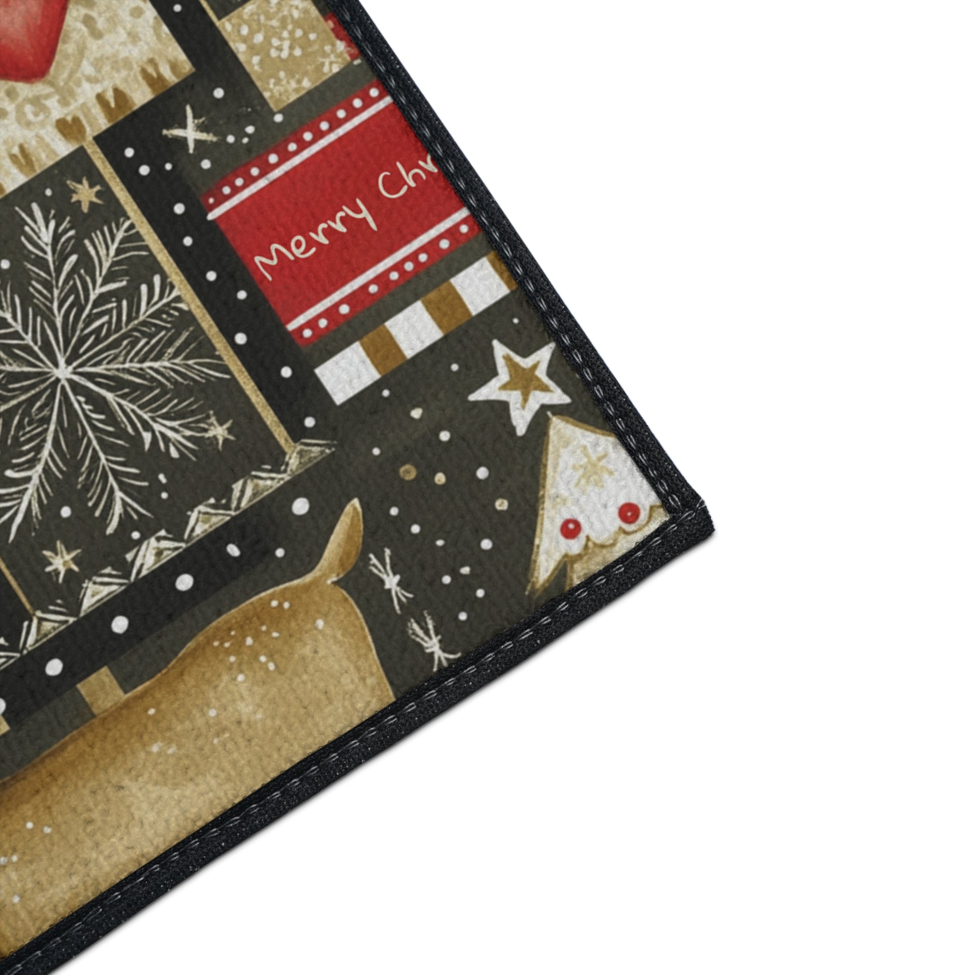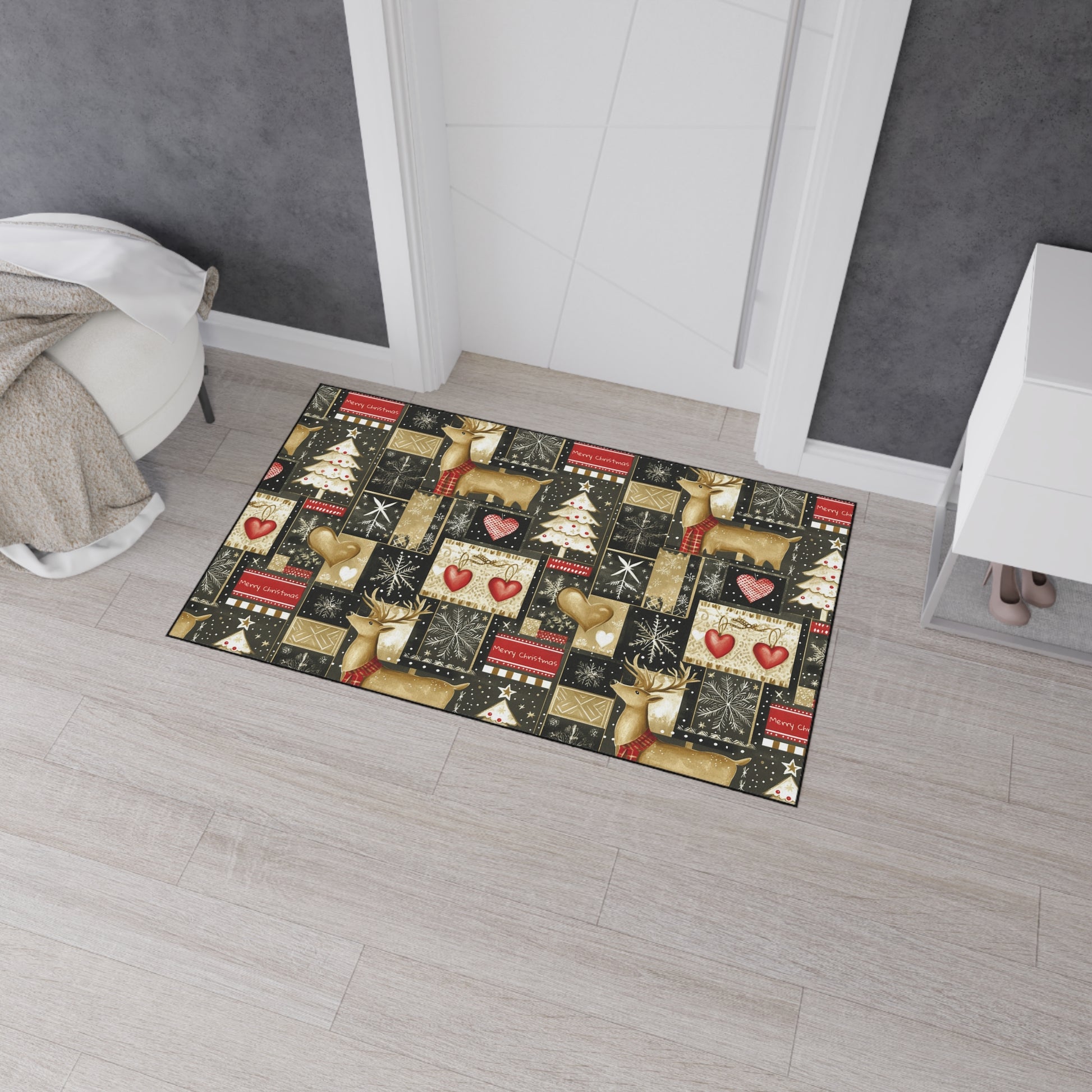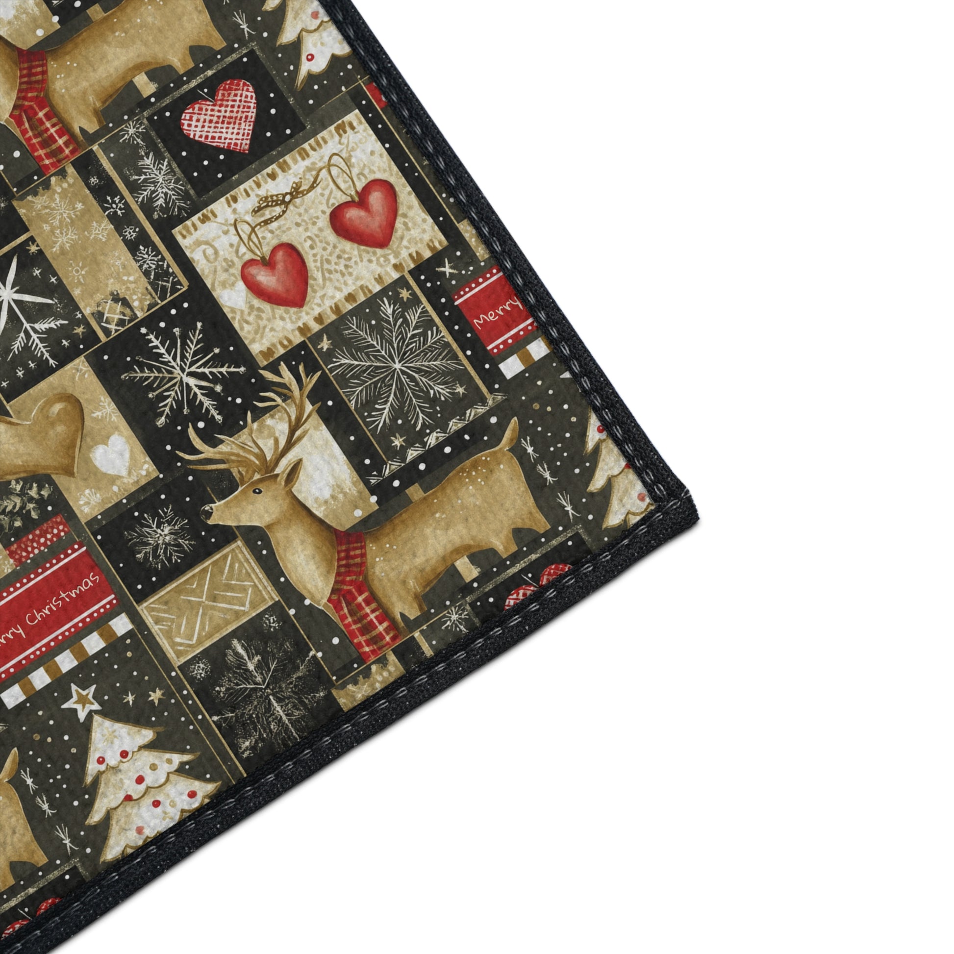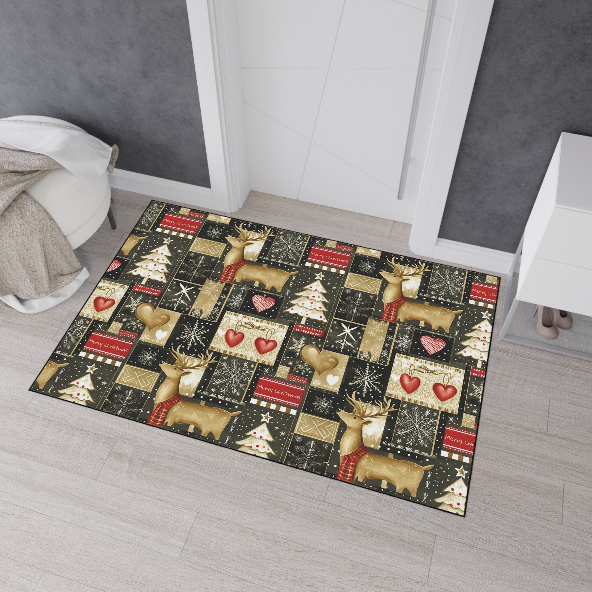 Bring warm, nostalgic holiday charm to your entryway with this heavy-duty floor mat. The vintage-inspired patchwork design—featuring reindeer, decorated trees, hearts, and cozy plaid accents—sets a welcoming tone the moment guests step inside. The textured polyester surface shows off rich, crisp colors while resisting daily wear. A durable rubber backing grips floors to prevent sliding and protect against damp shoes and light messes. This mat slips easily into seasonal routines: layer it by the front door for winter gatherings, place it under a holiday tree skirt to catch stray needles, or tuck it in a mudroom where family boots come and go. It’s made to stand up to real life while keeping your home feeling warm and festive.