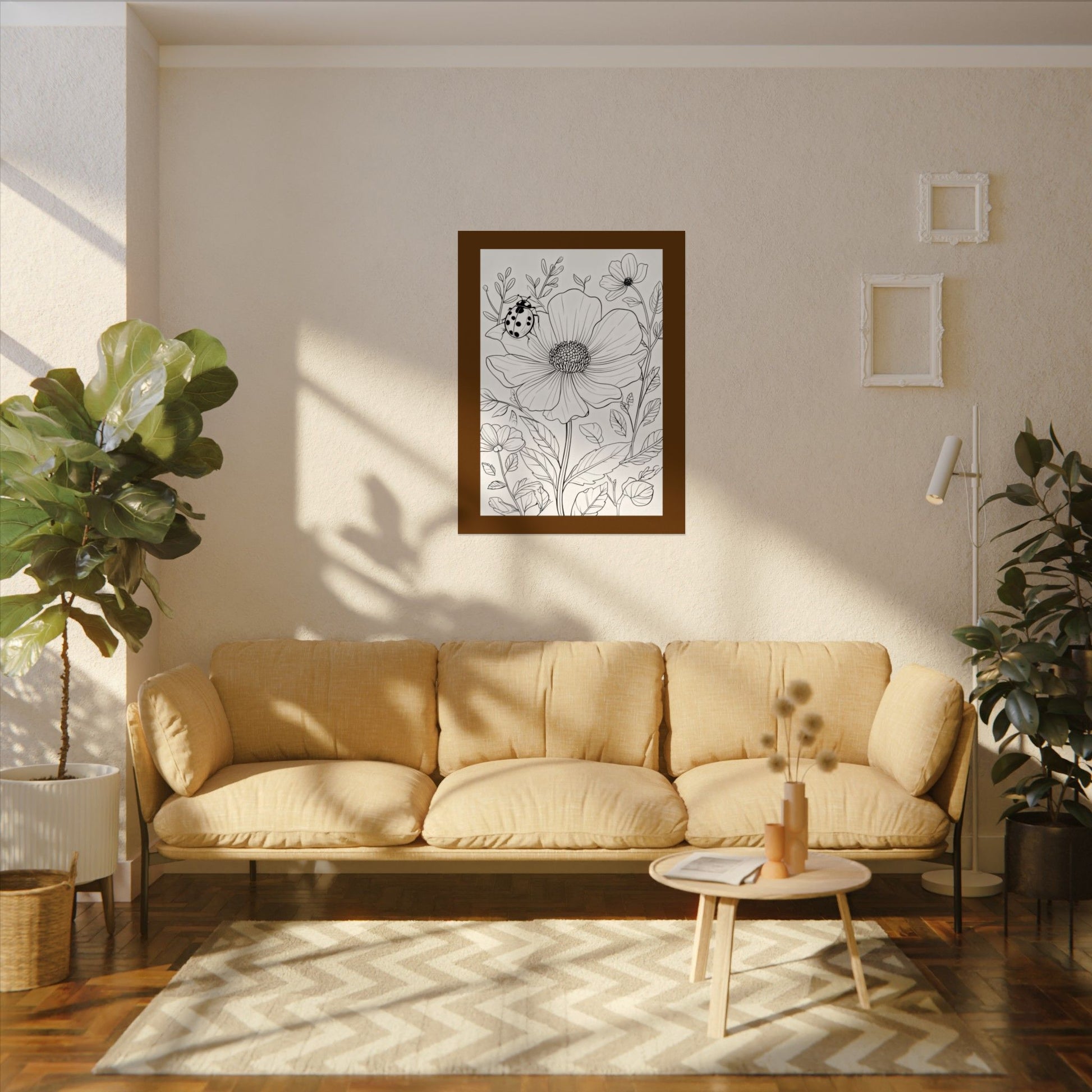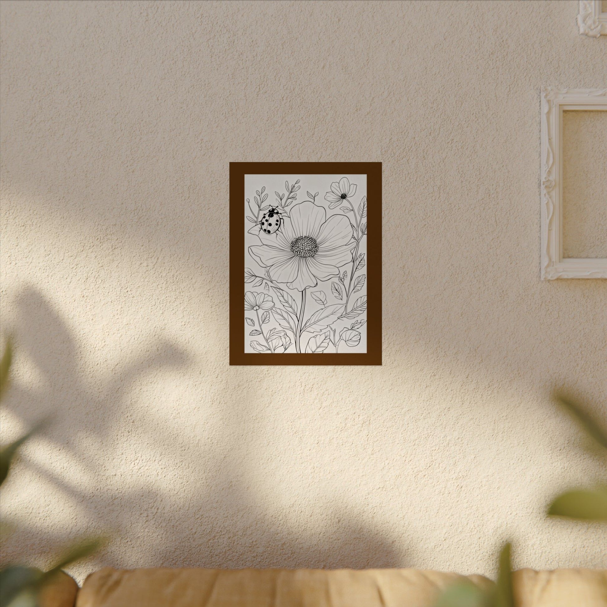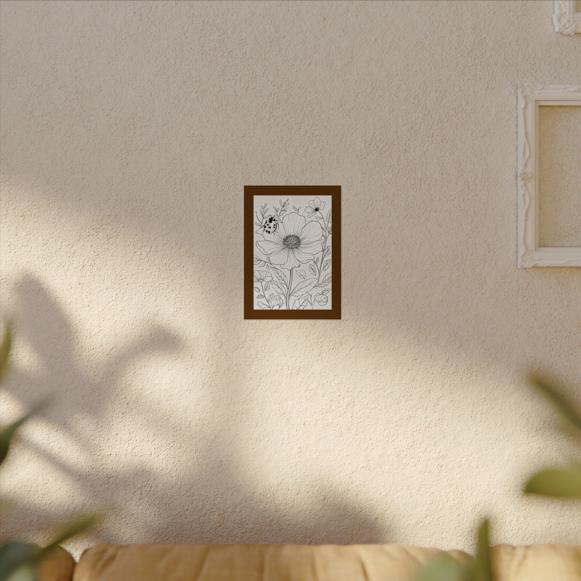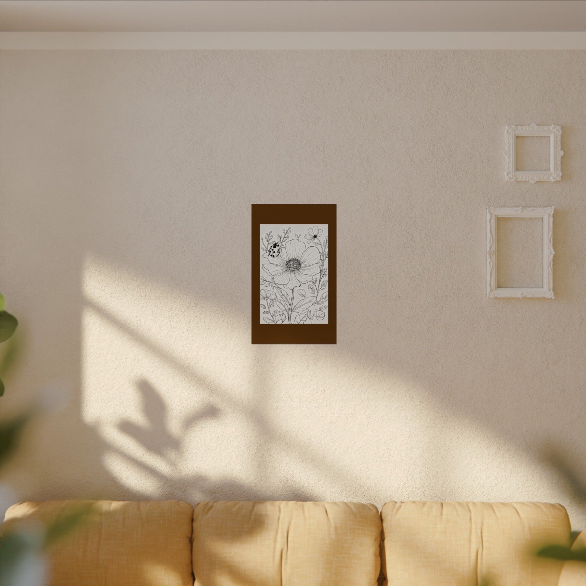 This textured watercolor matte poster brings calm, hand-drawn floral linework into any indoor space. Printed on heavyweight 285gsm textured watercolor paper with archival inks, the botanical composition reads like a sketchbook page—soft, detailed, and quietly alive. Light catches the subtle matte texture to reveal depth in the petals and leaves, while the neutral monochrome palette keeps the piece versatile: it layers easily with mixed-gallery walls or anchors a minimalist nook. Choose from multiple sizes and orientations to fit your wall and mood; each print is assembled in the USA and made to last for years of daily quiet viewing.