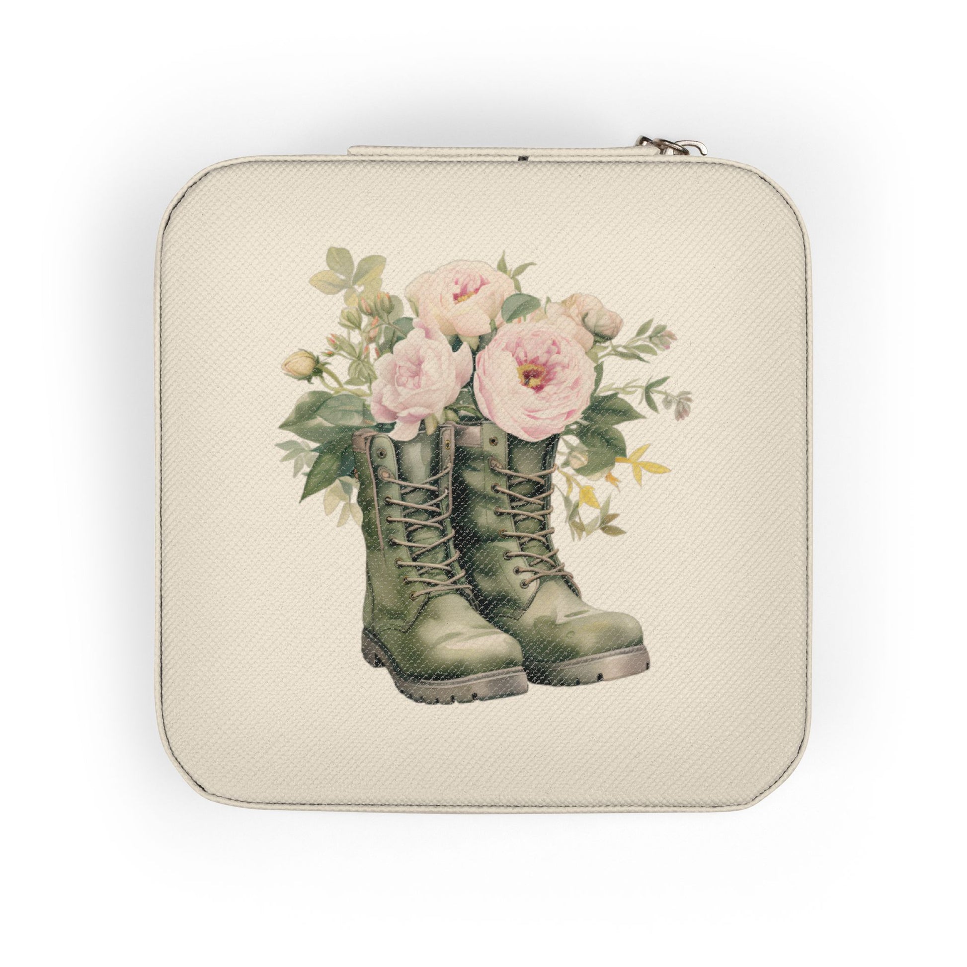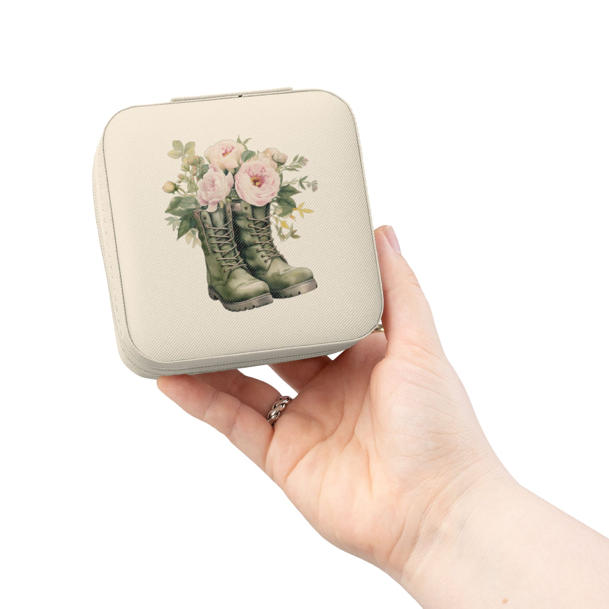 A petite jewelry travel case designed to keep small treasures safe and lovely on the go. Soft blush PU leather wraps a cushioned, plush-lined interior with divided compartments, ring rolls, and necklace hooks so pieces stay separated and scratch-free. The square zip-around design closes securely, slipping easily into a purse or carry-on. A delicate floral boot illustration on the lid adds a homespun, wander-ready charm — a quiet companion for short trips, weekend getaways, or daily commutes.