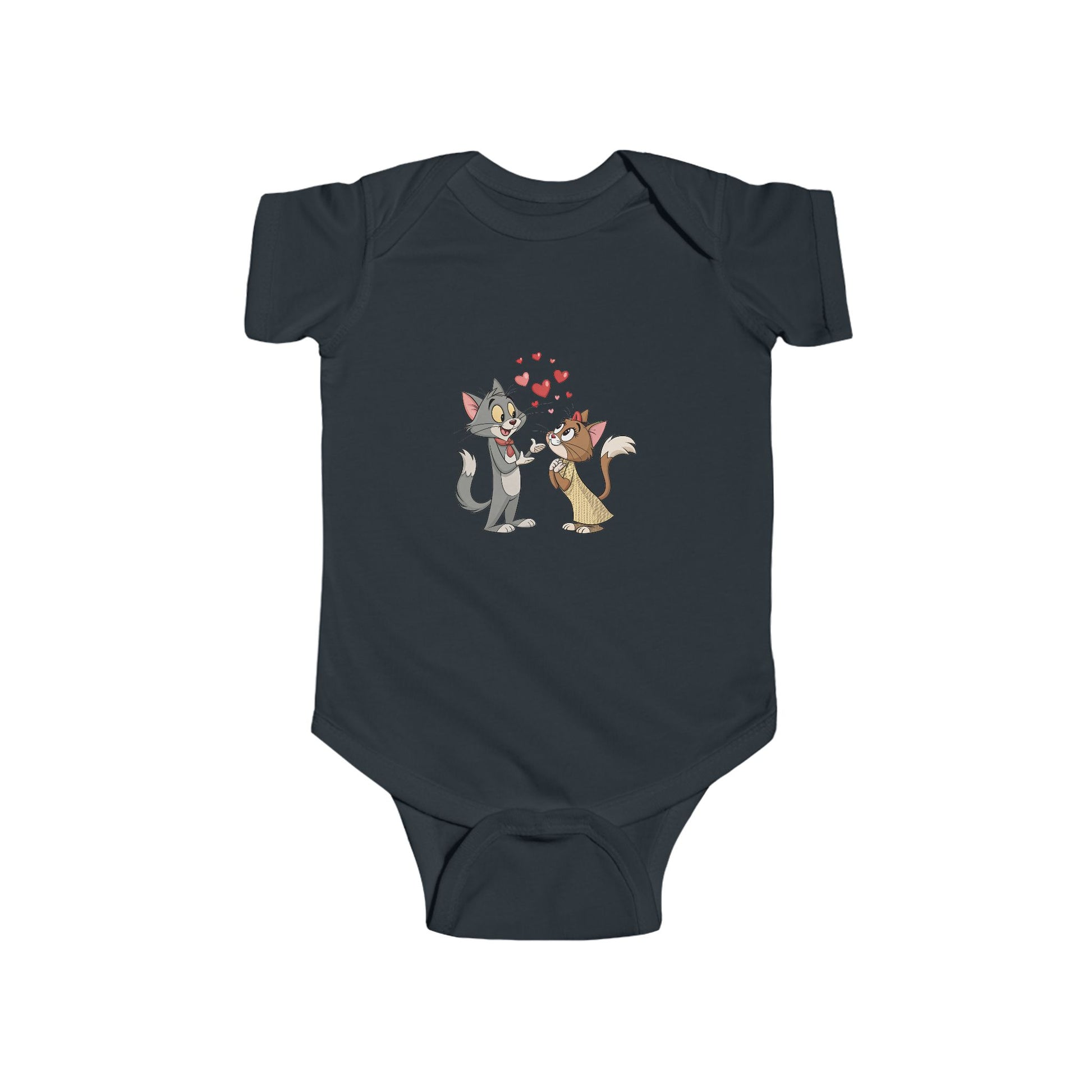 Soft, lightweight infant bodysuit featuring a whimsical hand-drawn illustration of two playful kittens trading heart-shaped kisses. Breathable combed ringspun cotton keeps little ones comfortable against sensitive skin, while the ribbed knit binding around the neck and arm openings lets tiny arms move freely. Side seams and a structured cut help the onesie hold its shape through washes. Matching snaps at the crotch make diaper changes quick and gentle. The subtle, vintage-inspired artwork brings a warm, cozy mood — perfect for quiet mornings, family photos, or cuddly afternoons at home.