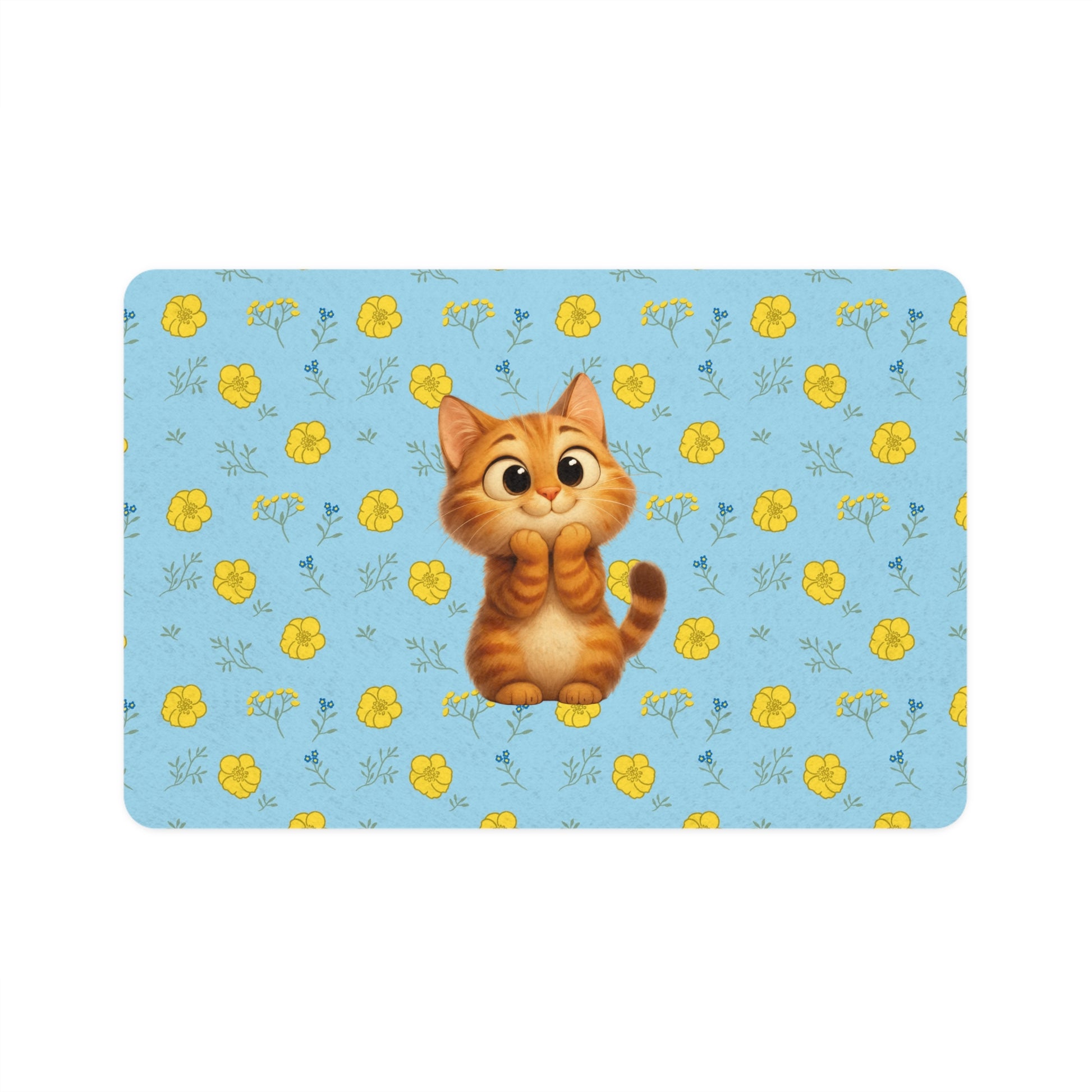 Cute Orange Kitten Pet Food Mat (12x18) — Non-Slip Cat Feeding Placemat with Floral Blue Background