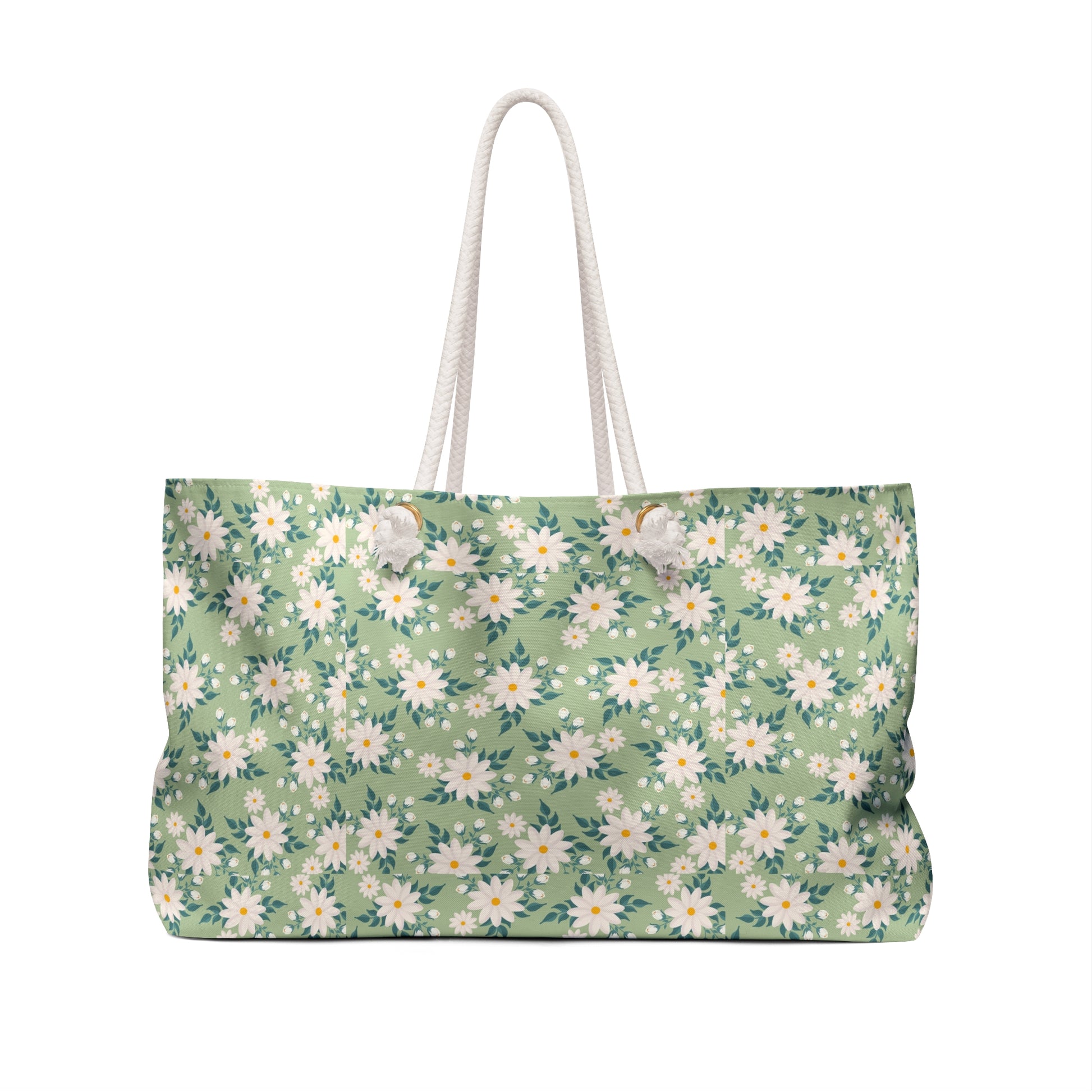 Breathe easy and pack light with this roomy floral weekender. The soft green field scattered with white daisies feels like a slow morning on a porch — simple, bright, and calm. The wide T-bottom holds a weekend’s worth of clothes, a sweater, and a toiletry pouch without looking bulky. Thick cream rope handles sit comfortably over the shoulder and thread through gold-toned grommets for a relaxed, coastal vibe. Inside, a cream sheeting lining keeps everything neat while the spun polyester exterior resists wrinkling so your bag looks tidy straight out of the car. Bring it along for market mornings, lakehouse weekends, or the quiet rush of catching a late-afternoon train.