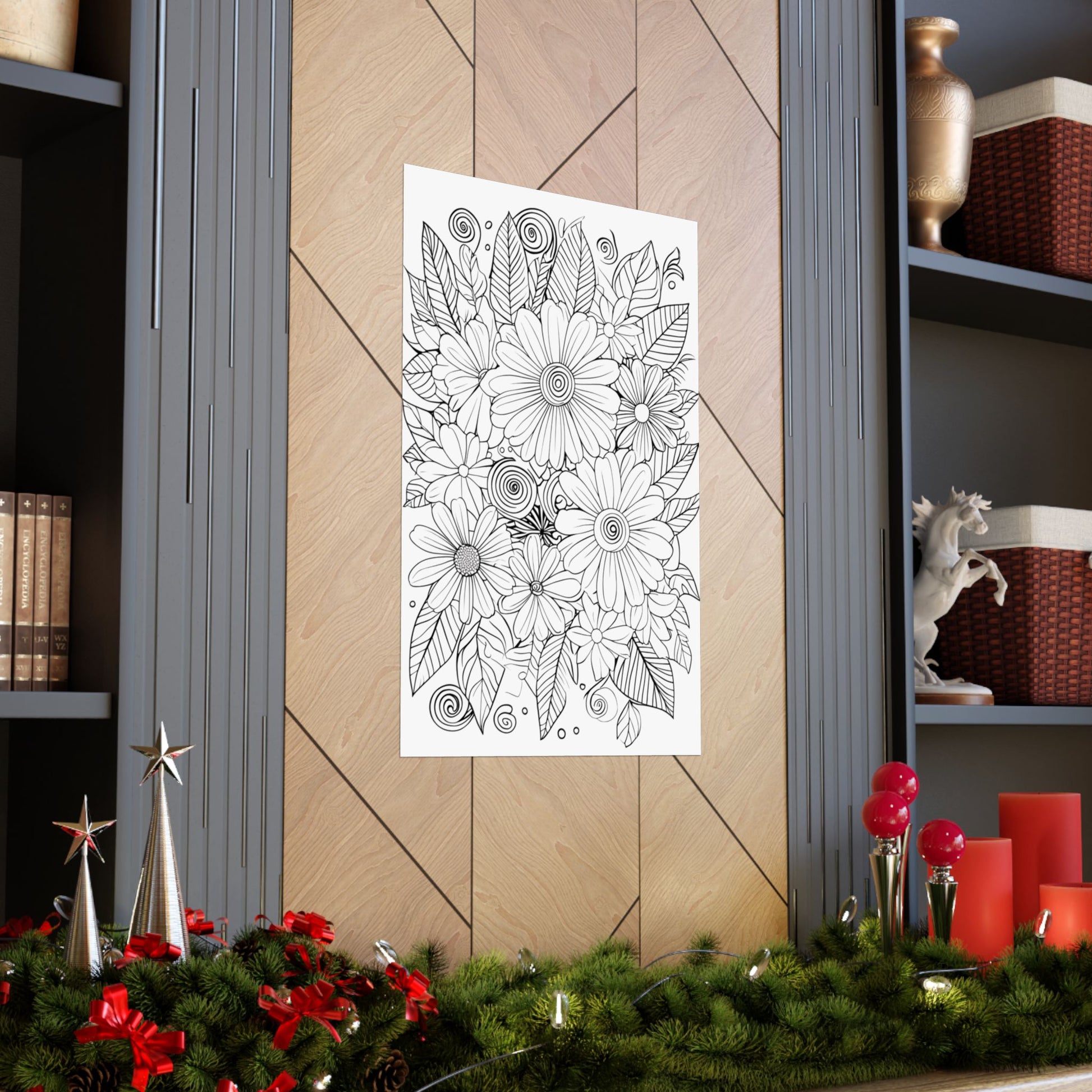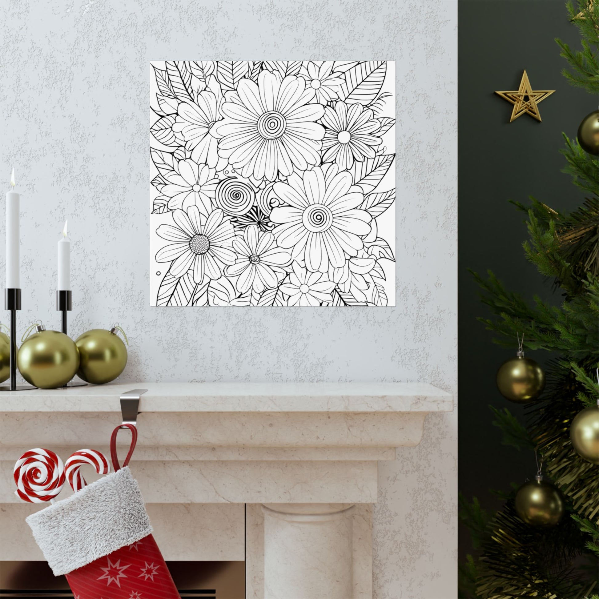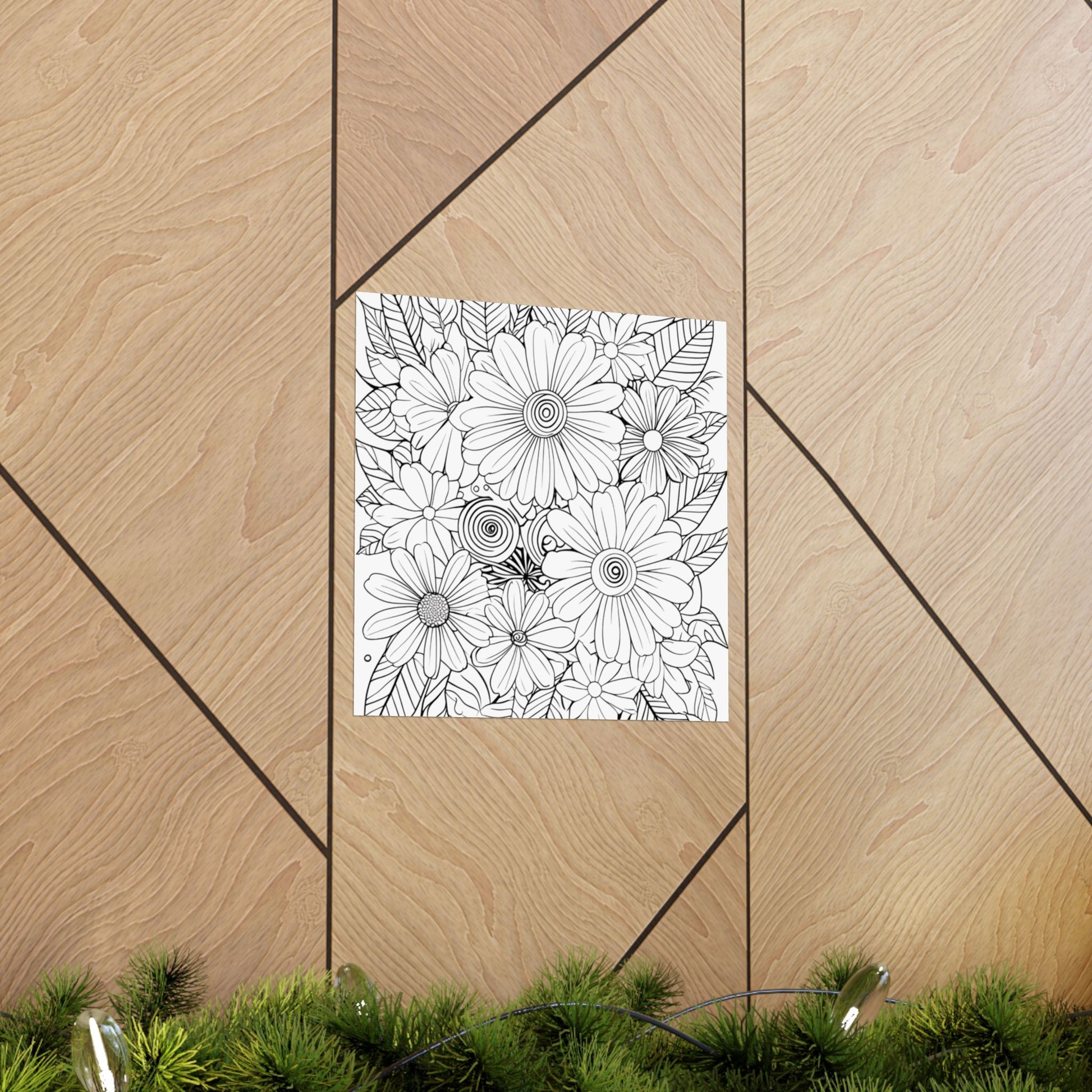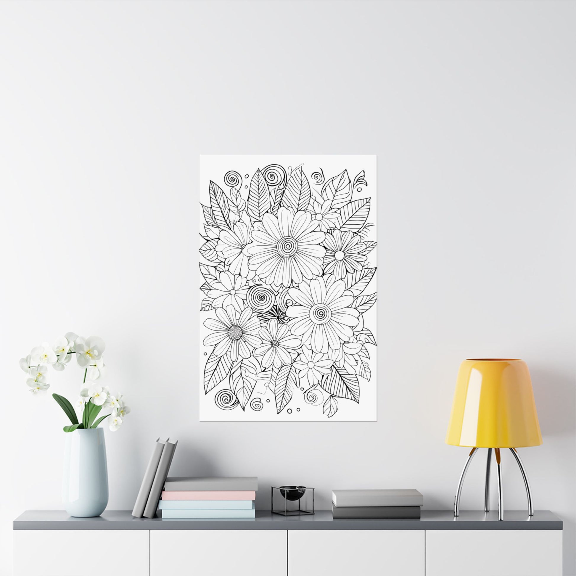 Hand-drawn blossoms and layered leaves fill the page in this matte vertical poster, waiting for color or standing beautifully as a monochrome statement. The fine-line floral composition brings a calm, meditative energy — like a quiet afternoon in a sunlit garden where you can slow down and notice the small details. Hung in a studio, reading nook, or hallway, it invites close-up moments: tracing petals with a fingertip, imagining palettes, or simply enjoying the rhythm of repeating shapes. The archival, museum-grade paper and giclée printing keep those delicate lines crisp and the blacks deep, so the artwork maintains its presence without glare thanks to the soft matte finish. Available in many sizes for framed or unframed displays, this poster is made for indoor spaces that value subtlety, craftsmanship, and a gentle, botanical mood.