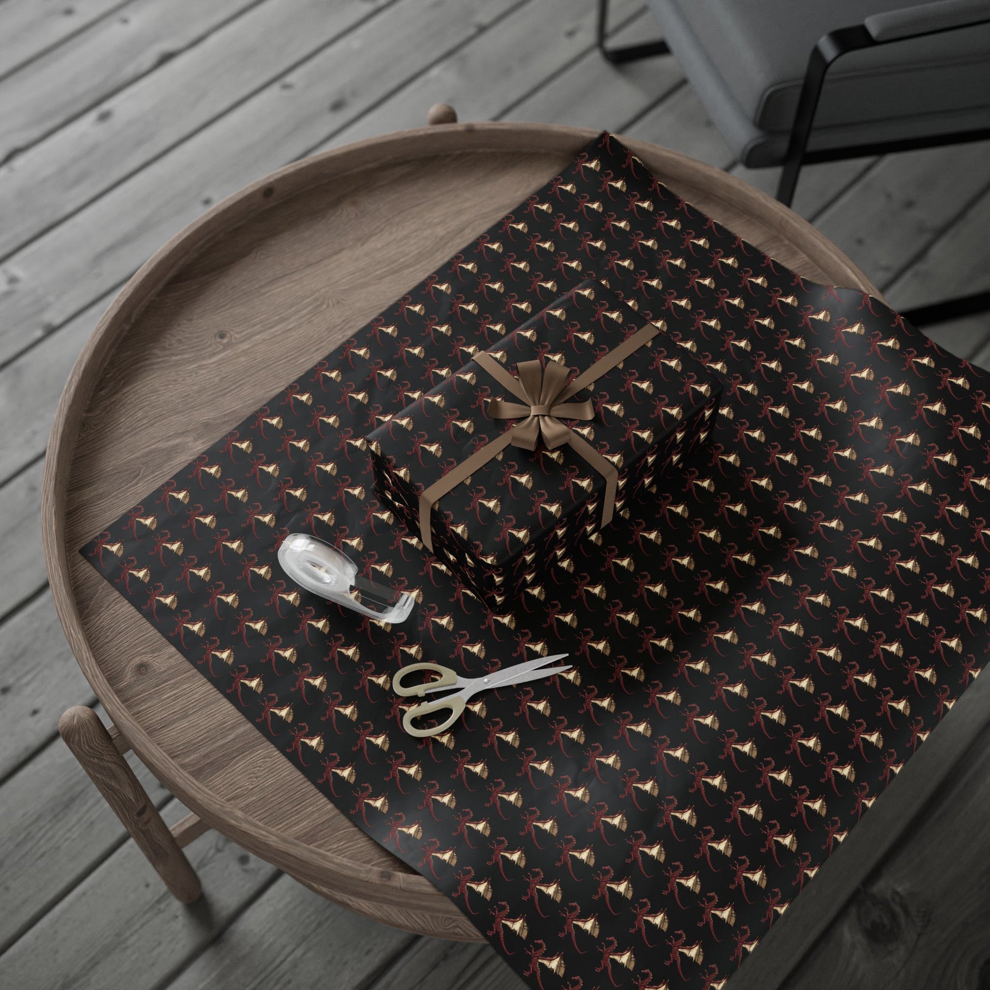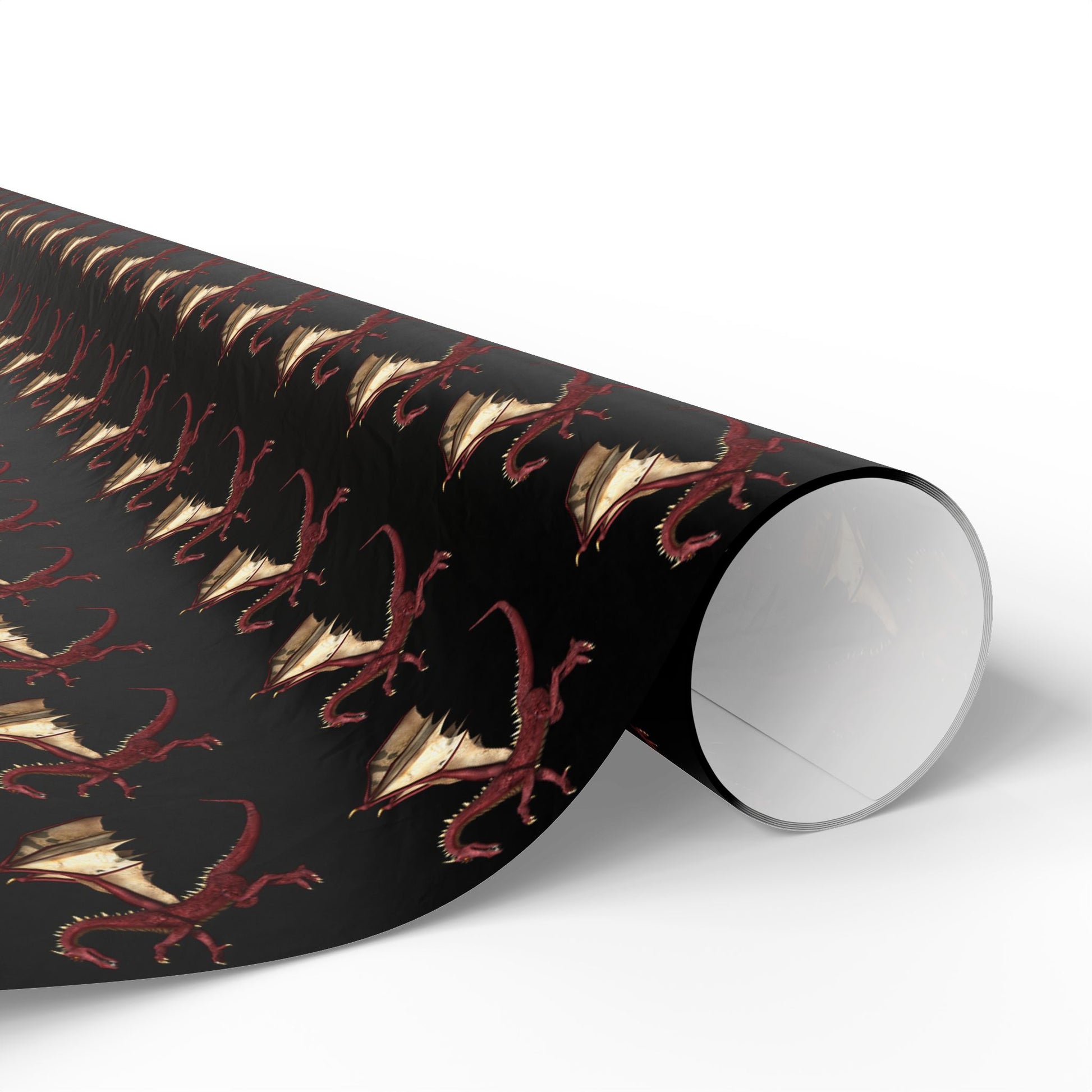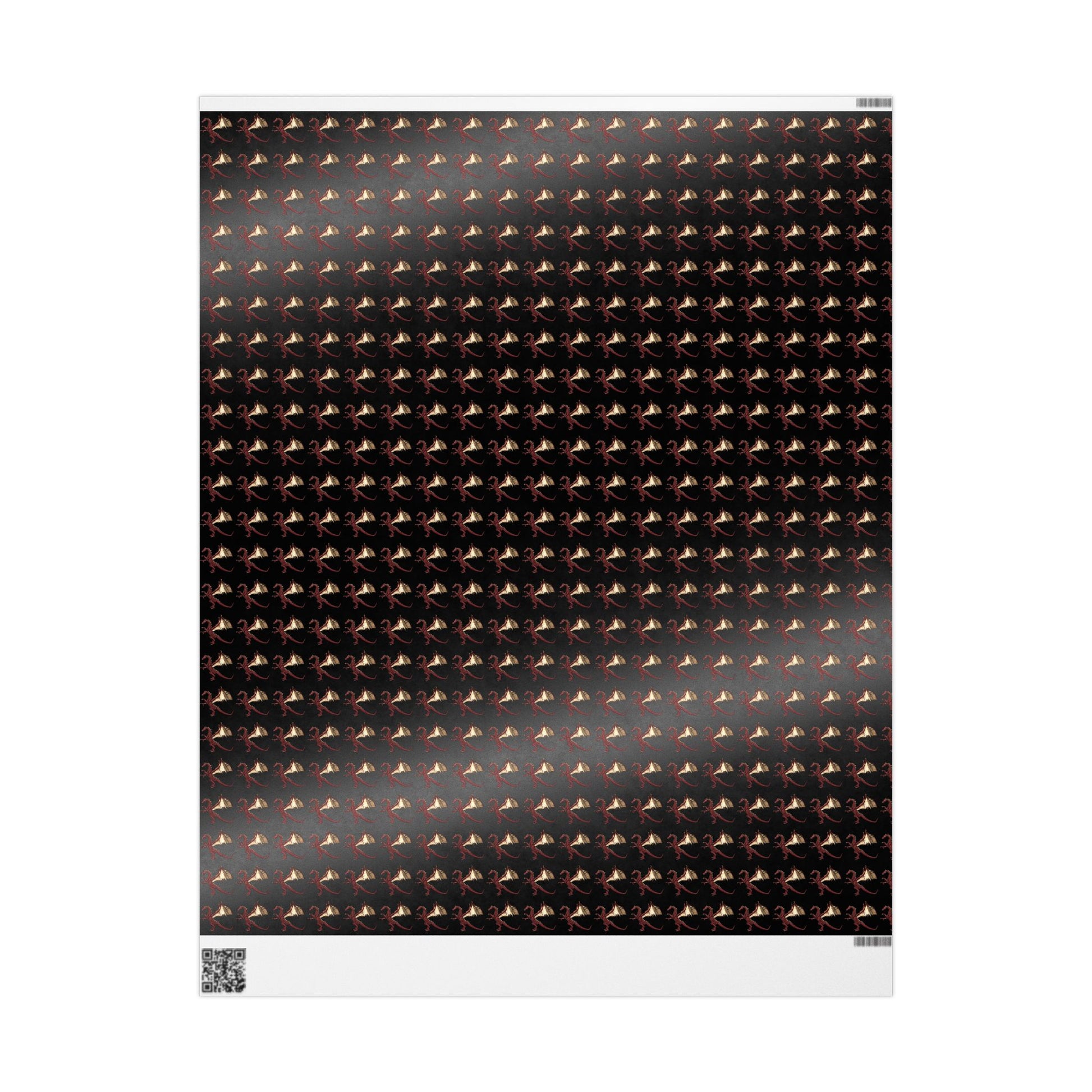 This artful roll of wrapping paper brings dark, dramatic flair to gift-giving. Printed on 90gsm fine art paper in either a glossy or smooth matte finish, the one-sided design features a repeating pattern of stylized motifs on a deep black background, creating a moody, elegant look. Available in three generous lengths, the paper wraps large and small presents with a couture feel while the high-definition print keeps every detail crisp. Subtle white trim with a barcode and QR code appears at the roll edges as noted.