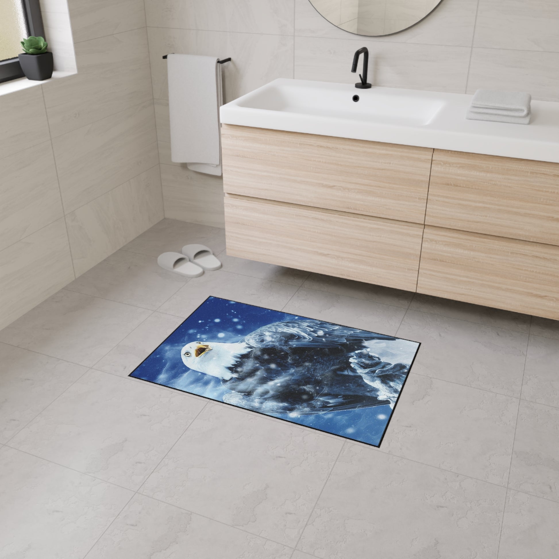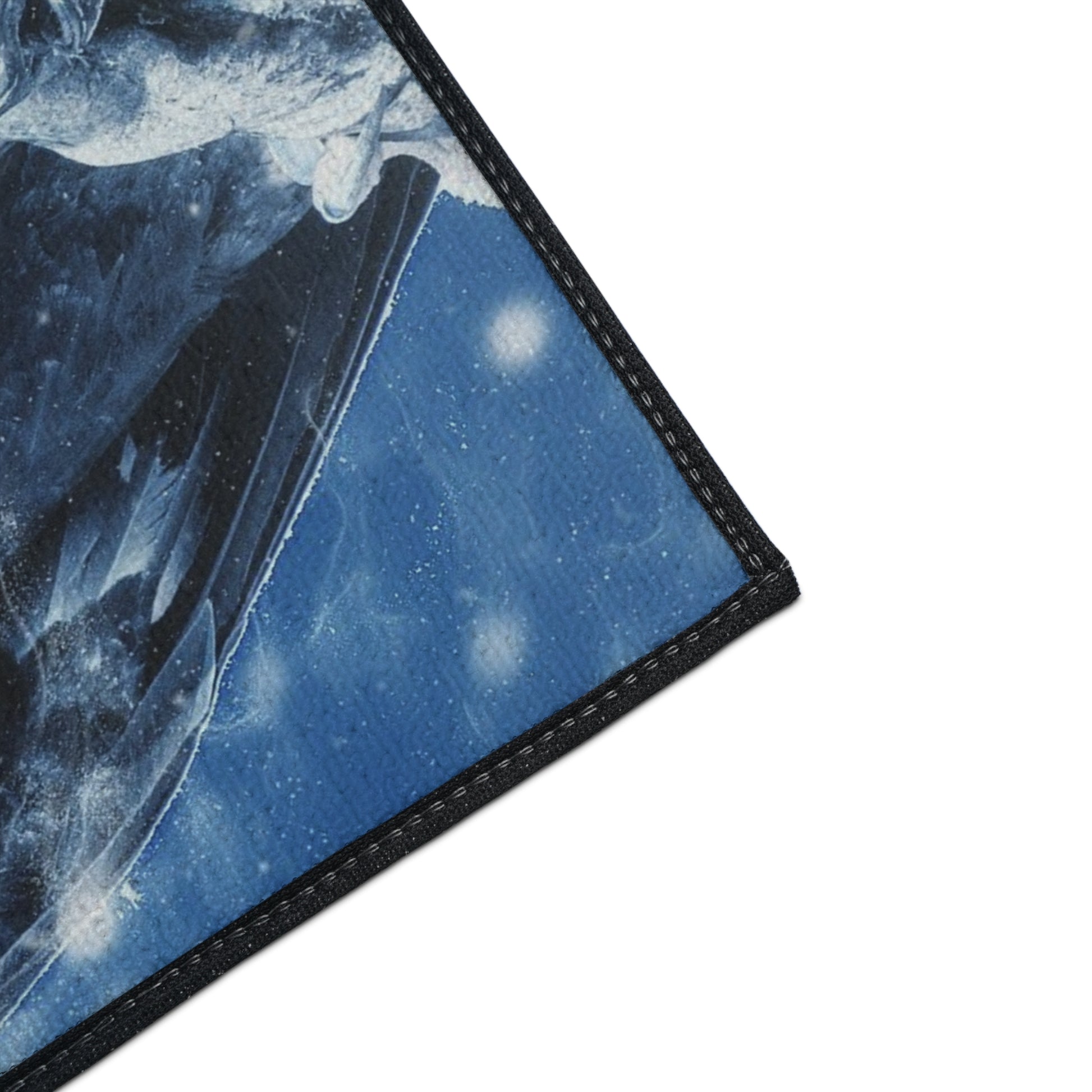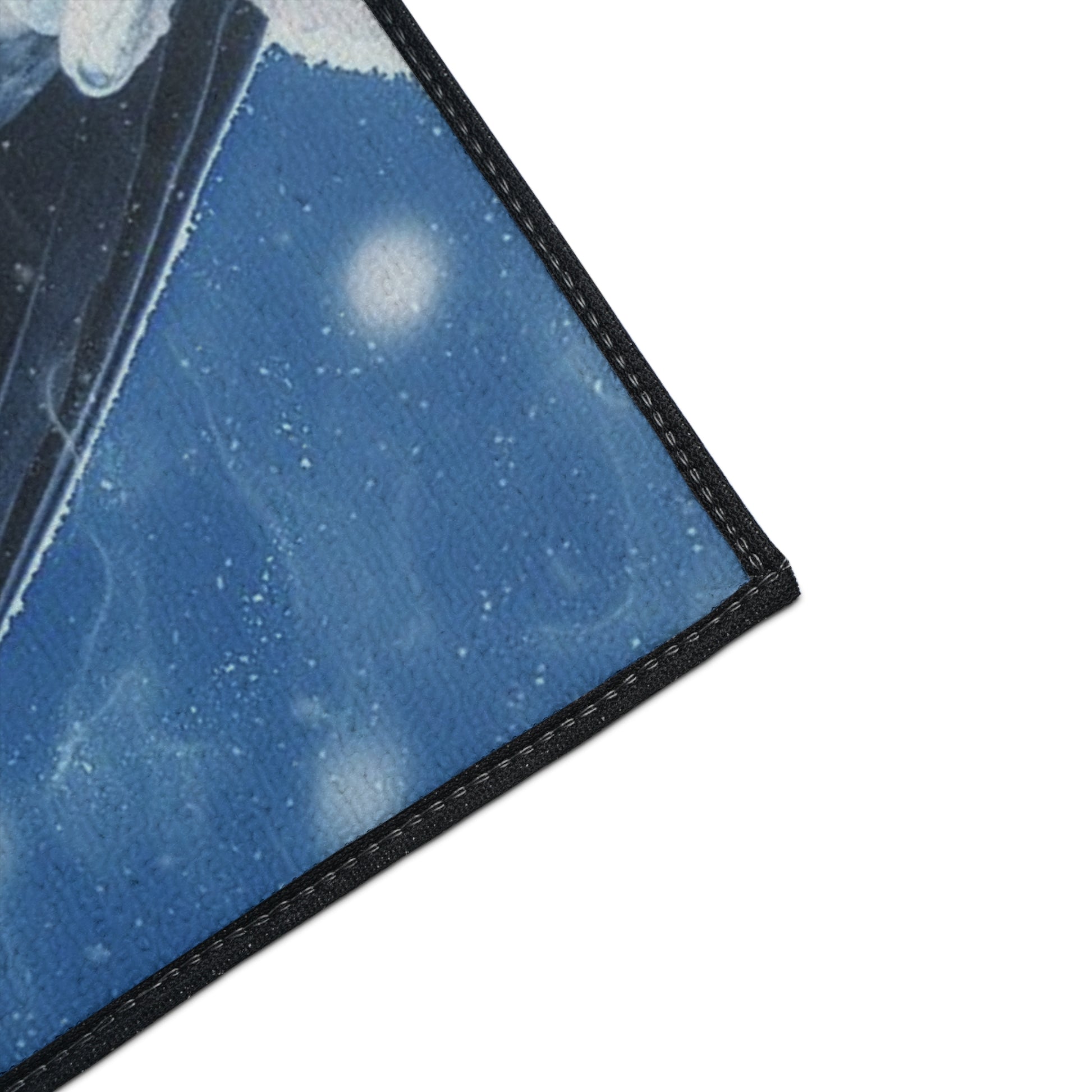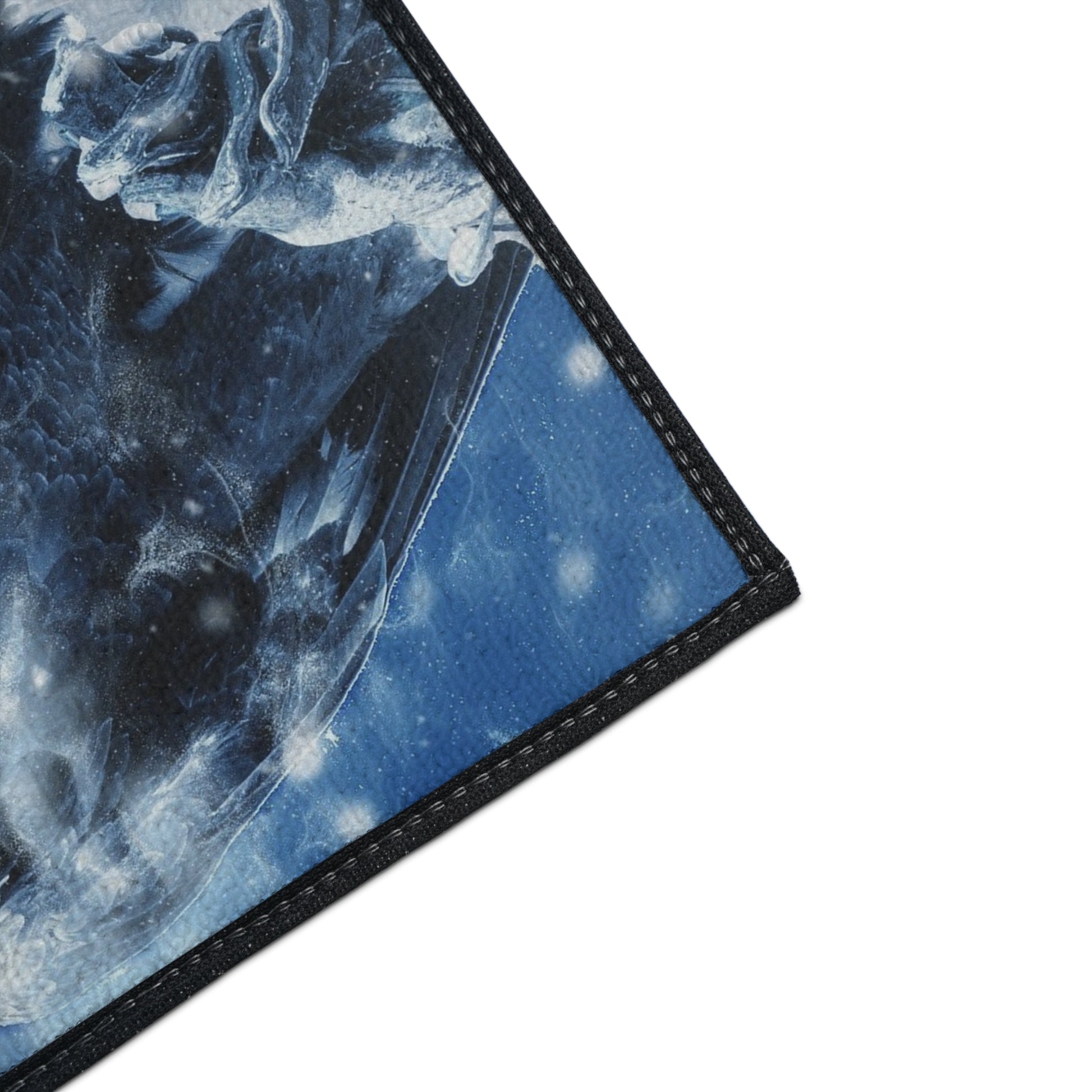 A rugged floor mat that brings bold wildlife art into everyday spaces. The striking eagle design swims through deep blues and snowy flurries, creating a quiet, powerful energy underfoot. It’s built to handle busy entryways or workshop floors — the polyester face holds vivid color while the rubber base stays put. Lay it where you come in from the cold or where you pause to lace boots; it roots a room with movement and calm at once.