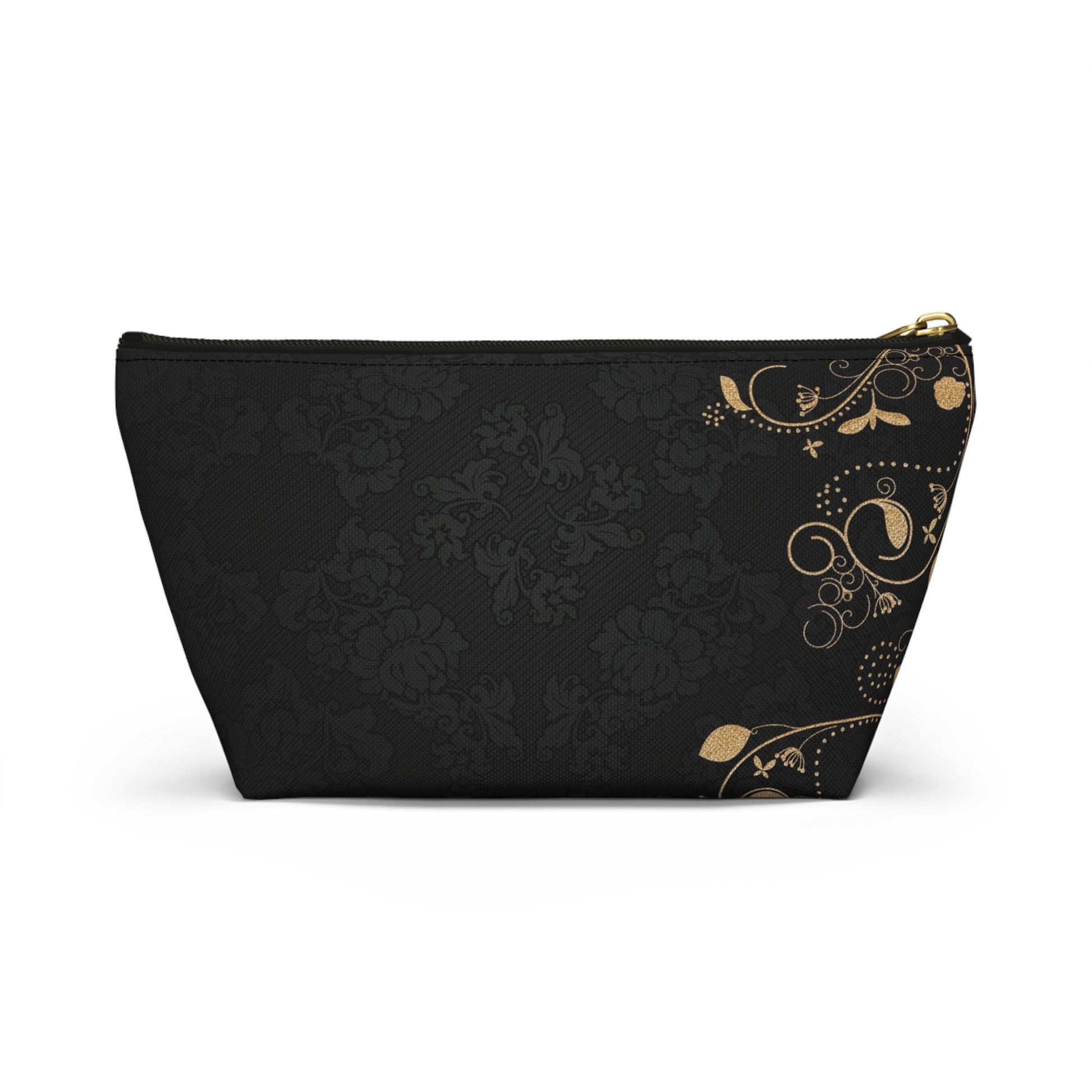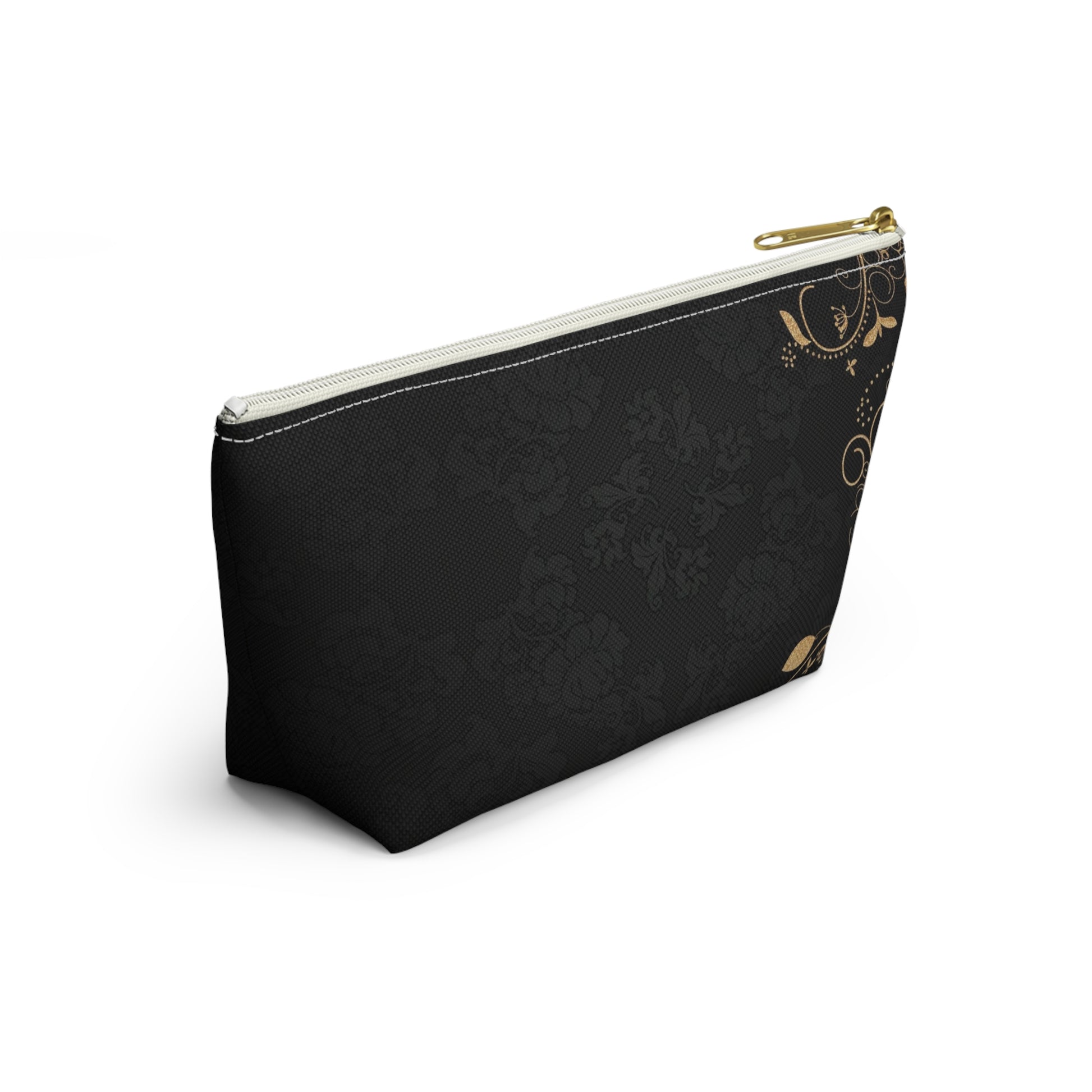 Softly structured and quietly elegant, this accessory pouch brings a touch of vintage glamour to everyday carry. The deep black background carries a subtle damask texture while delicate gold filigree curls along the edges, like a whisper of old-world jewelry. The T-bottom gives the pouch a steady base so bottles, brushes, and small tools stand upright. It slips easily into larger bags or sits on a vanity without tipping over. Use it to organize makeup, pens, travel essentials, or keepsakes — it makes routine moments feel considered and a little luxurious.