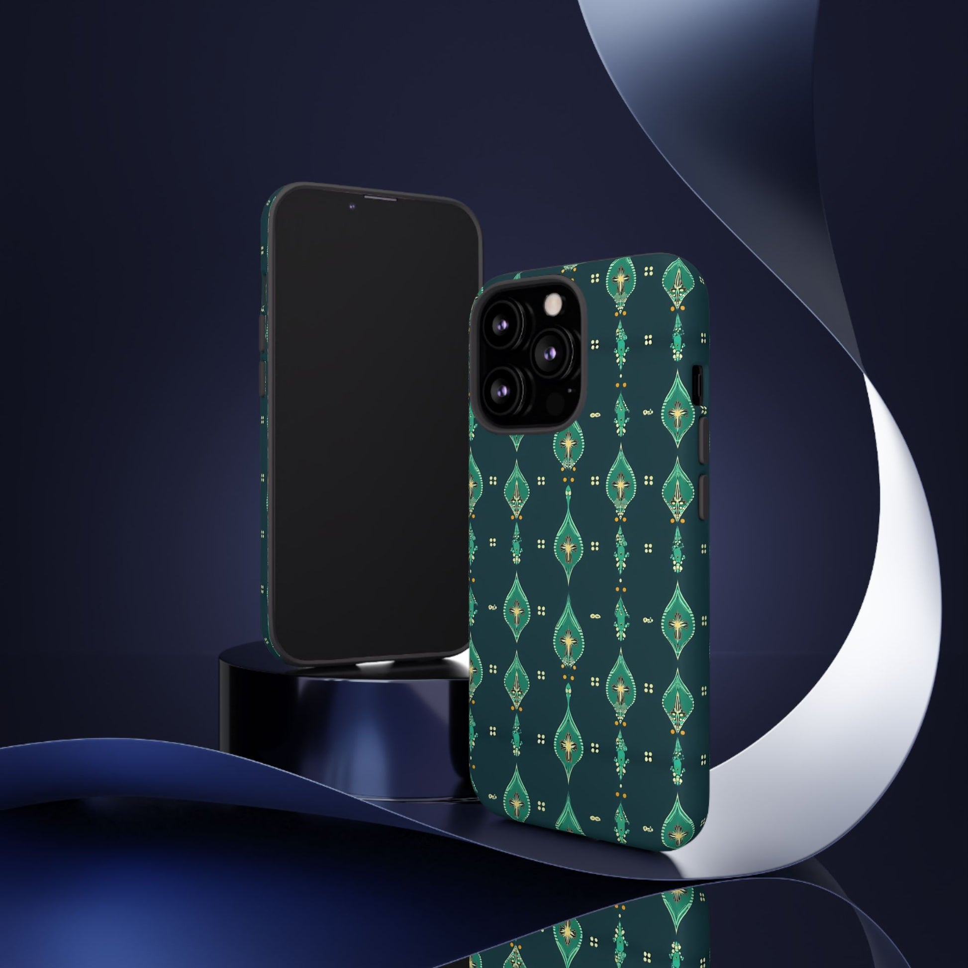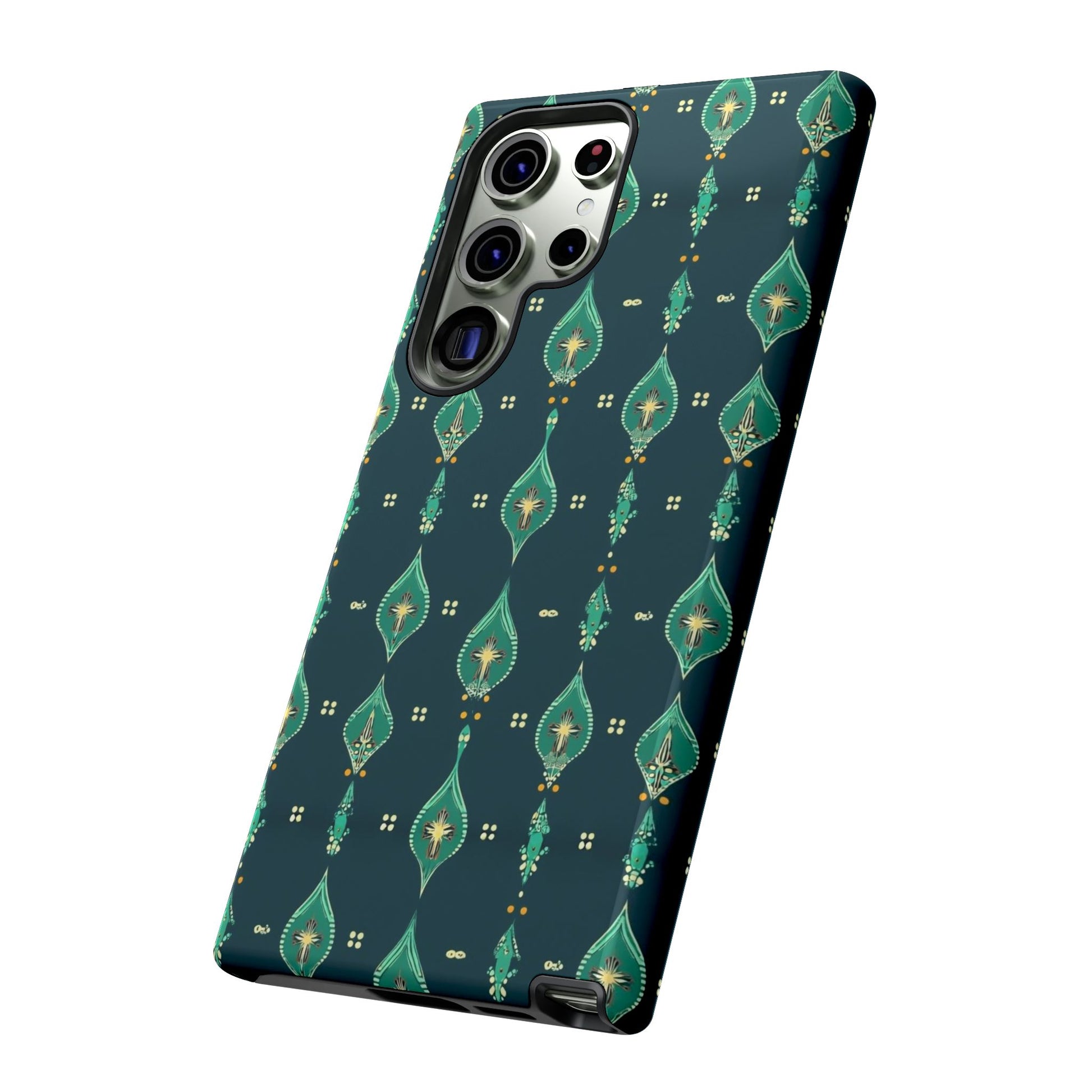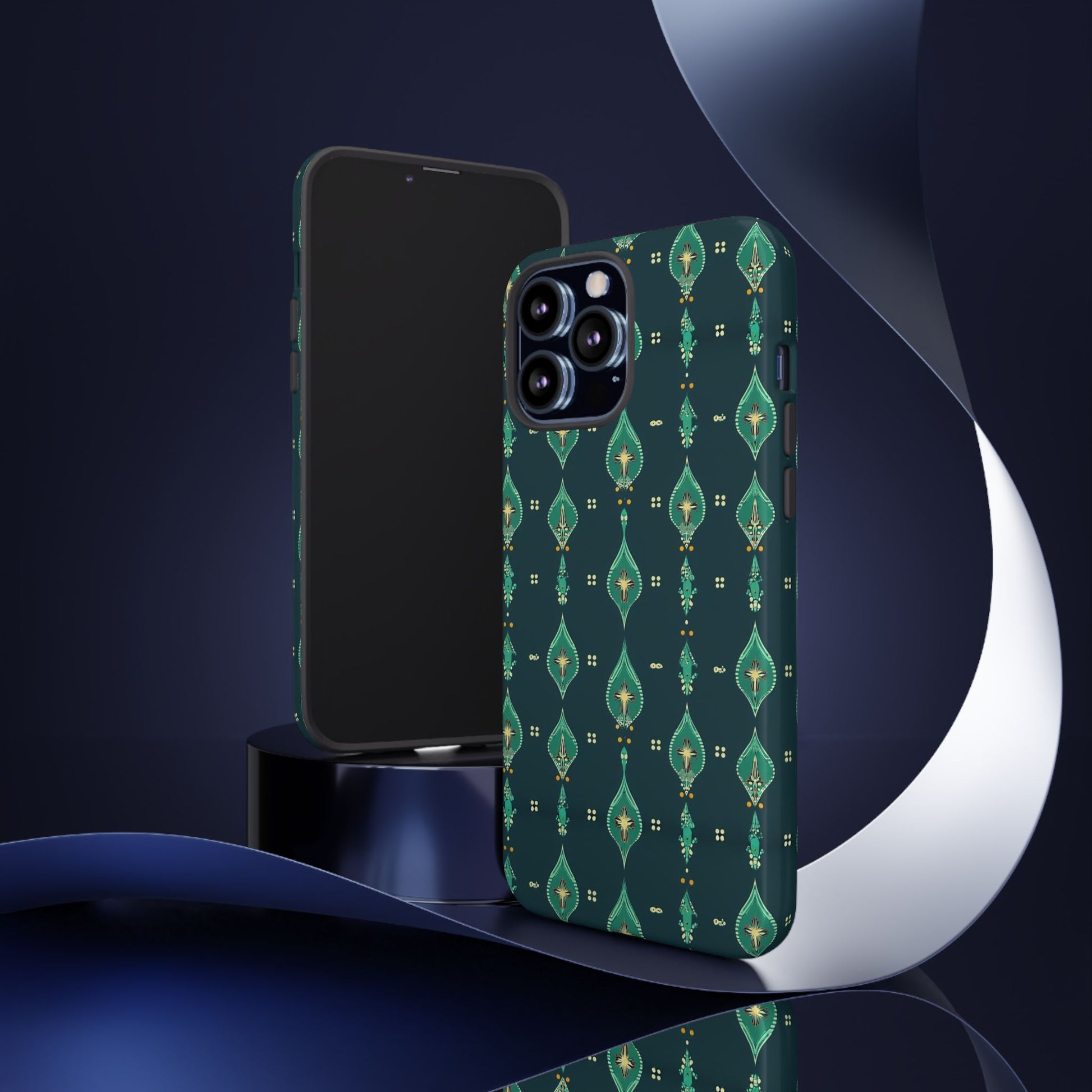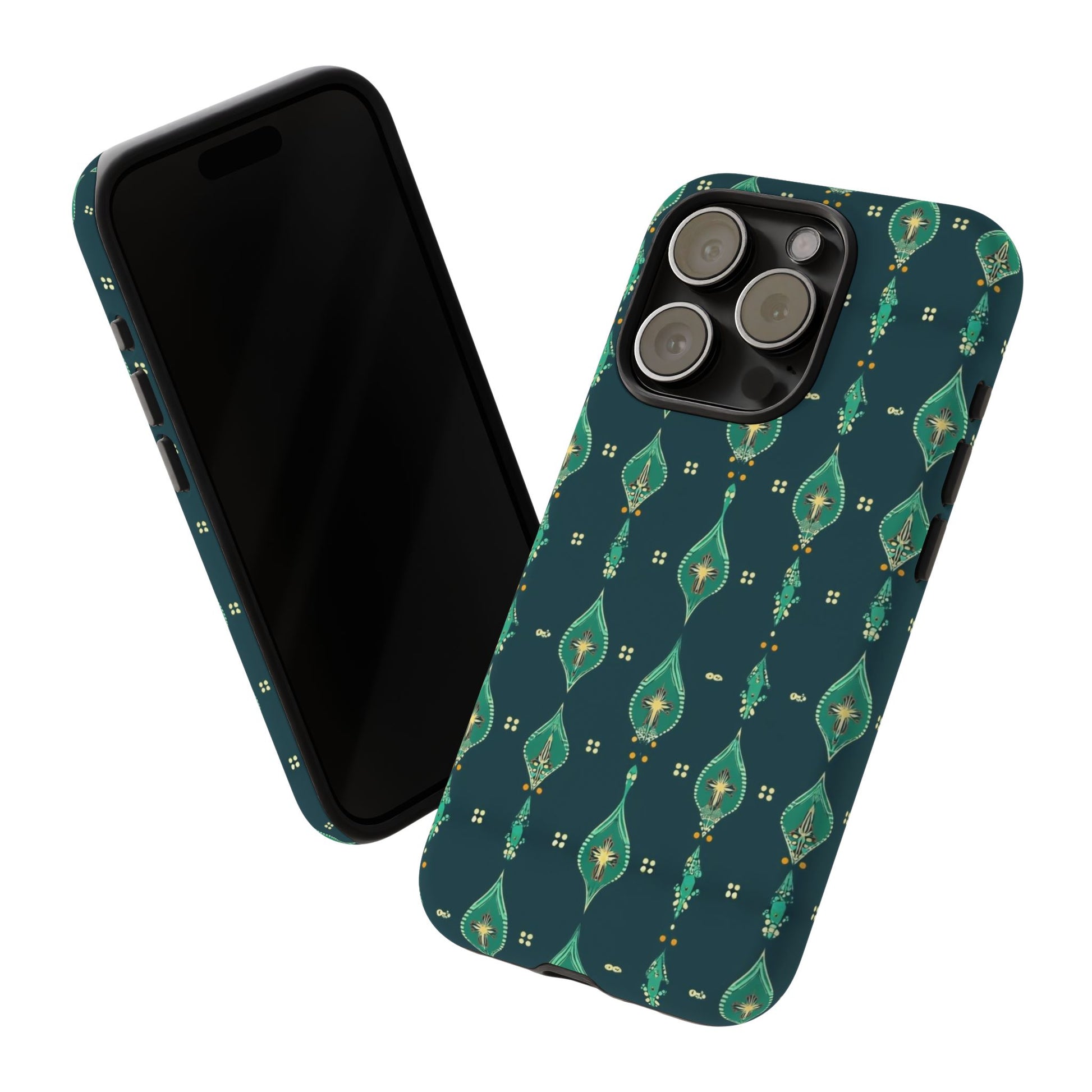 Slip this tough case onto your phone and feel the calm confidence of a device built to handle the day. The jewel-toned, repeating teardrop pattern sits on a deep teal field—subtle, elegant, slightly vintage—so your phone reads as thoughtful design instead of loud branding. Dual-layer construction (rigid polycarbonate shell with a soft TPU silicone liner) absorbs shocks and resists drops while a full-wrap print keeps the pattern seamless around edges. The glossy or matte finish options hold rich color and the UV-protected surface helps keep the artwork vivid through outdoor use. Clear port openings and wireless-charging compatibility make it practical for everyday carry. Lightweight, durable, and designed for adults who want protection that looks like style.