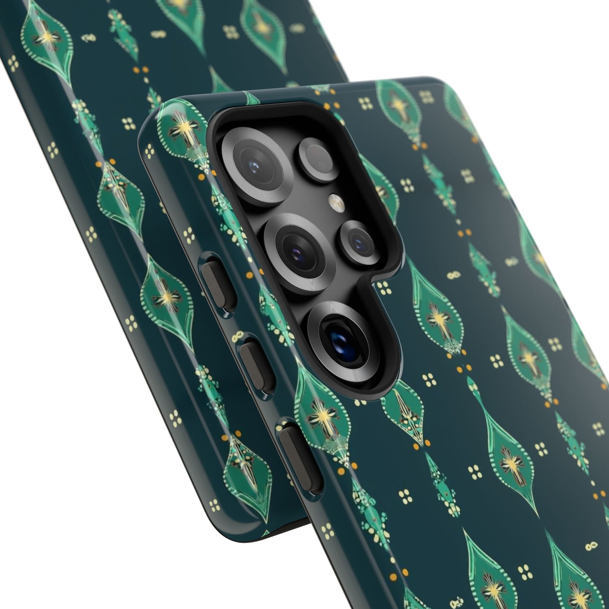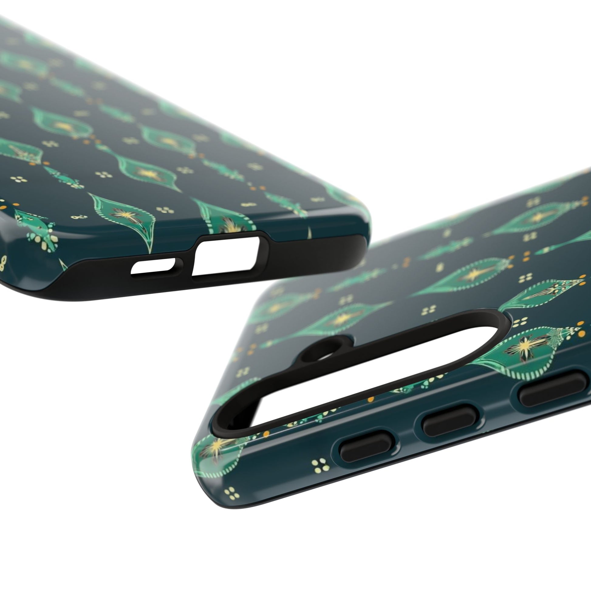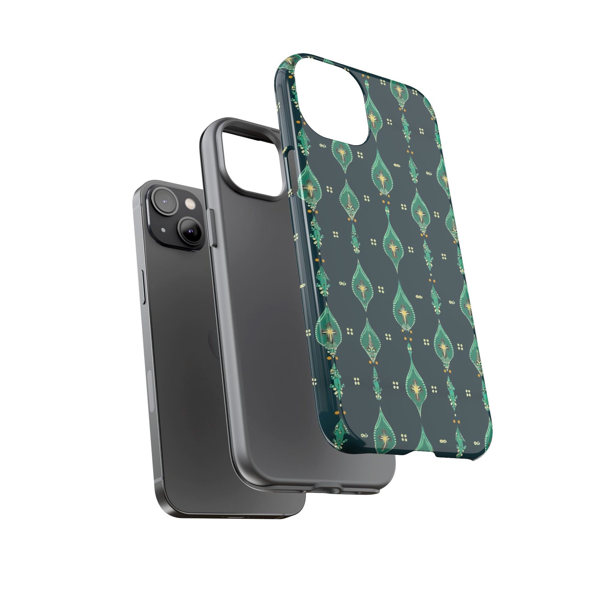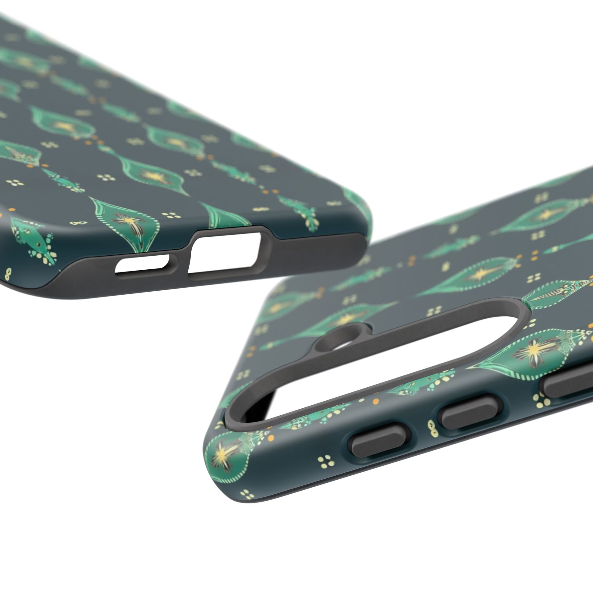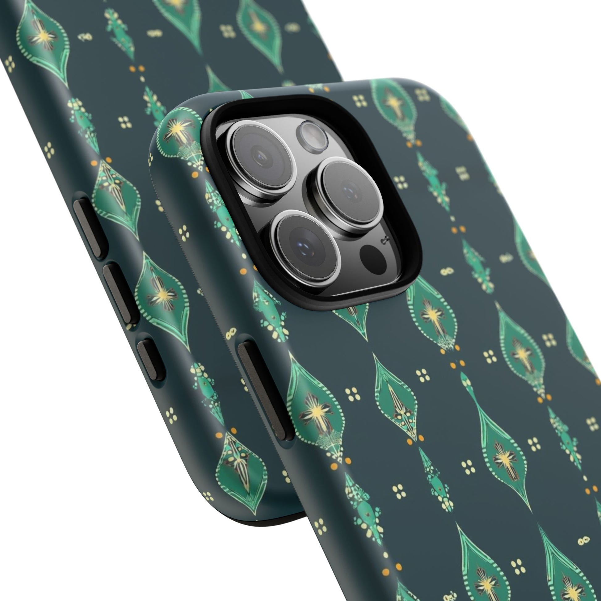 Slip this tough case onto your phone and feel the calm confidence of a device built to handle the day. The jewel-toned, repeating teardrop pattern sits on a deep teal field—subtle, elegant, slightly vintage—so your phone reads as thoughtful design instead of loud branding. Dual-layer construction (rigid polycarbonate shell with a soft TPU silicone liner) absorbs shocks and resists drops while a full-wrap print keeps the pattern seamless around edges. The glossy or matte finish options hold rich color and the UV-protected surface helps keep the artwork vivid through outdoor use. Clear port openings and wireless-charging compatibility make it practical for everyday carry. Lightweight, durable, and designed for adults who want protection that looks like style.