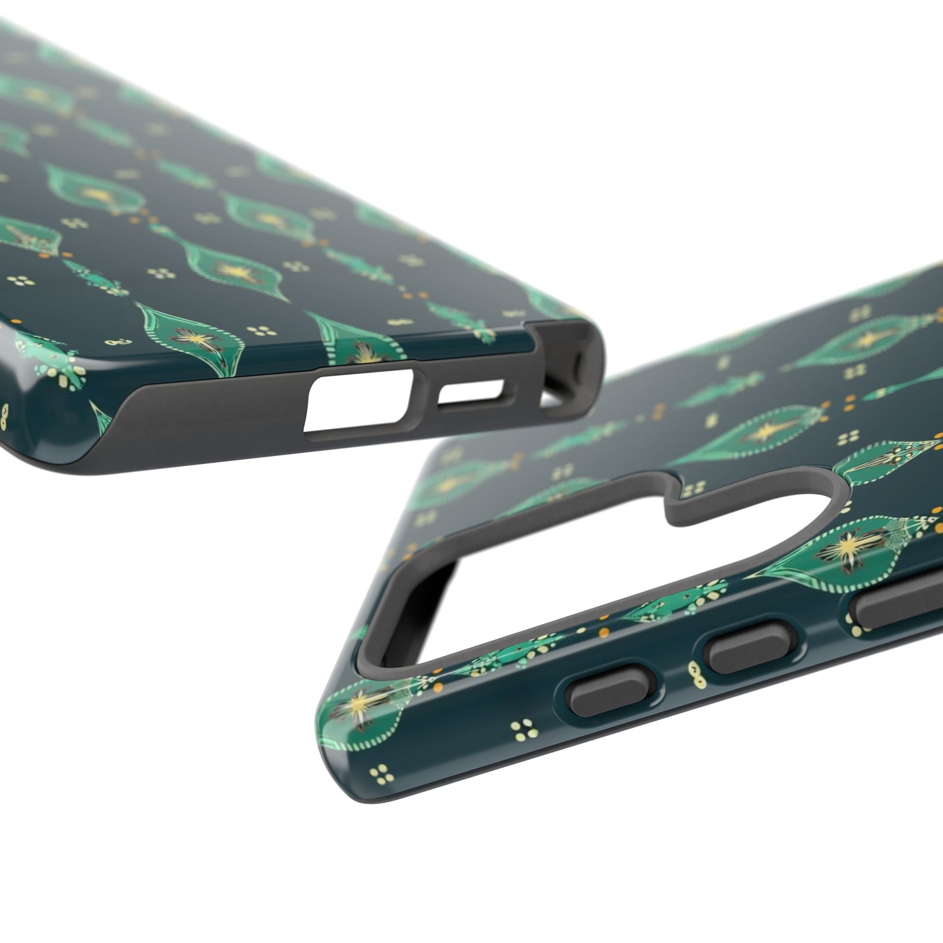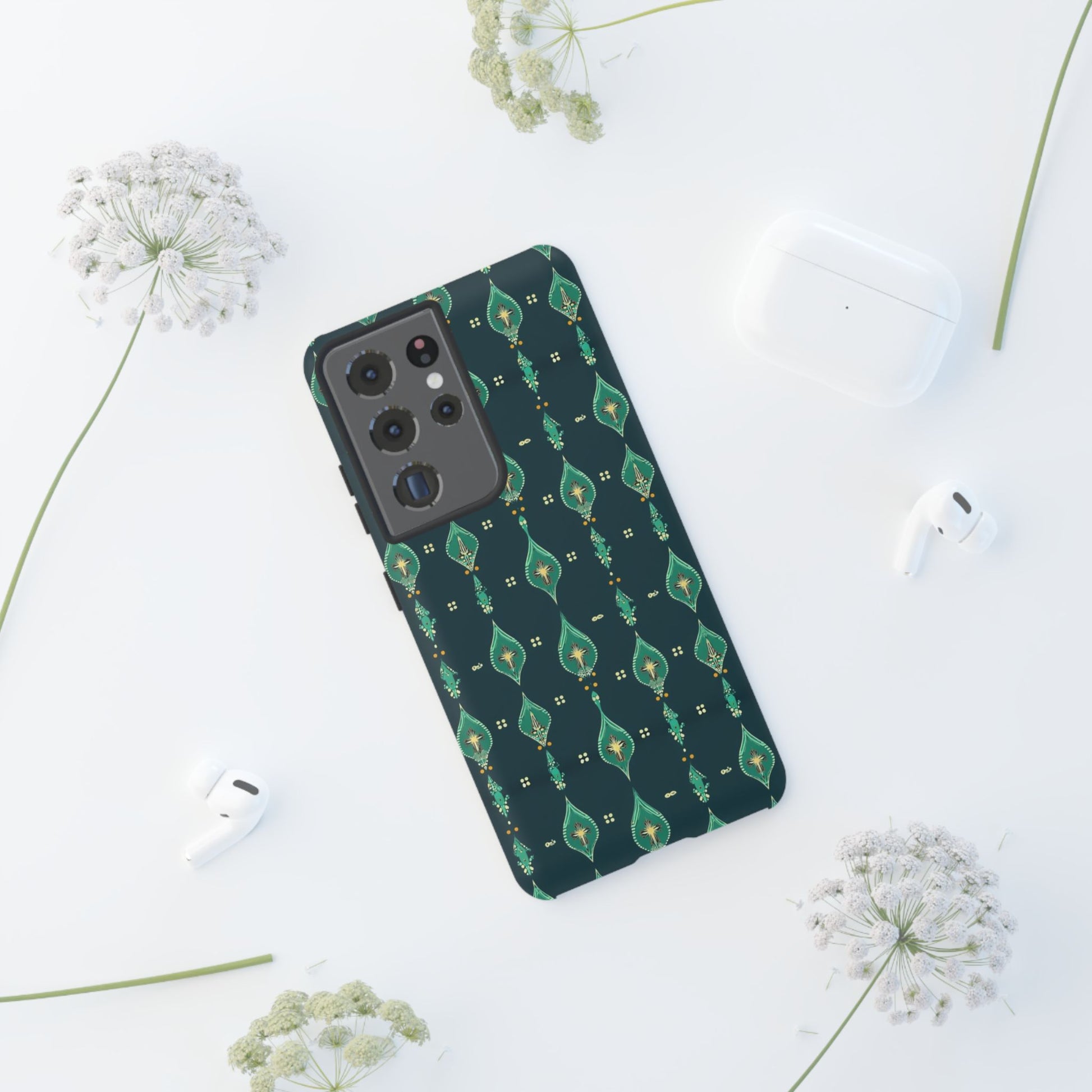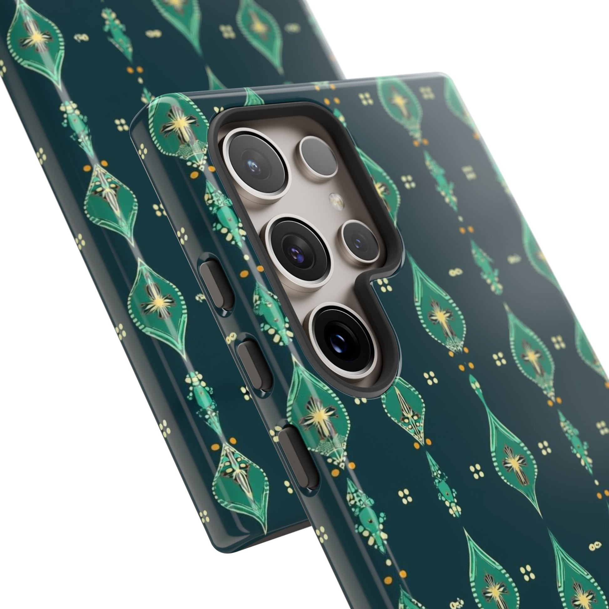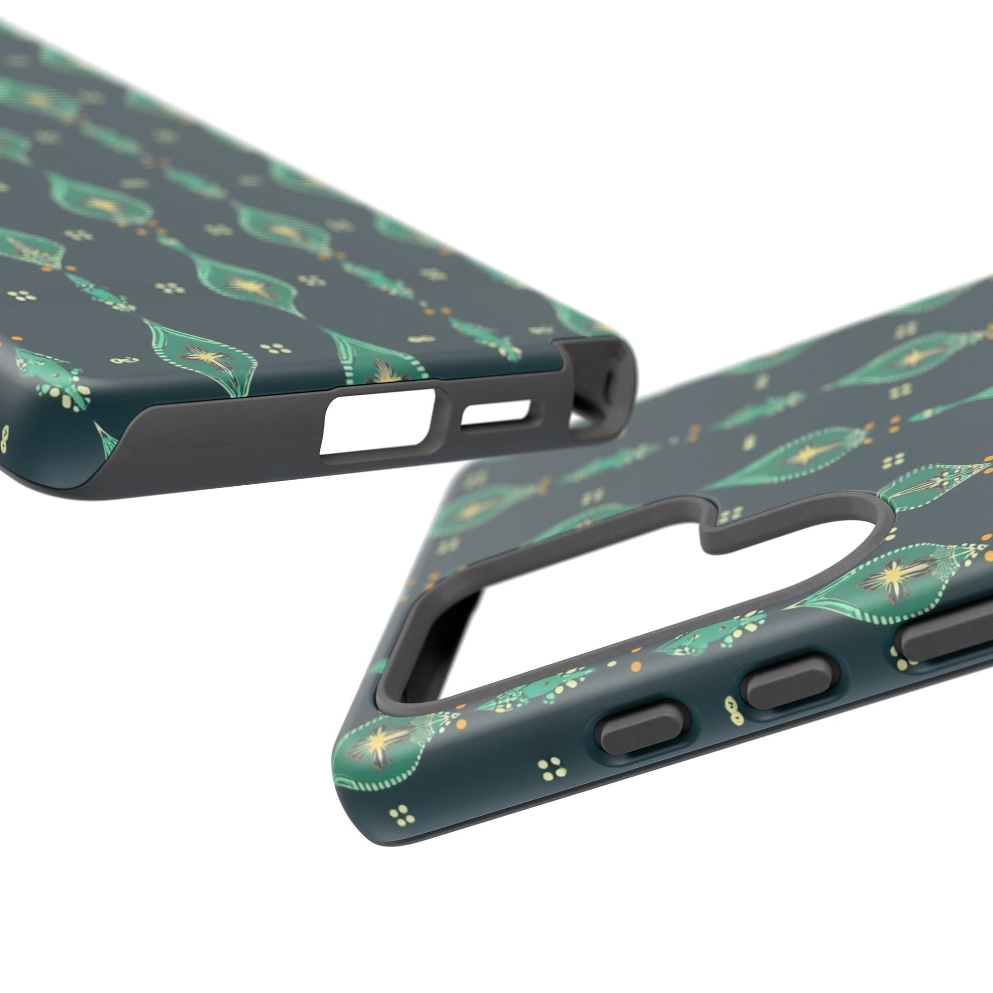 Slip this tough case onto your phone and feel the calm confidence of a device built to handle the day. The jewel-toned, repeating teardrop pattern sits on a deep teal field—subtle, elegant, slightly vintage—so your phone reads as thoughtful design instead of loud branding. Dual-layer construction (rigid polycarbonate shell with a soft TPU silicone liner) absorbs shocks and resists drops while a full-wrap print keeps the pattern seamless around edges. The glossy or matte finish options hold rich color and the UV-protected surface helps keep the artwork vivid through outdoor use. Clear port openings and wireless-charging compatibility make it practical for everyday carry. Lightweight, durable, and designed for adults who want protection that looks like style.
