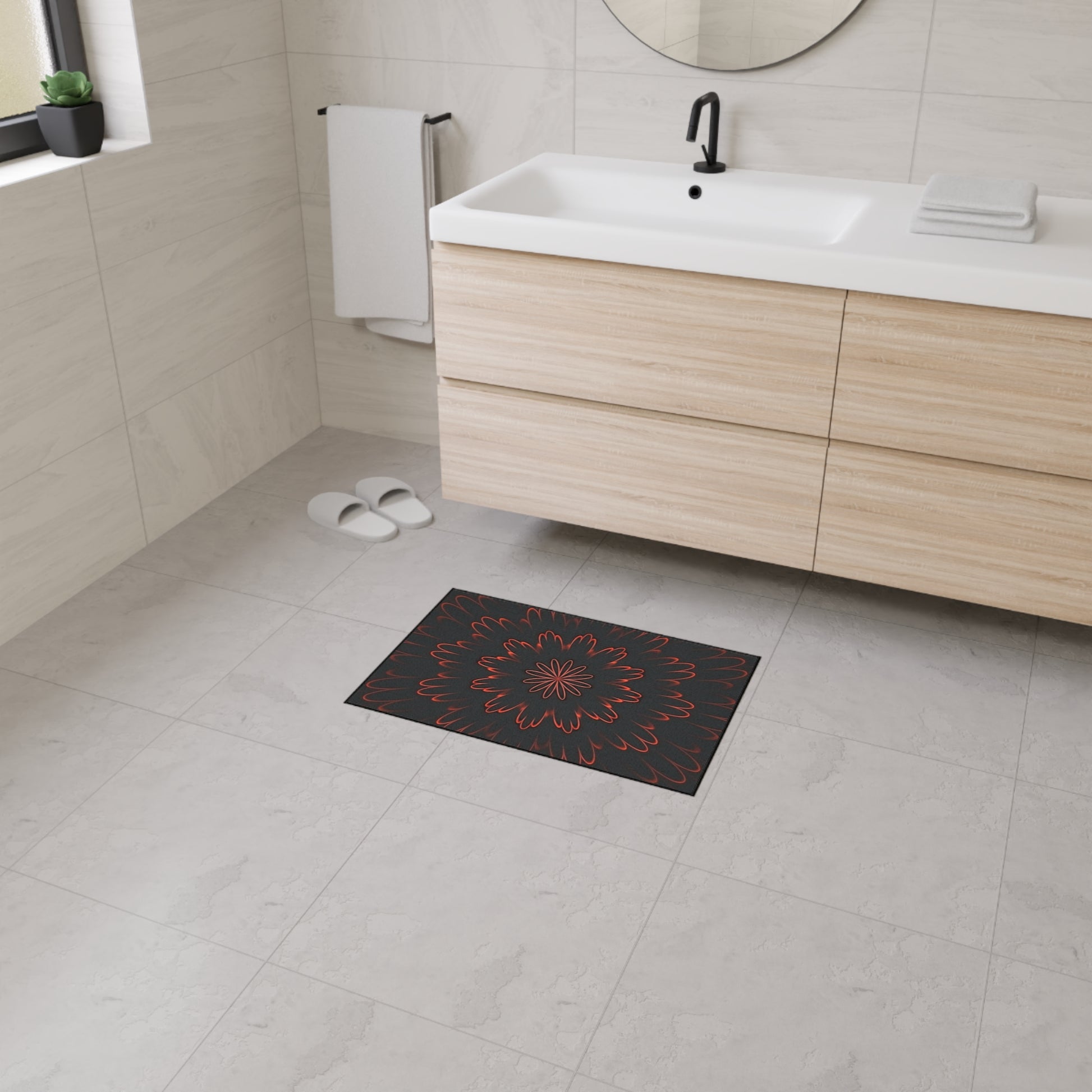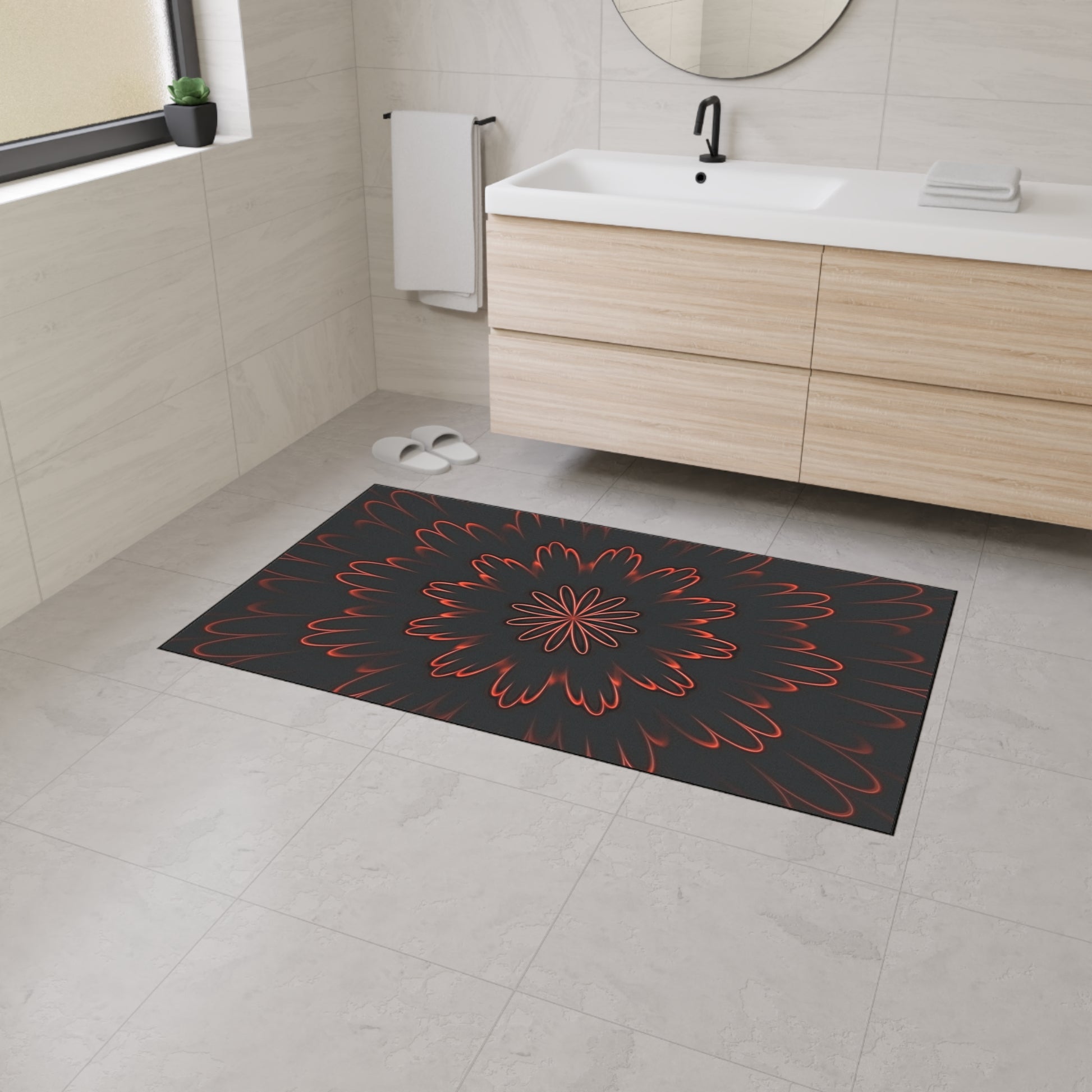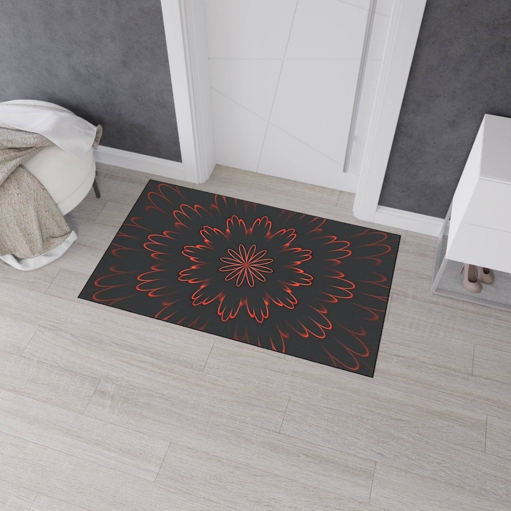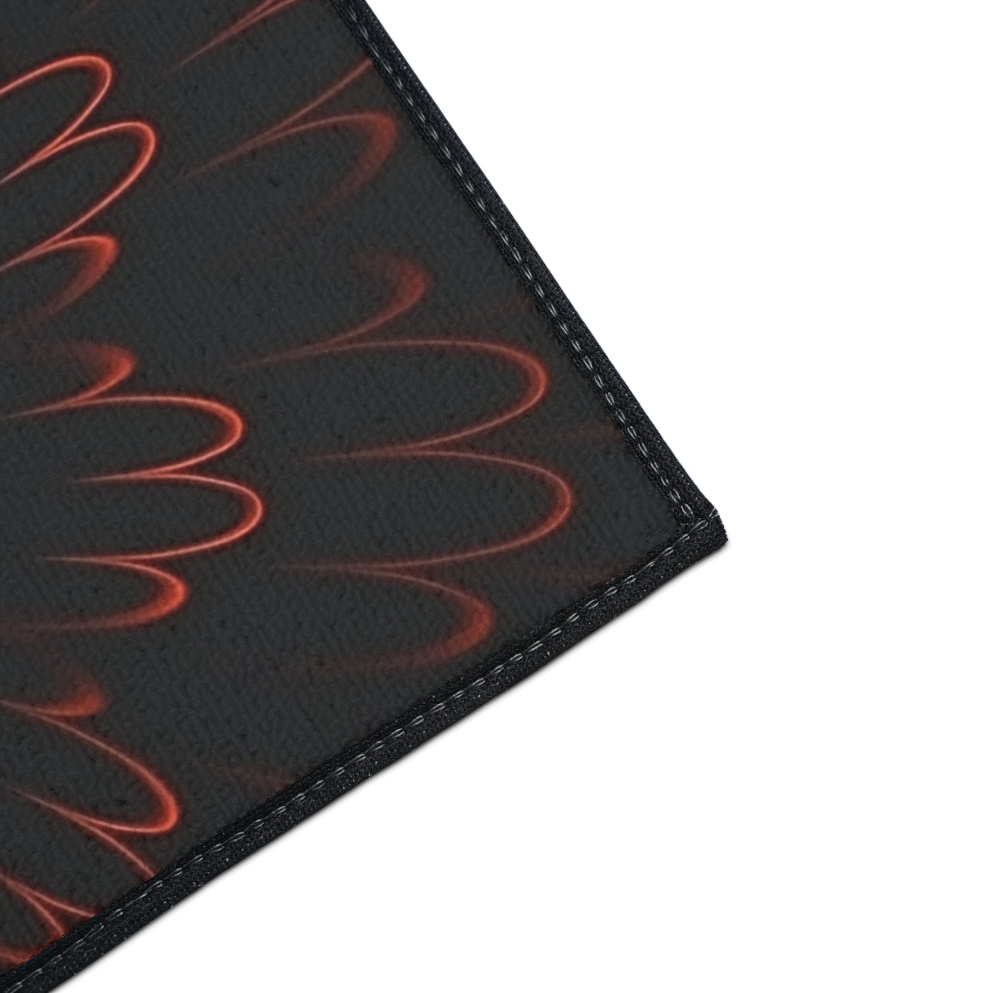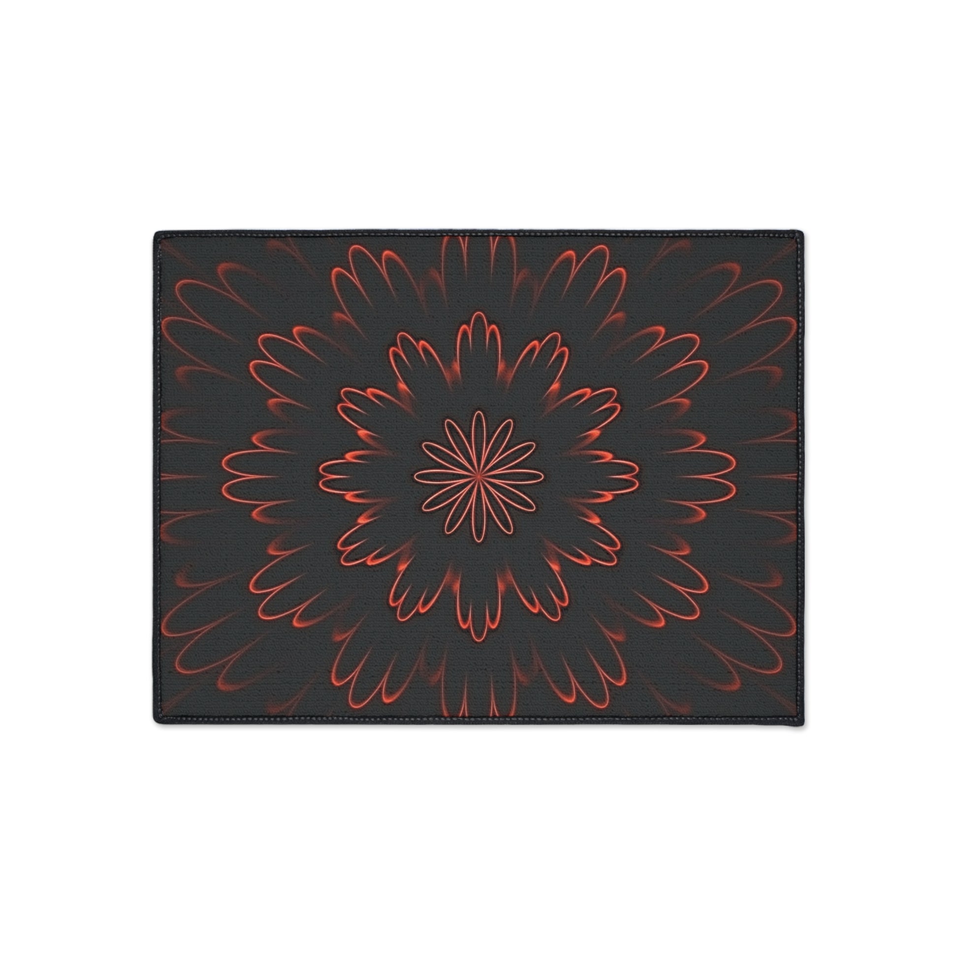 Lay down warmth and bold style with this heavy-duty floor mat. A dark, smoky backdrop frames a fiery, petal-like mandala that seems to glow from within—subtle unless you’re up close, where the red accents pulse against charcoal depths. The low-profile mat stays put with a non-slip rubber backing and holds up to daily foot traffic thanks to a durable polyester surface and reinforced black trim. It’s the kind of piece that grounds an entryway, anchors a studio corner, or brings moody contrast to a modern living space—quietly striking, built to last, and assembled in the USA.