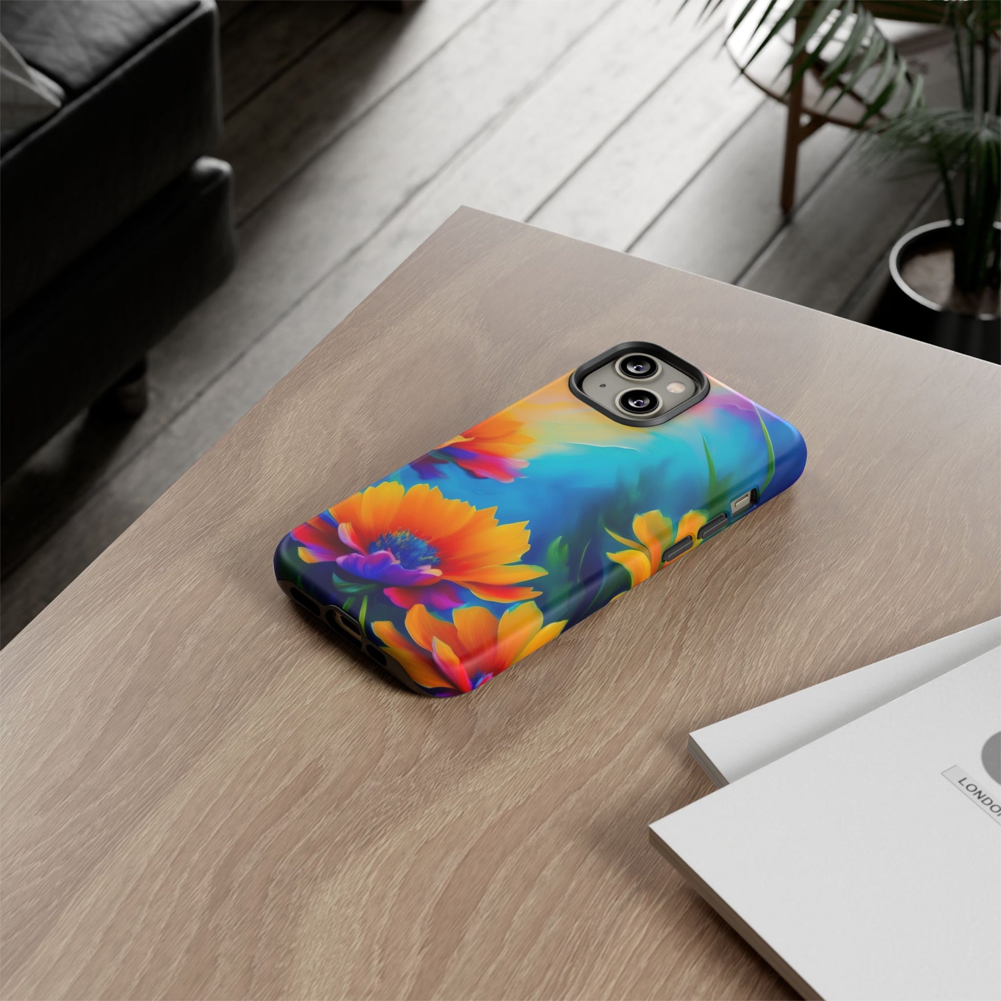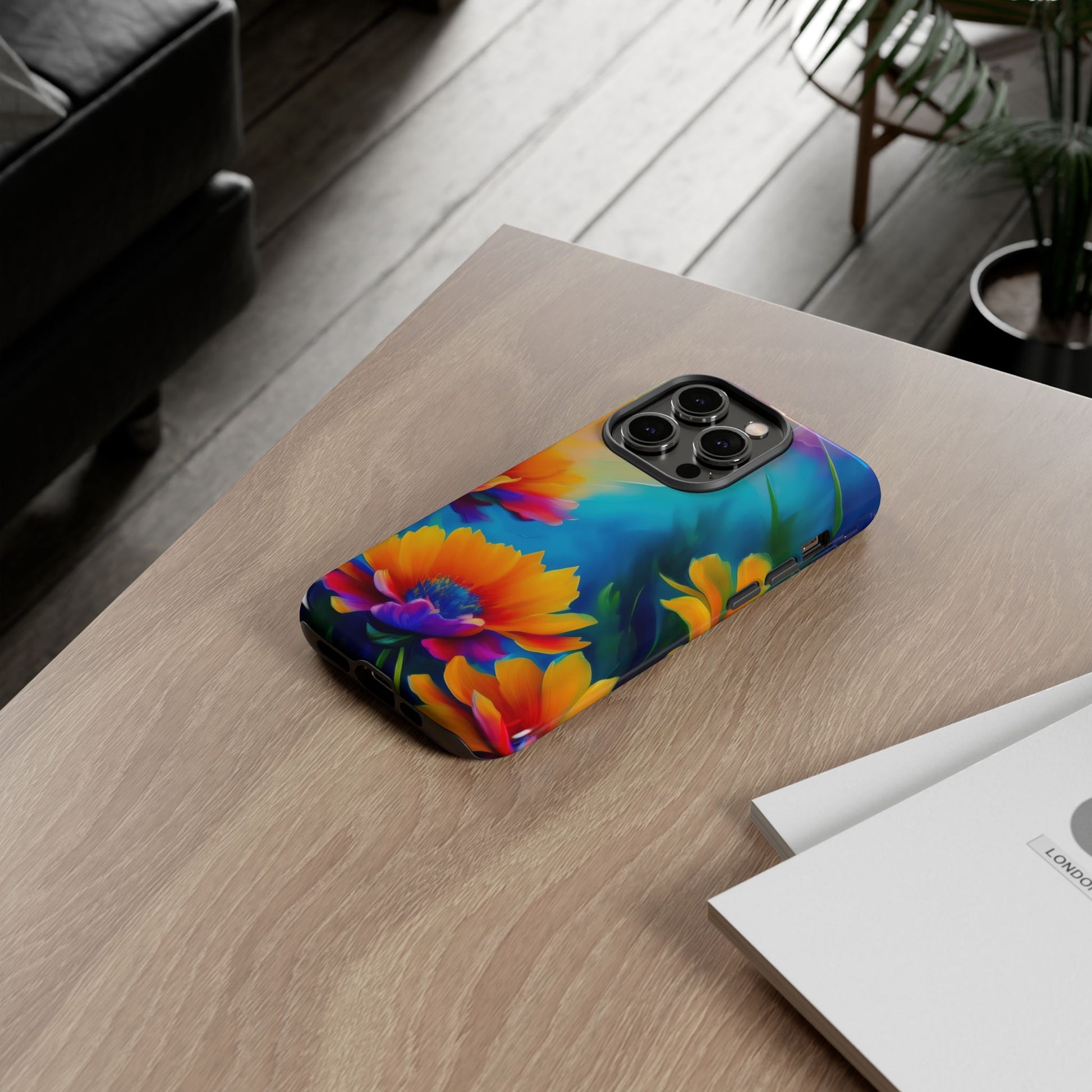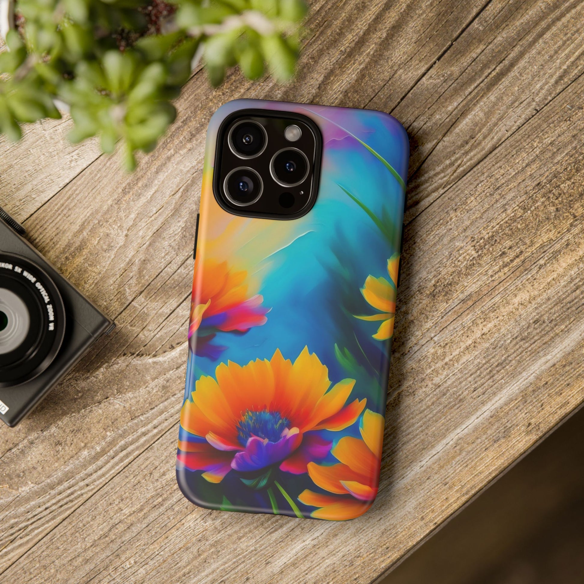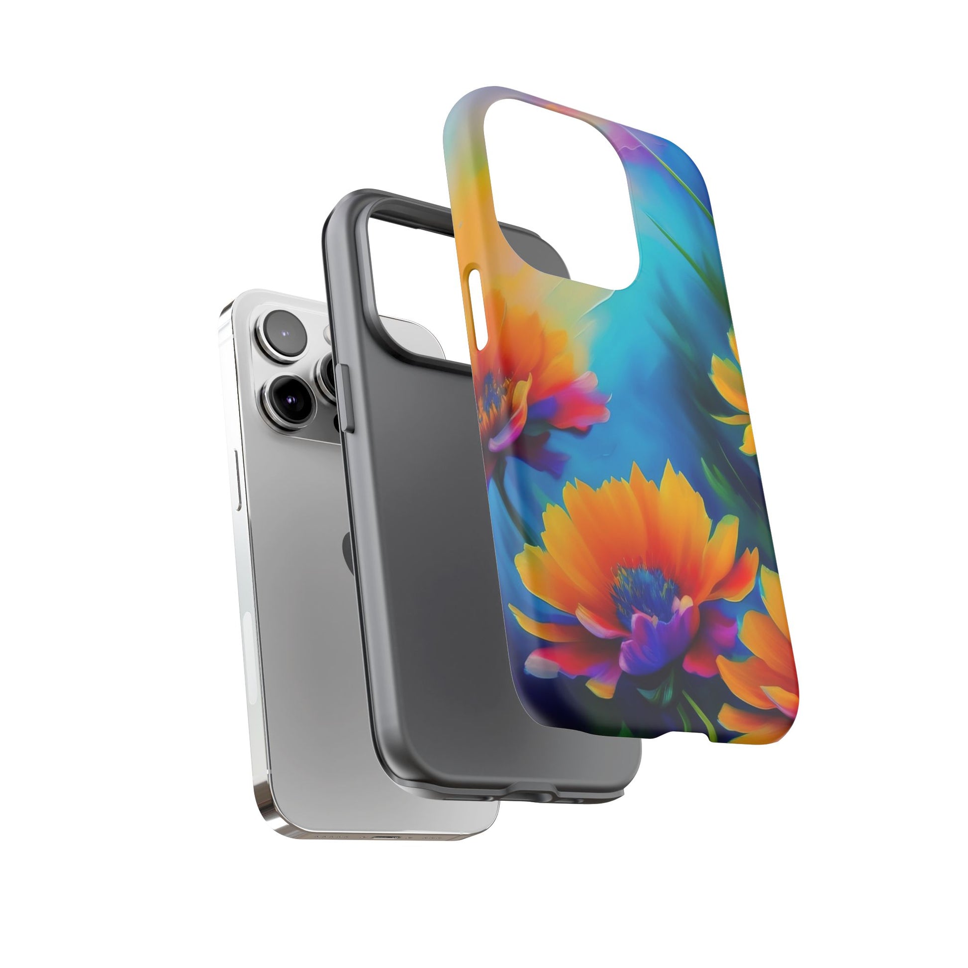 Vivid, protective, and made to travel with you — this phone case brings bold, painterly blooms to the everyday. Rich turquoise and deep violet backgrounds make the warm orange-and-magenta flowers sing, wrapping your device in color from edge to edge. The dual-layer construction—hard polycarbonate shell with a soft TPU silicone liner—absorbs shocks and resists drops while a glossy or matte finish keeps the artwork vibrant. It feels sturdy in hand, keeps ports accessible, and supports wireless charging so your routine stays effortless. Care notes included to keep the print crisp: avoid prolonged sun, alcohol-heavy liquids, and excess heat.