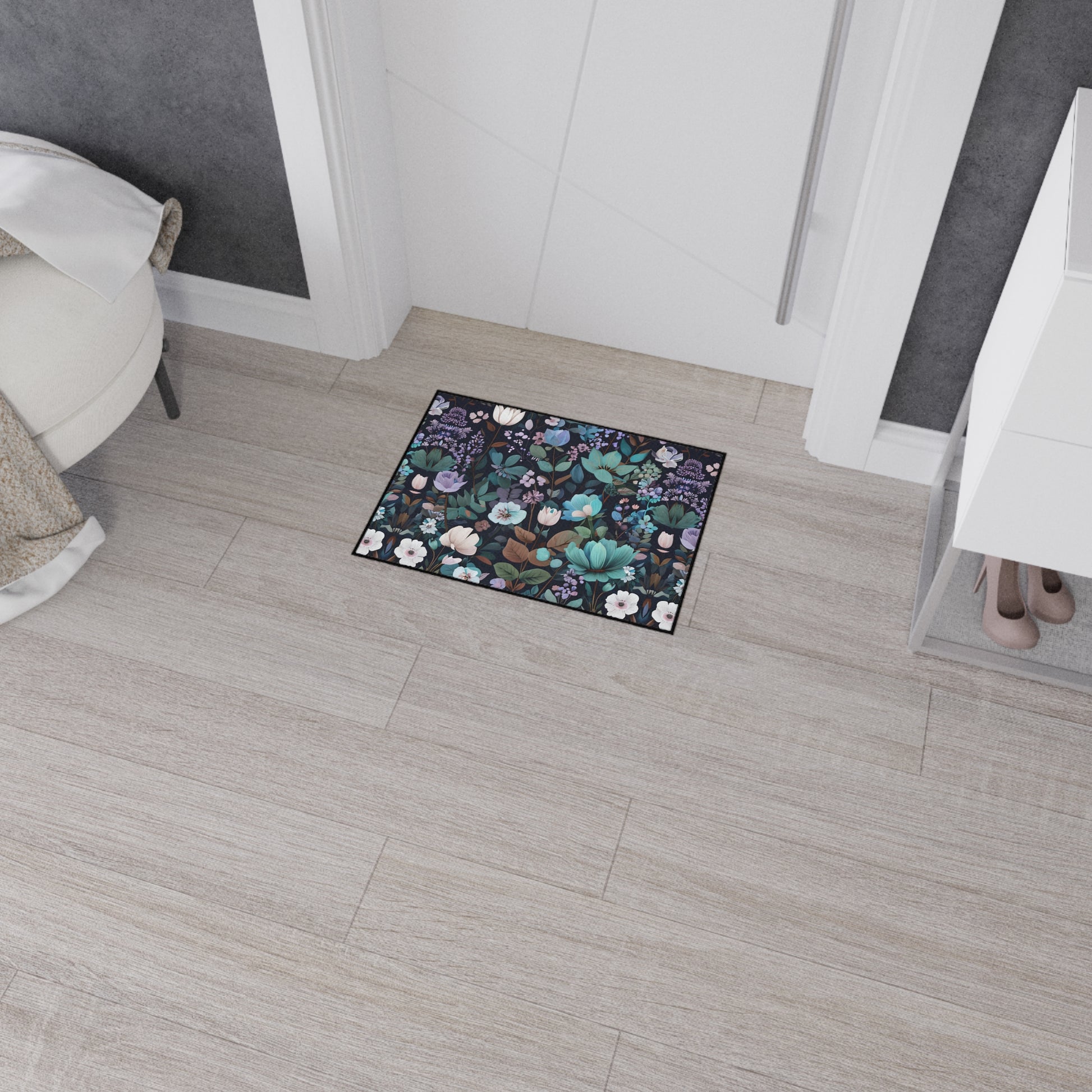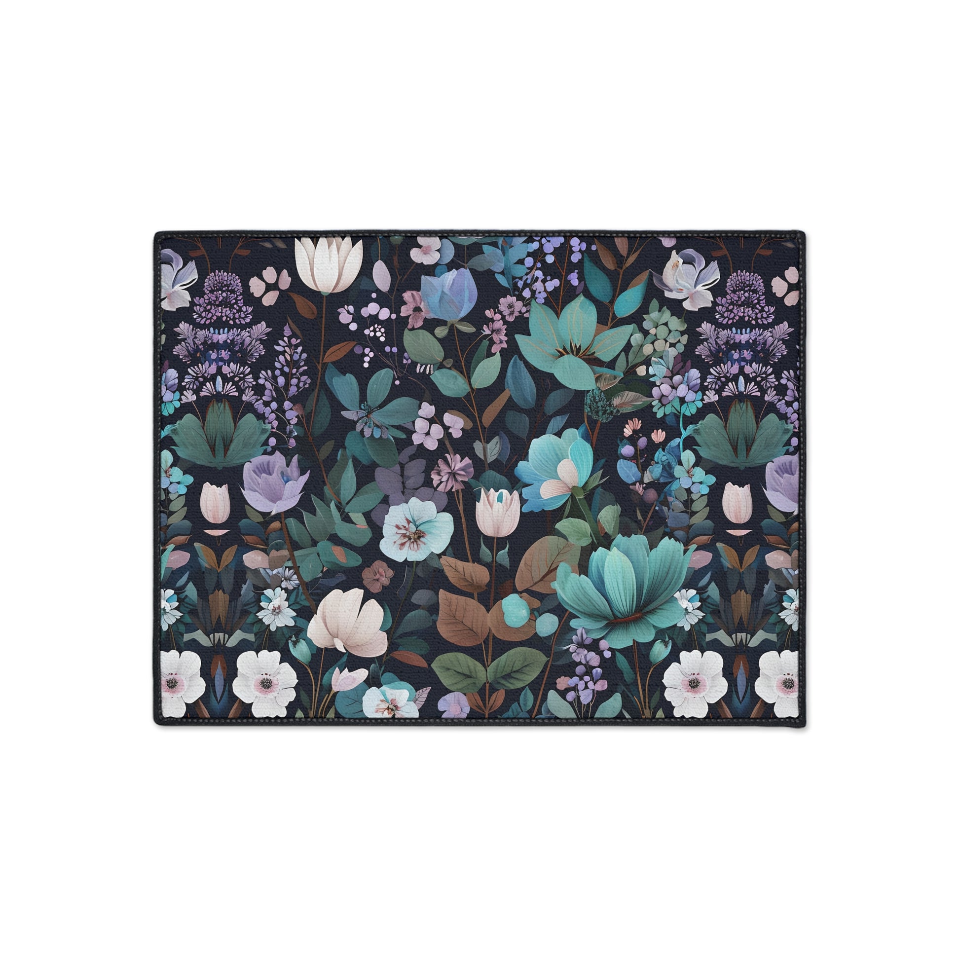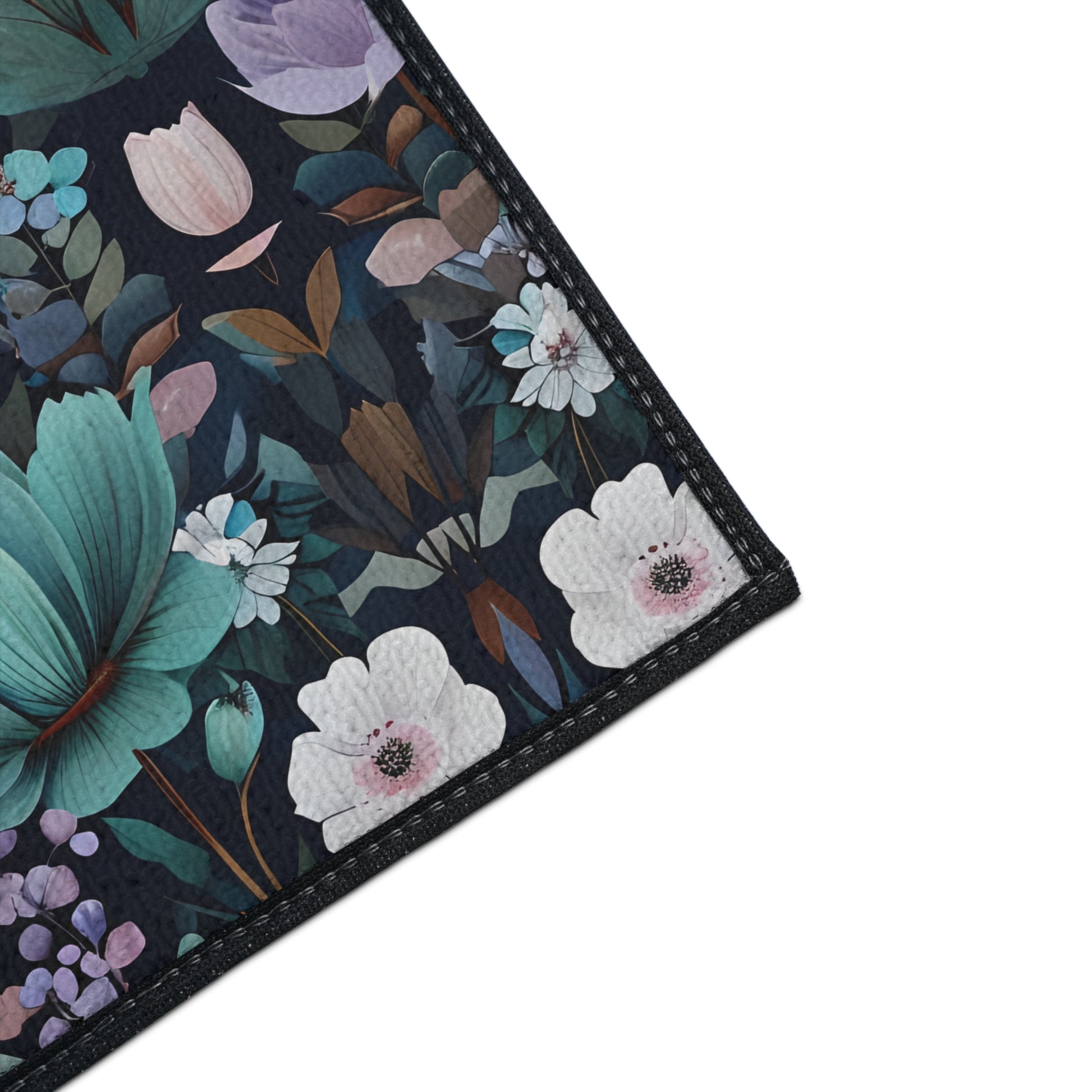 Lay this heavy-duty floor mat where you want a touch of calm and color underfoot. The print folds a moonlit garden into soft teal, lavender and cream blooms against a deep charcoal ground — it settles spaces down and rewards a second look. Thick polyester top keeps colors vivid through daily traffic, while the textured rubber underside locks the mat in place so it won’t wander in entryways, kitchens, or beside a bed. It reads like a quiet, cultivated corner of the house: hospitable, composed, and ready for shoes, paws, or bare feet.