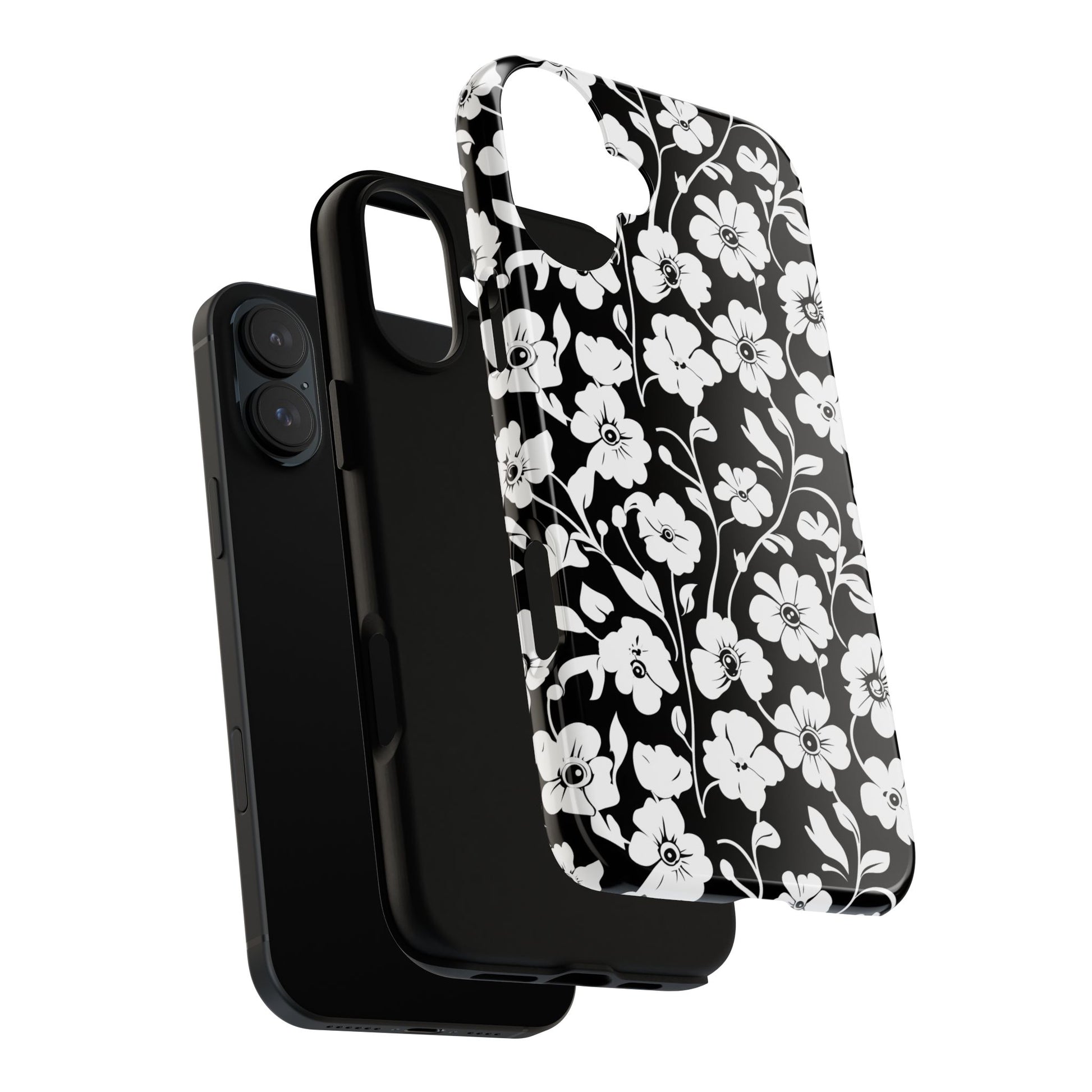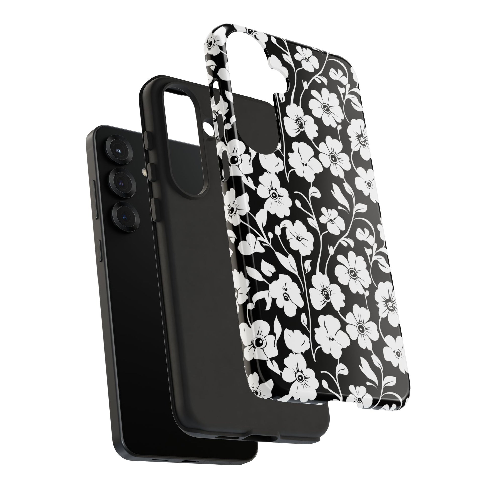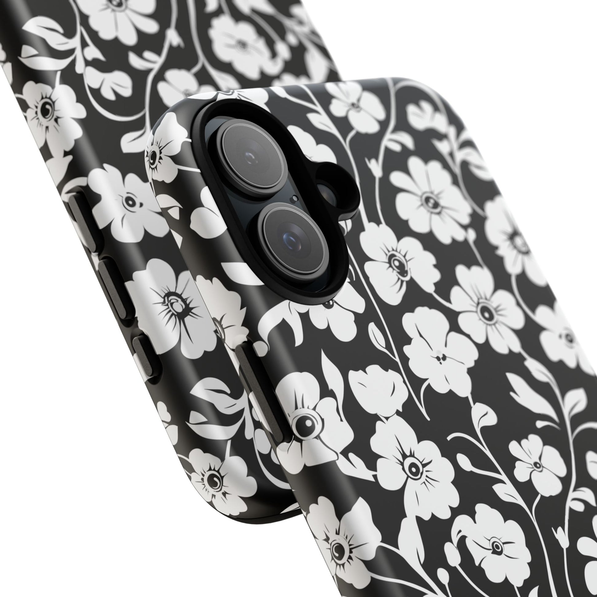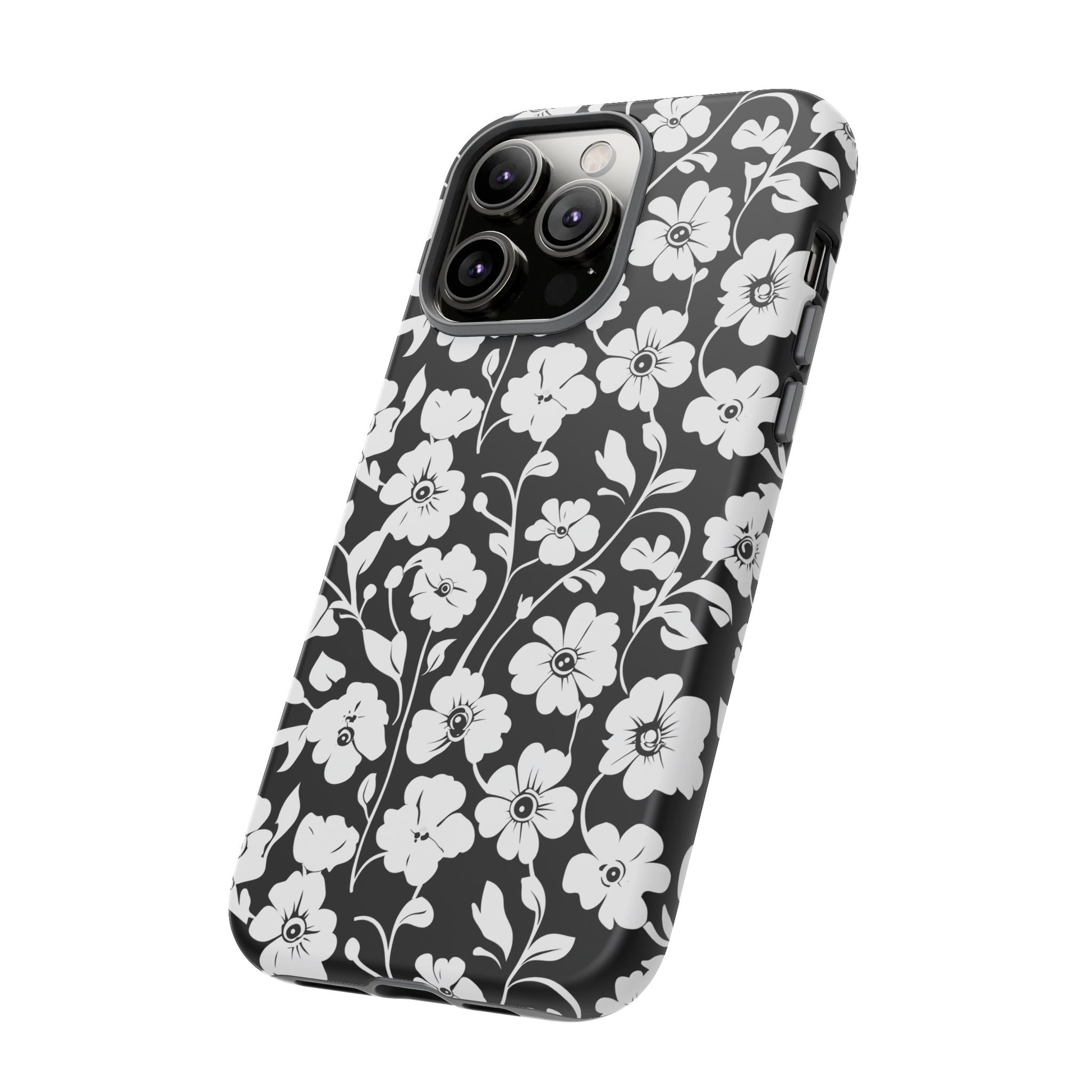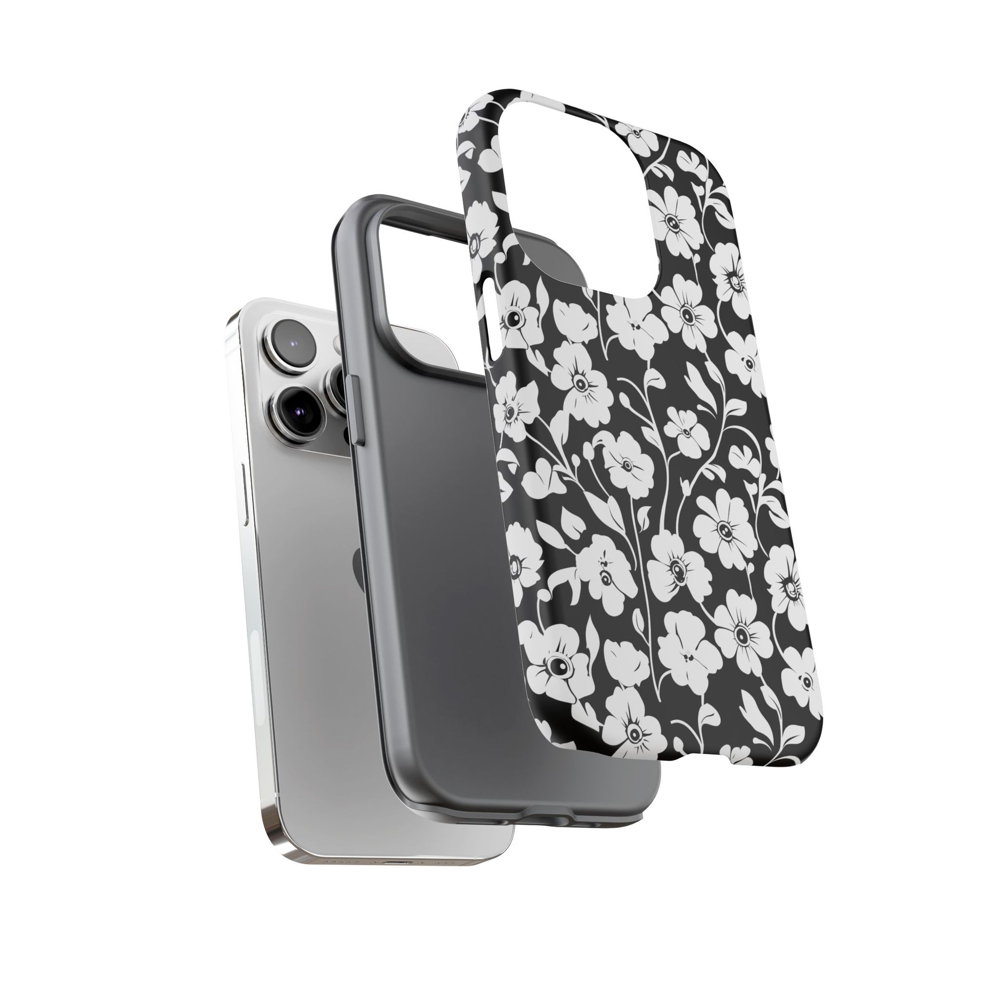 Black-and-white floral phone case that balances vintage charm with everyday toughness. The high-contrast blossom pattern feels like an old sketch brought into modern life — quiet, graphic, and a little romantic. The dual-layer shell and TPU silicone liner give it a reassuring weight and soft shock absorption, so the case sits comfortably in a hand and takes the worry out of daily drops. Weather-resistant inks and UV protection keep the white flowers crisp against the black background, while glossy or matte finish options let you pick satin restraint or a subtle sheen. Fits into a slow-living wardrobe or a city commute — a small piece of calm you carry with you.
