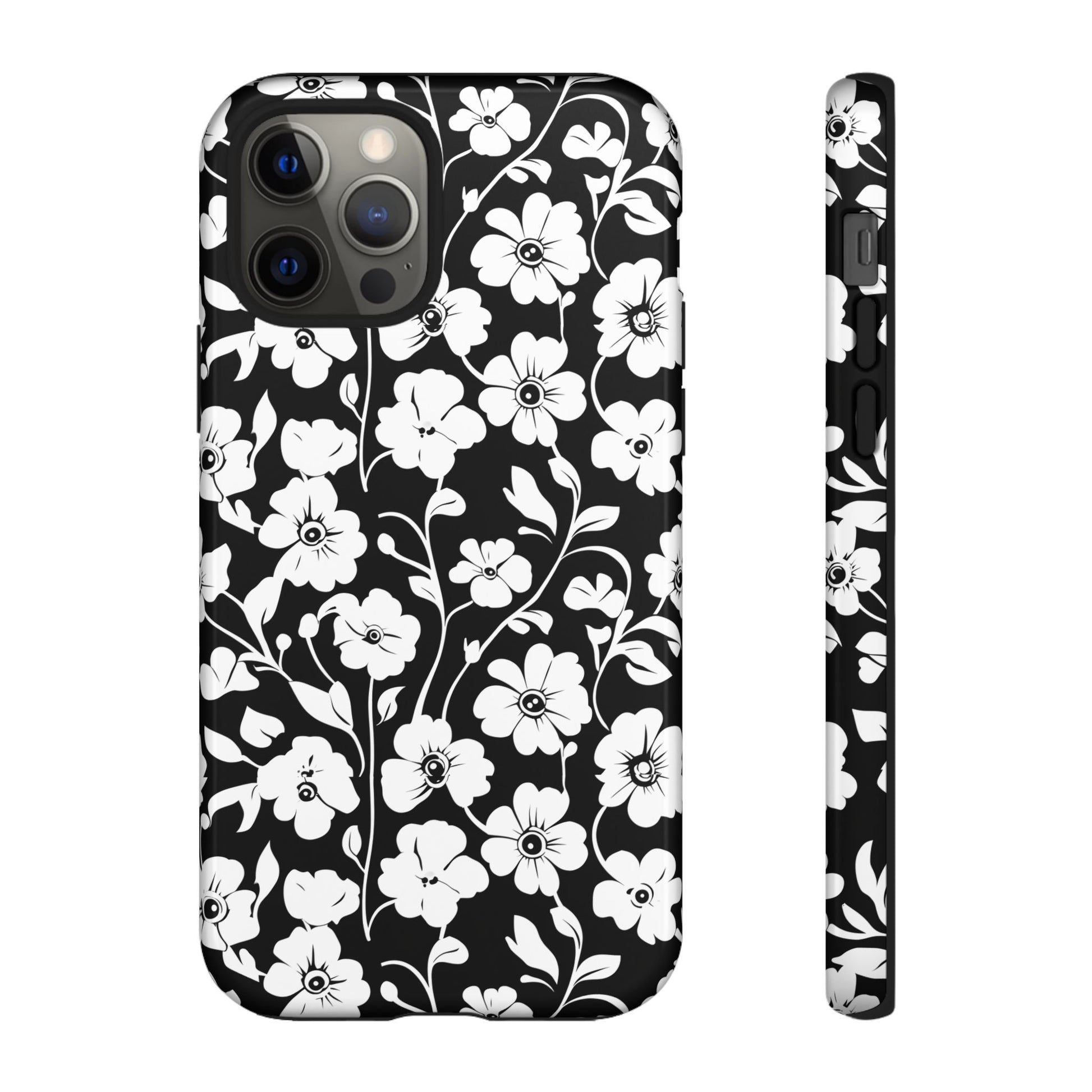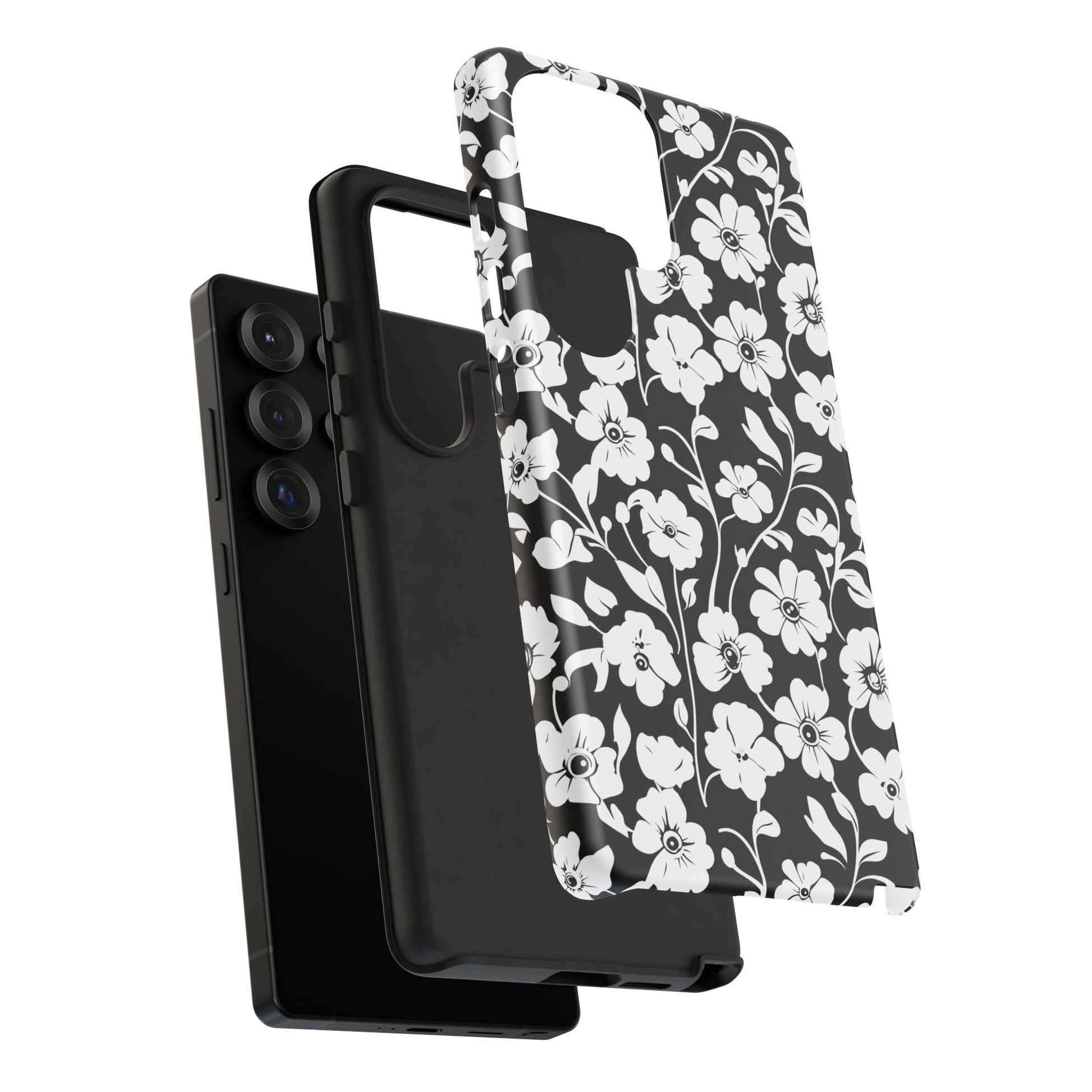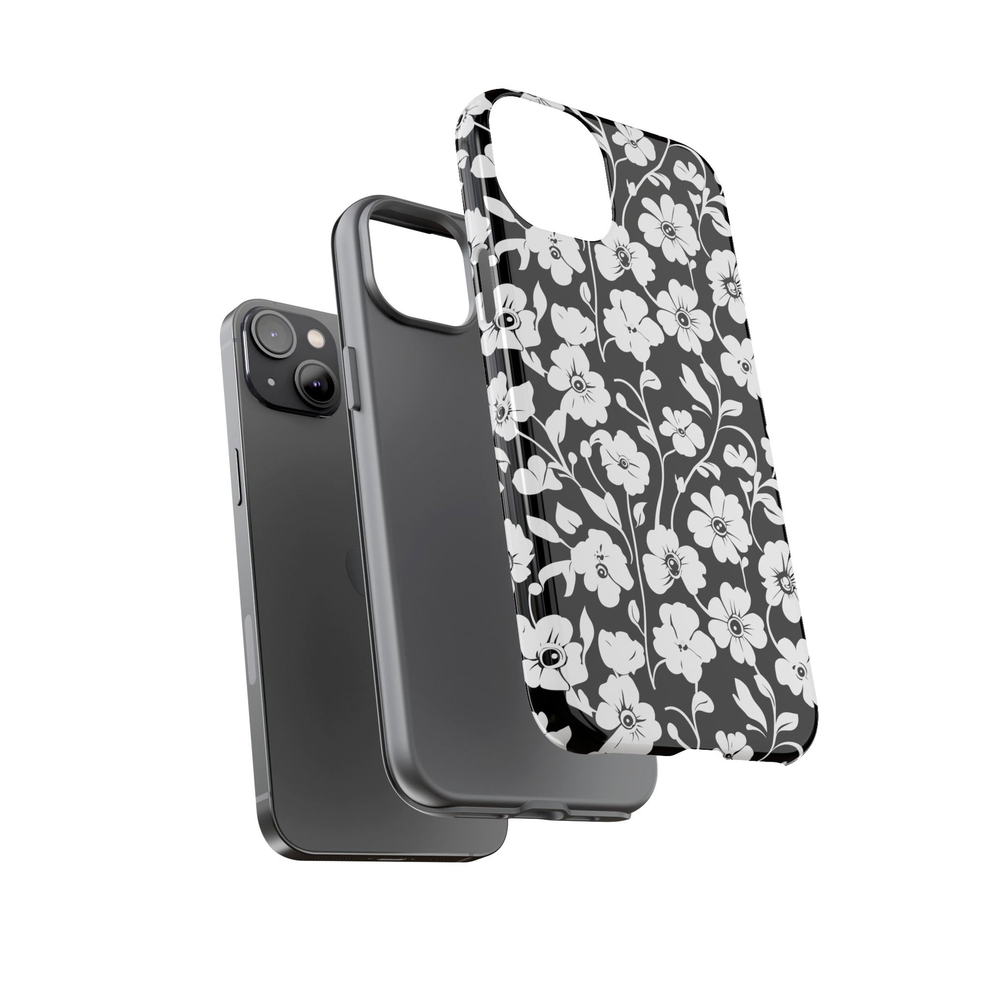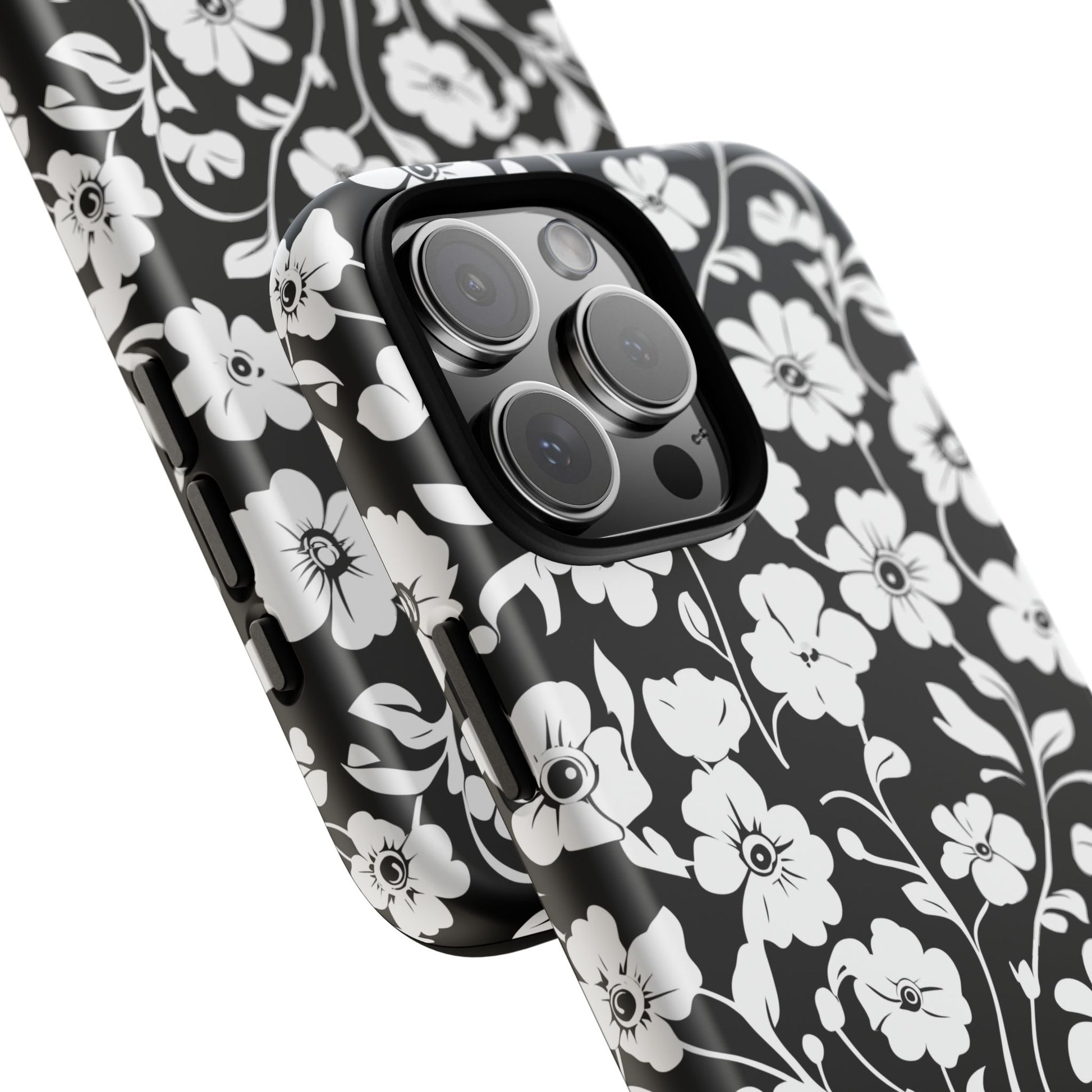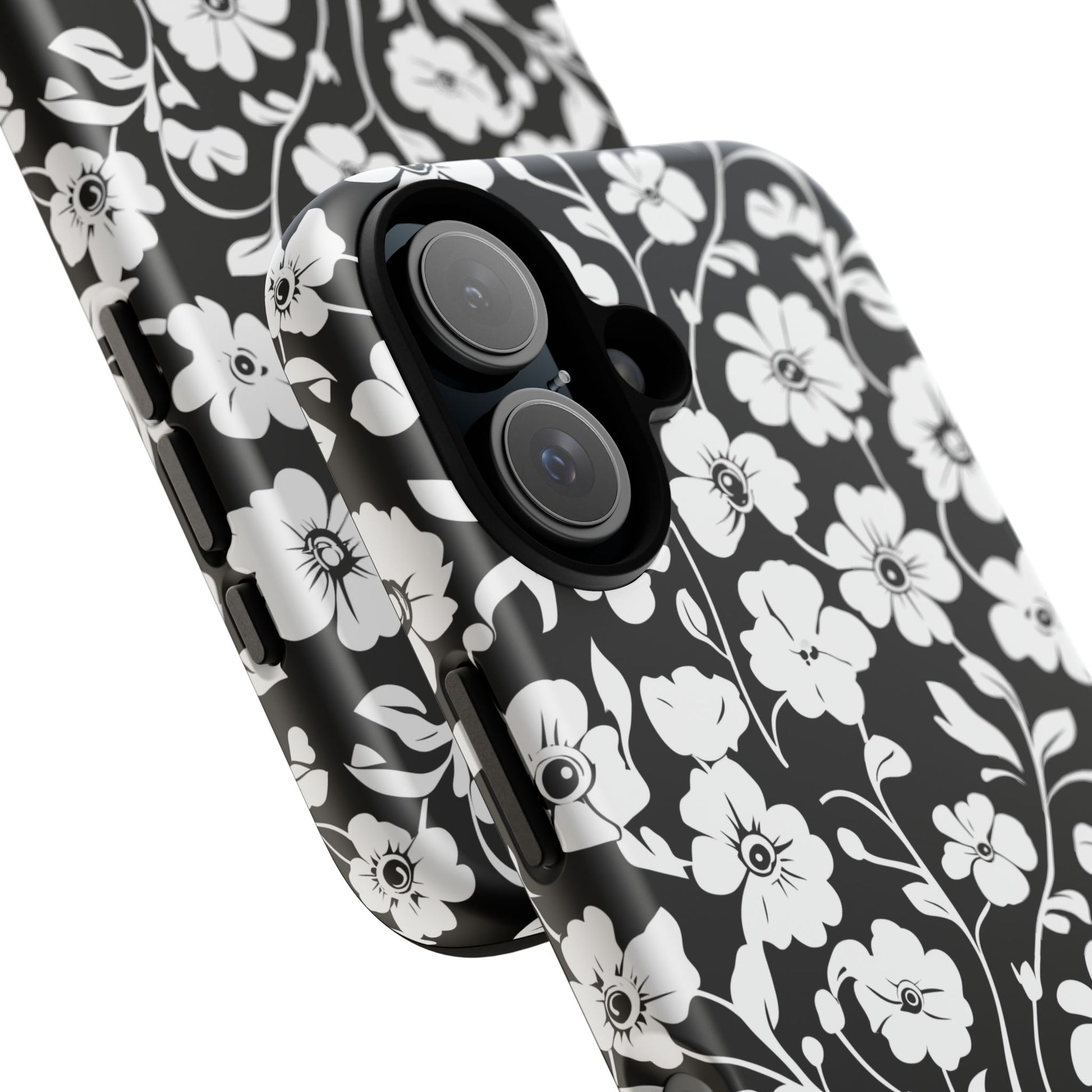 Black-and-white floral phone case that balances vintage charm with everyday toughness. The high-contrast blossom pattern feels like an old sketch brought into modern life — quiet, graphic, and a little romantic. The dual-layer shell and TPU silicone liner give it a reassuring weight and soft shock absorption, so the case sits comfortably in a hand and takes the worry out of daily drops. Weather-resistant inks and UV protection keep the white flowers crisp against the black background, while glossy or matte finish options let you pick satin restraint or a subtle sheen. Fits into a slow-living wardrobe or a city commute — a small piece of calm you carry with you.