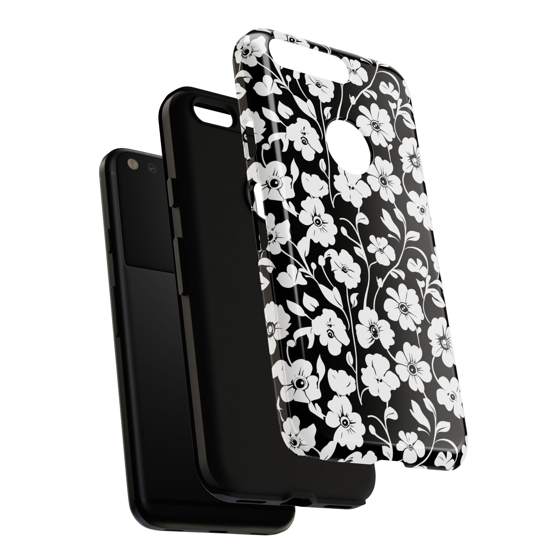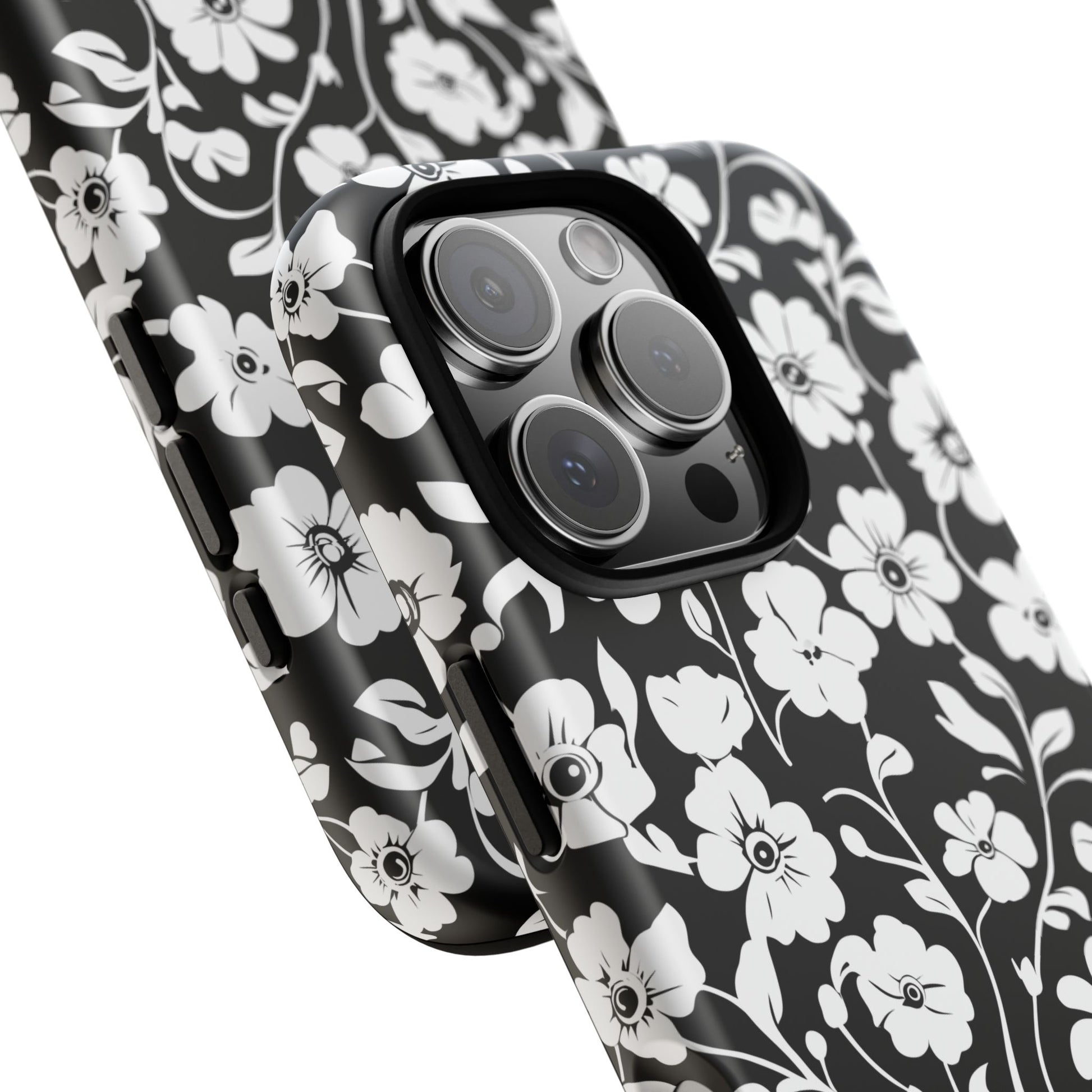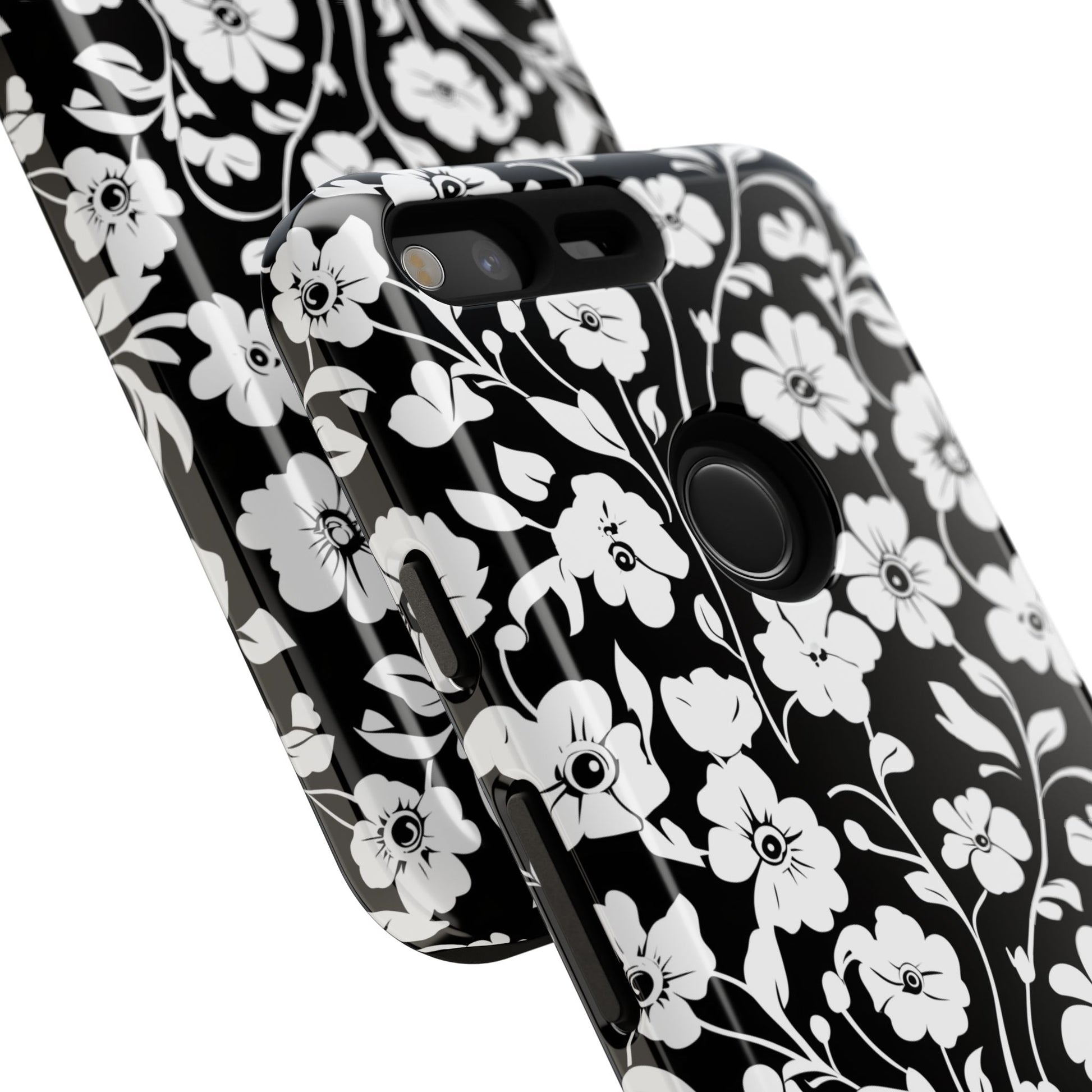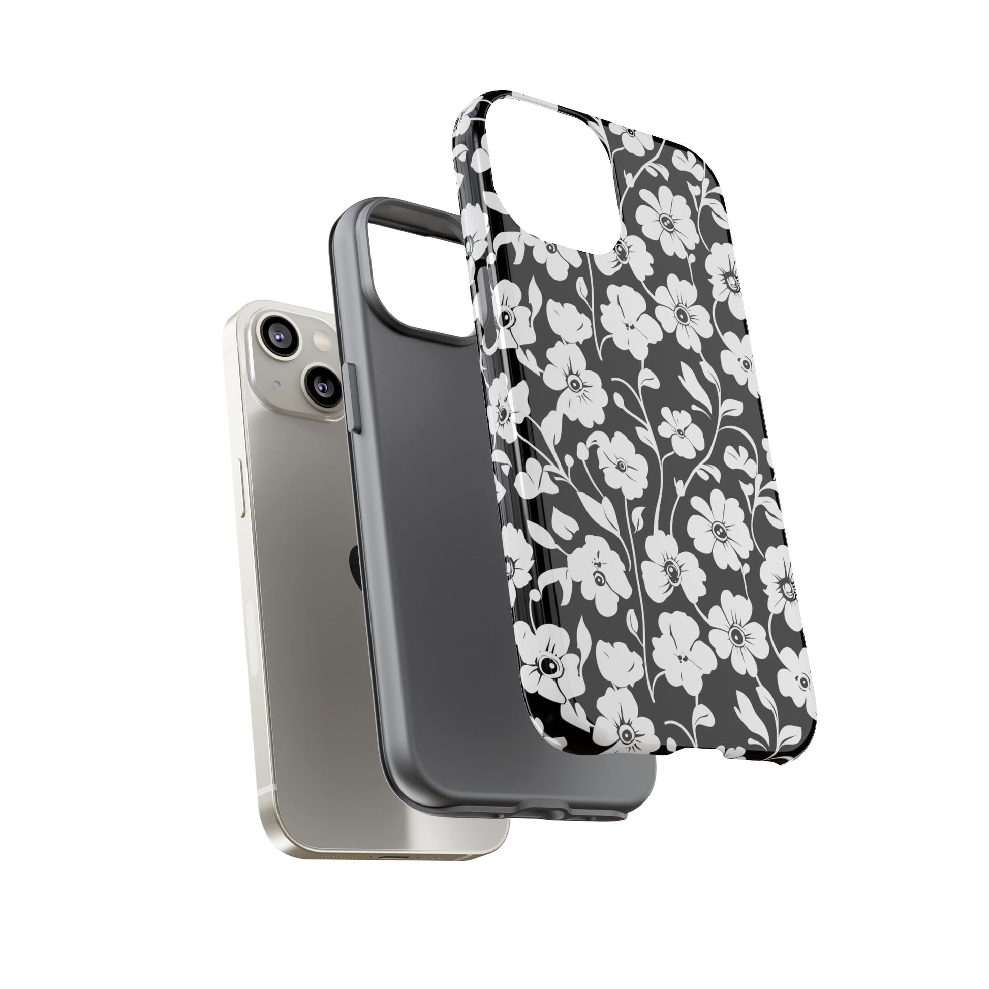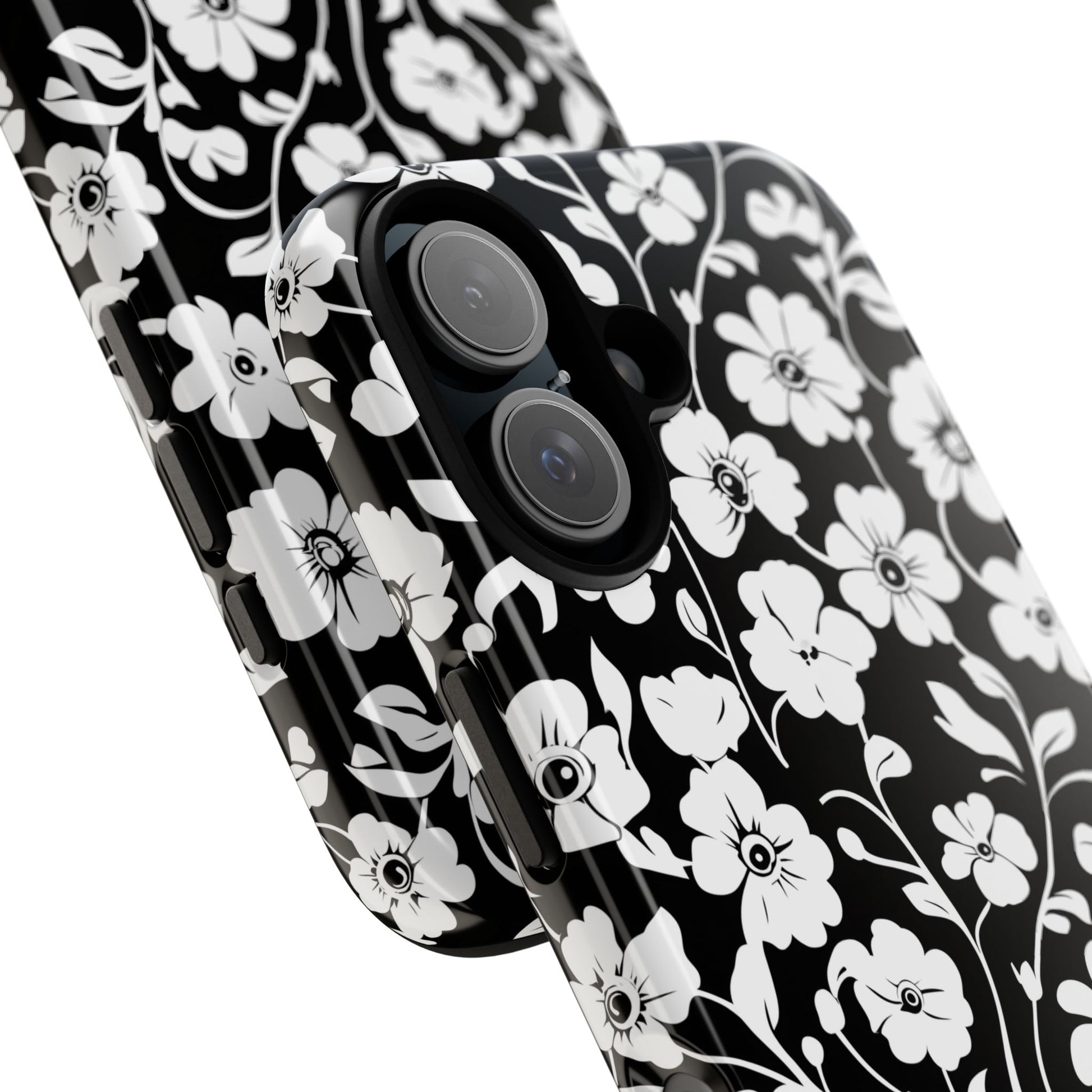 Black-and-white floral phone case that balances vintage charm with everyday toughness. The high-contrast blossom pattern feels like an old sketch brought into modern life — quiet, graphic, and a little romantic. The dual-layer shell and TPU silicone liner give it a reassuring weight and soft shock absorption, so the case sits comfortably in a hand and takes the worry out of daily drops. Weather-resistant inks and UV protection keep the white flowers crisp against the black background, while glossy or matte finish options let you pick satin restraint or a subtle sheen. Fits into a slow-living wardrobe or a city commute — a small piece of calm you carry with you.