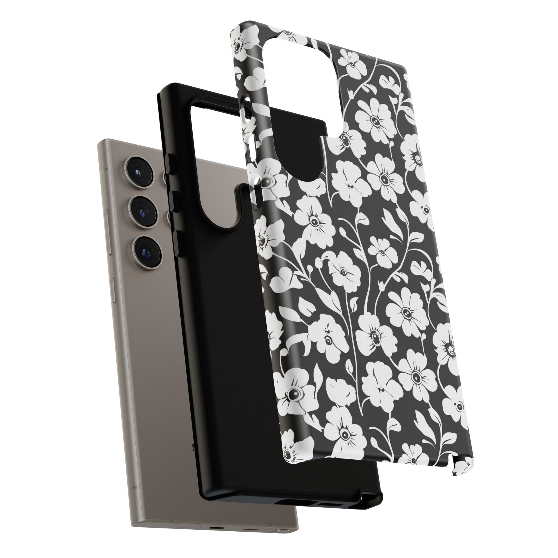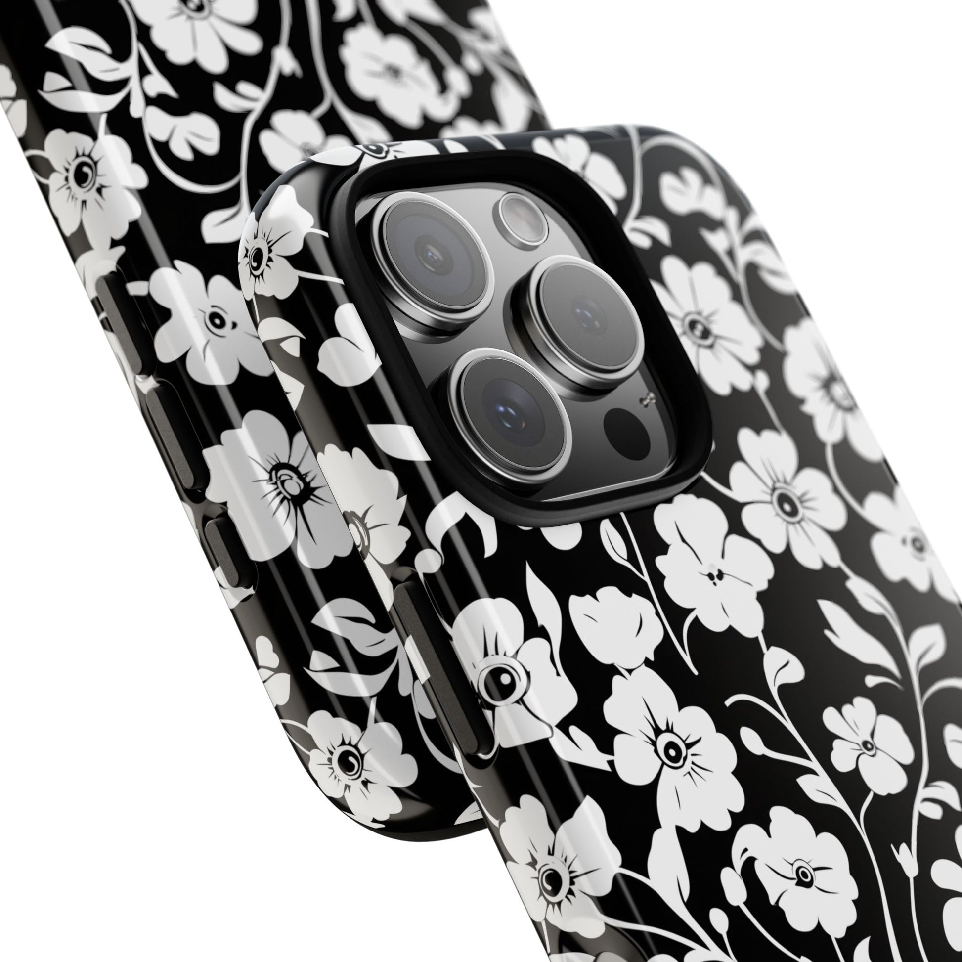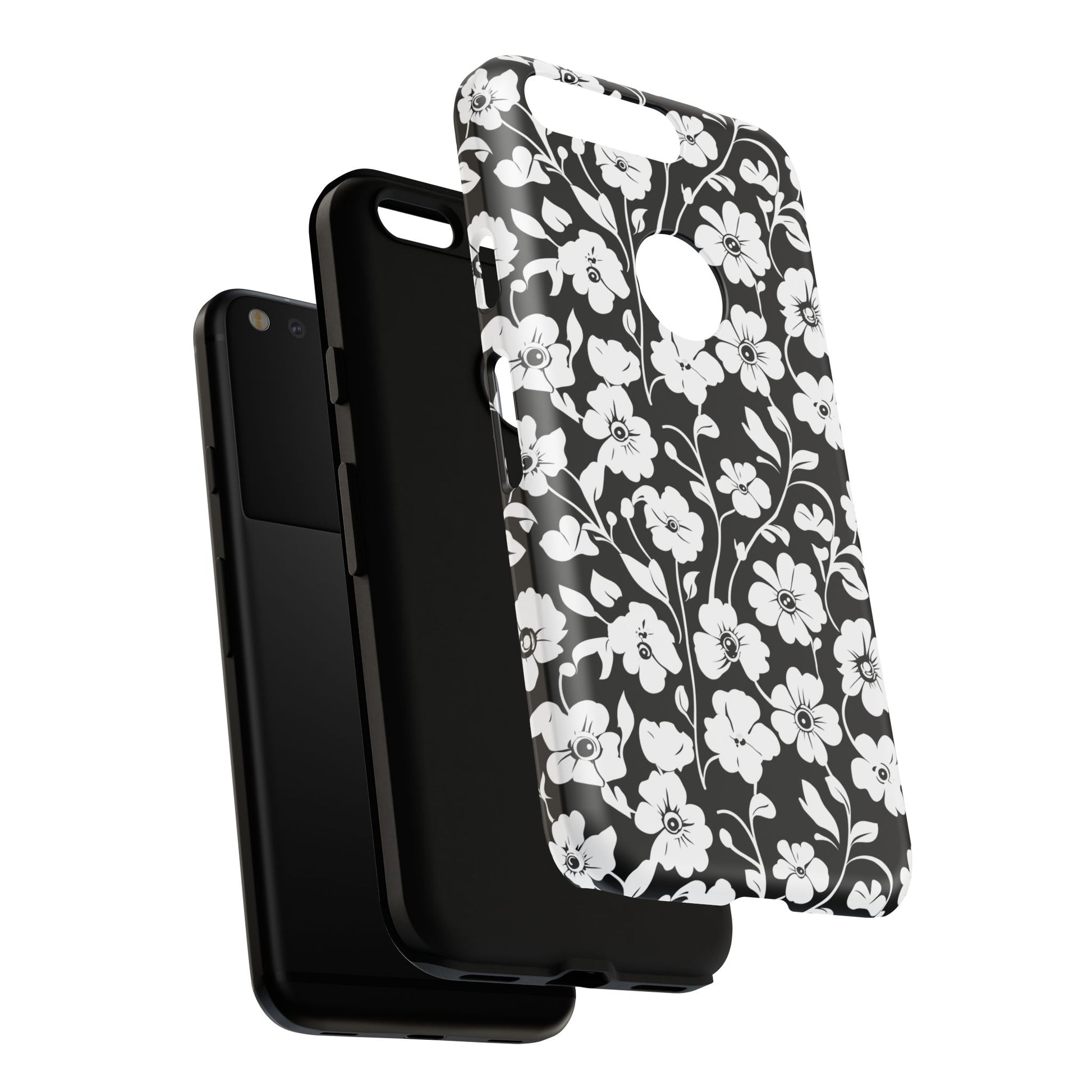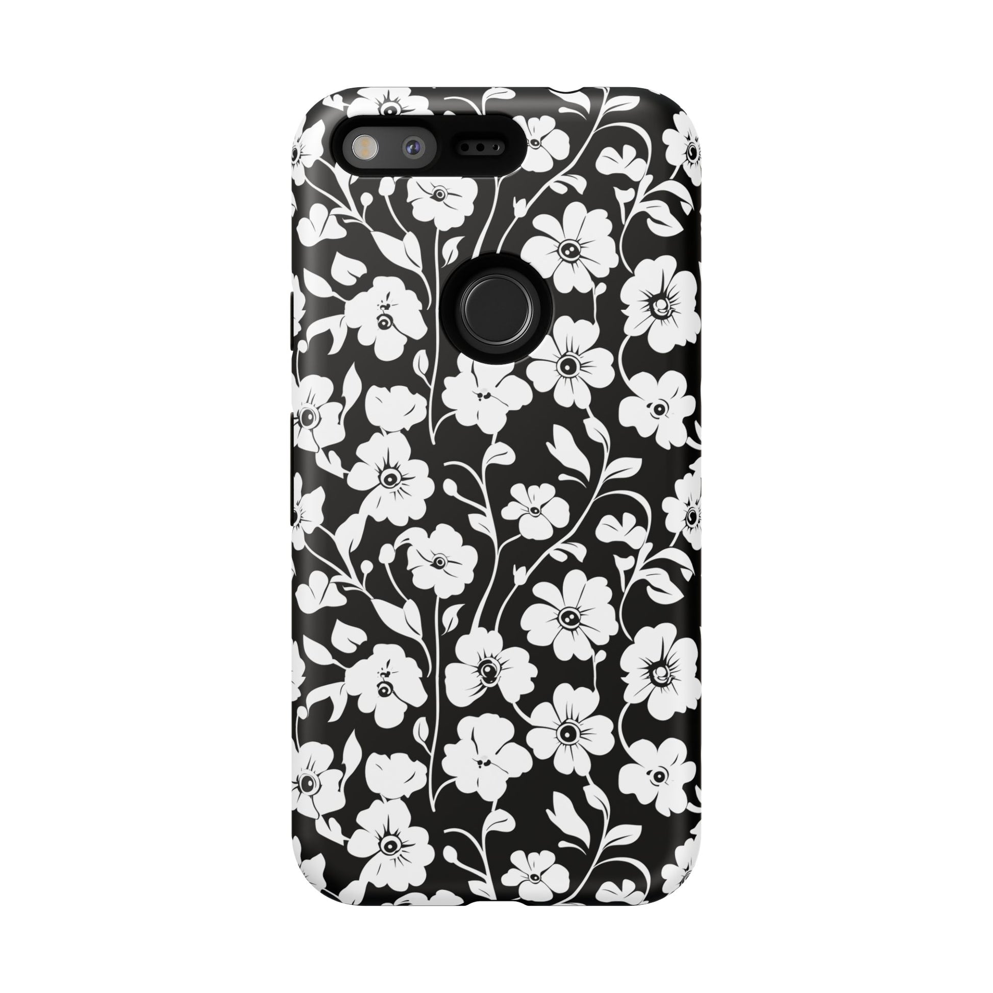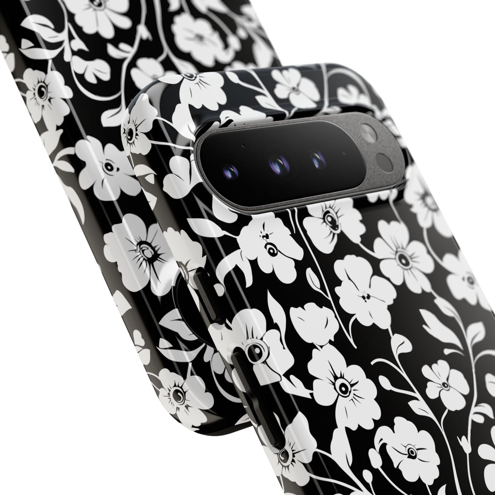 Black-and-white floral phone case that balances vintage charm with everyday toughness. The high-contrast blossom pattern feels like an old sketch brought into modern life — quiet, graphic, and a little romantic. The dual-layer shell and TPU silicone liner give it a reassuring weight and soft shock absorption, so the case sits comfortably in a hand and takes the worry out of daily drops. Weather-resistant inks and UV protection keep the white flowers crisp against the black background, while glossy or matte finish options let you pick satin restraint or a subtle sheen. Fits into a slow-living wardrobe or a city commute — a small piece of calm you carry with you.