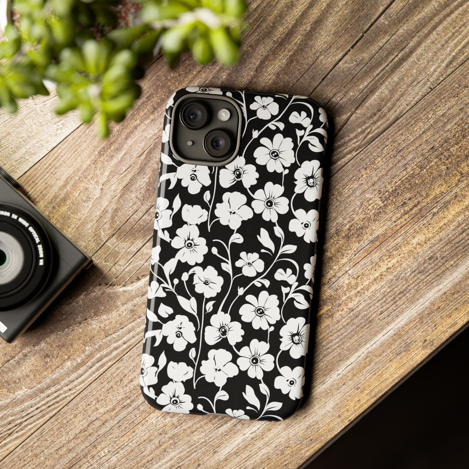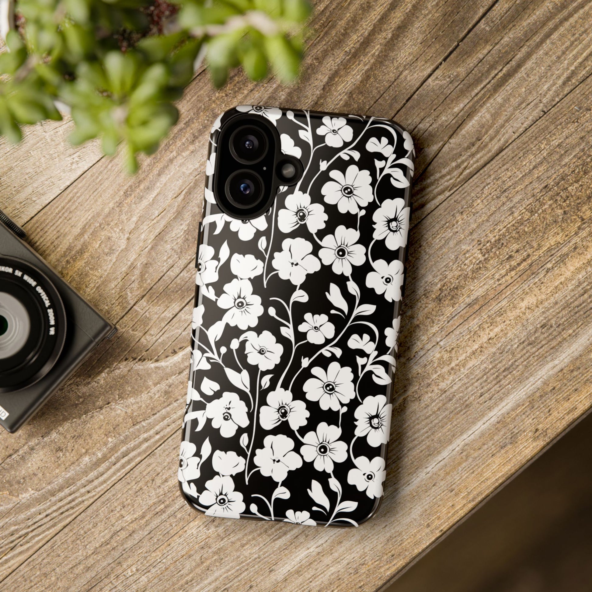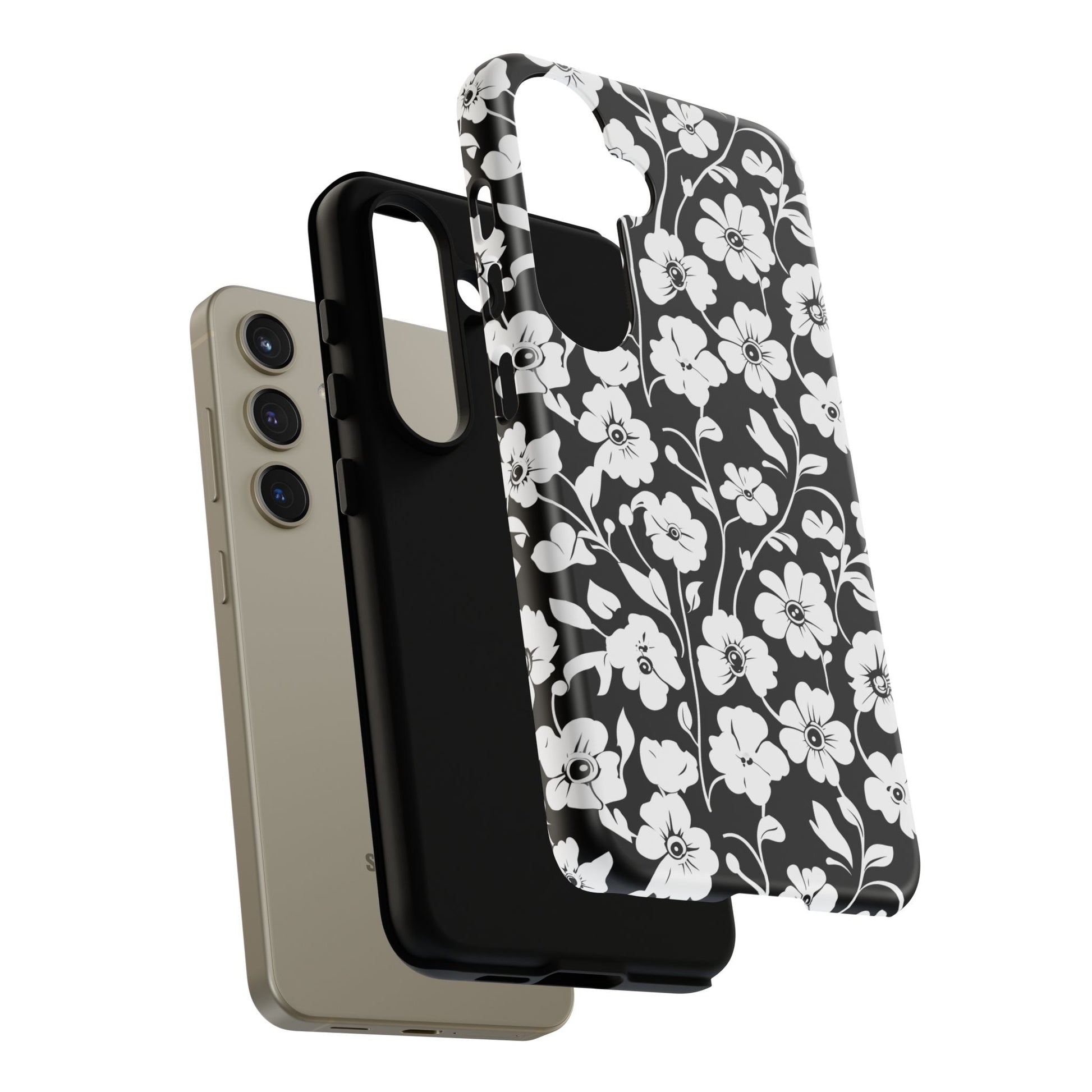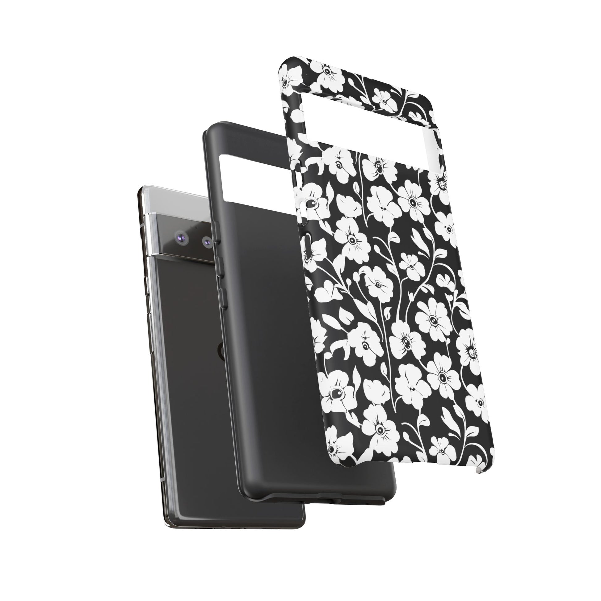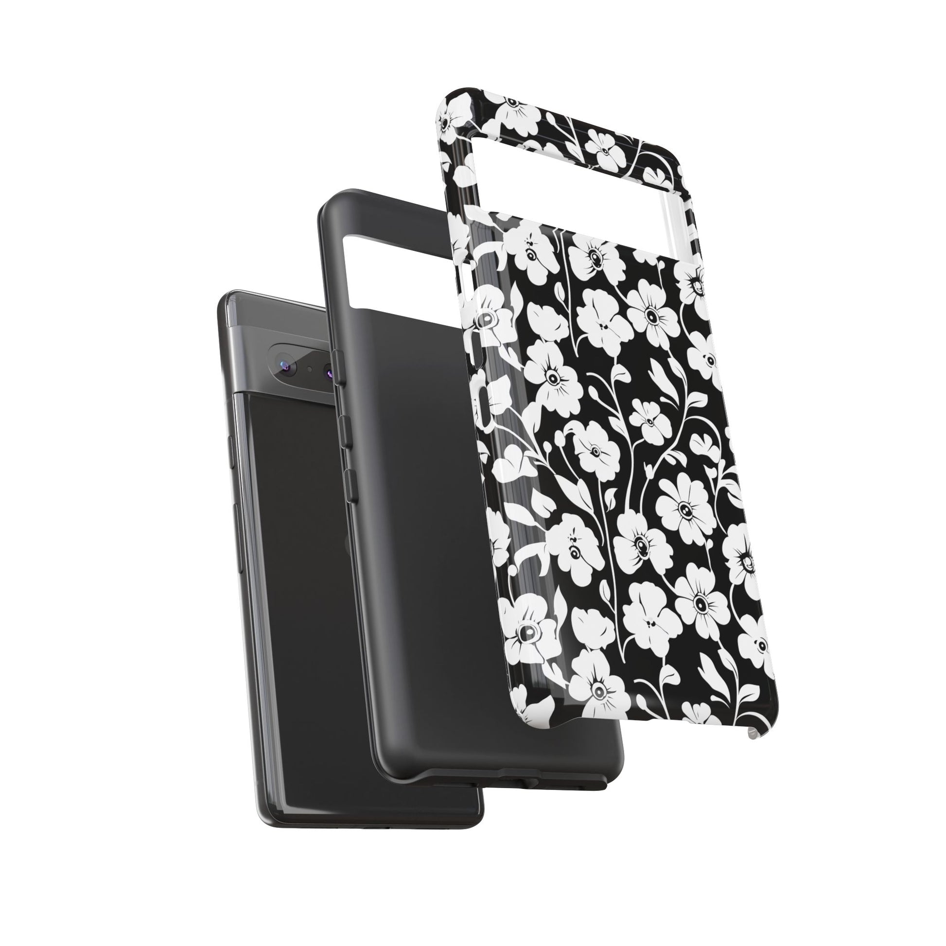 Black-and-white floral phone case that balances vintage charm with everyday toughness. The high-contrast blossom pattern feels like an old sketch brought into modern life — quiet, graphic, and a little romantic. The dual-layer shell and TPU silicone liner give it a reassuring weight and soft shock absorption, so the case sits comfortably in a hand and takes the worry out of daily drops. Weather-resistant inks and UV protection keep the white flowers crisp against the black background, while glossy or matte finish options let you pick satin restraint or a subtle sheen. Fits into a slow-living wardrobe or a city commute — a small piece of calm you carry with you.