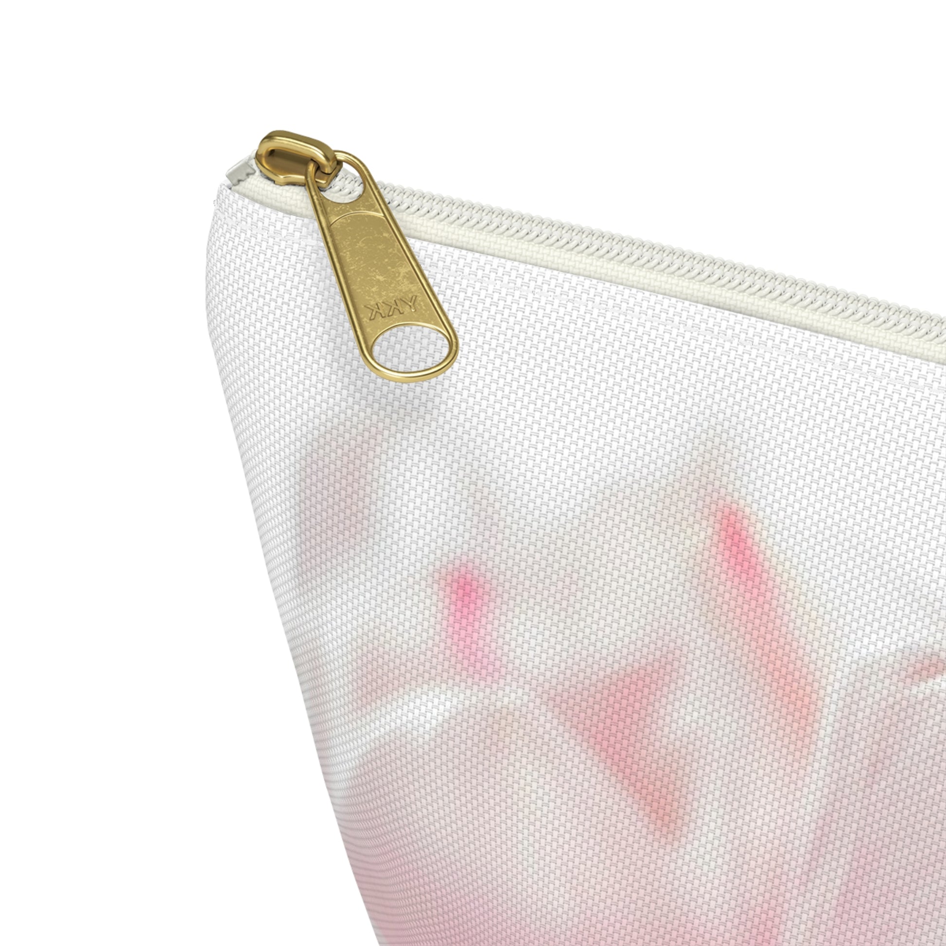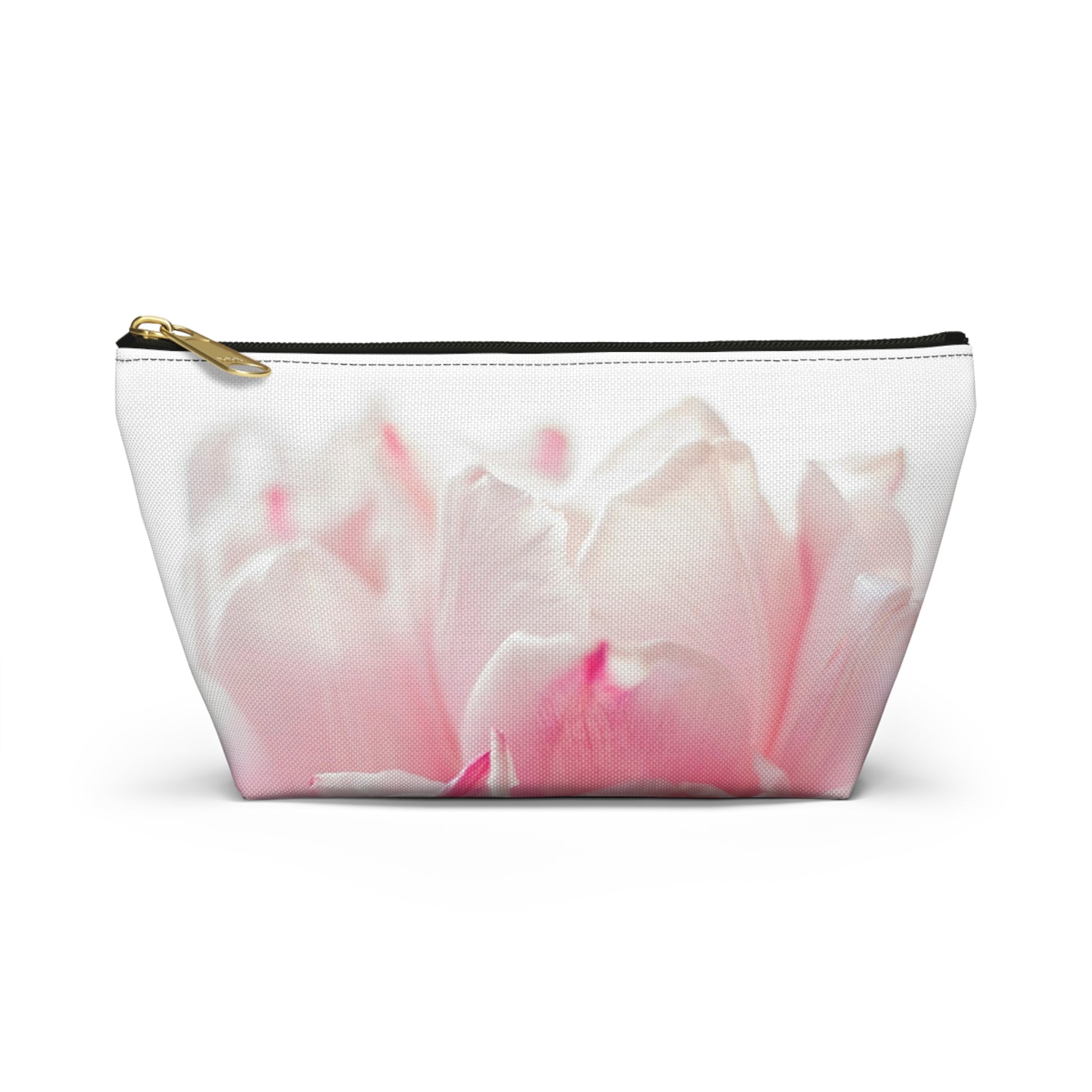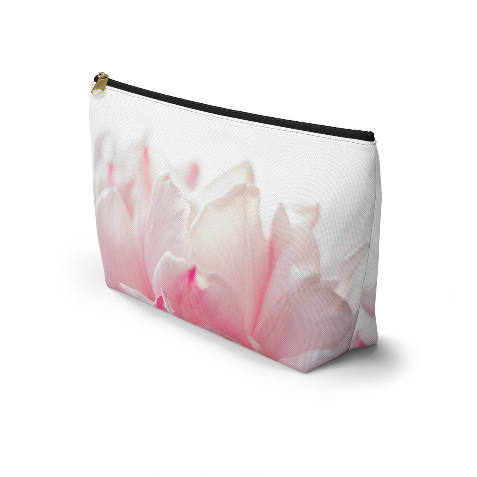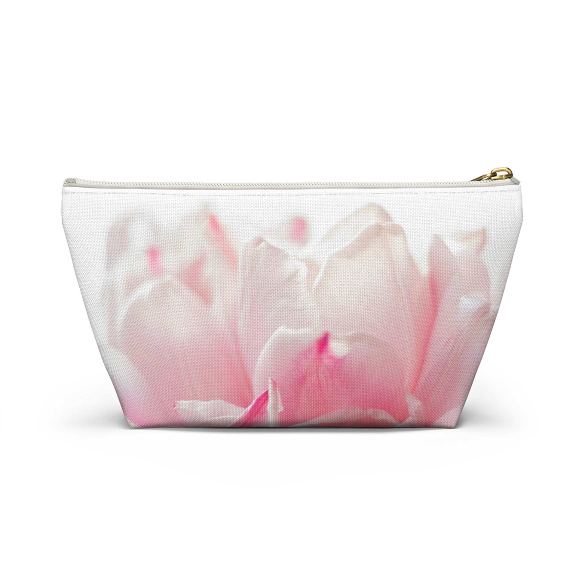 A soft, dreamy pouch that carries a little garden wherever you go. The T-bottom shape gives it a roomy, structured base so brushes, chargers, or everyday essentials sit neatly without tumbling. A close-up, pastel bloom wraps the exterior in pale pinks and creamy whites — a gentle, quiet print that reads like morning light on petals. The interior is laminated for easy cleaning and the gold-toned zipper pull adds a subtle touch of warmth. It’s small enough to slip into a tote, yet practical enough to keep daily things organized on a dresser or nightstand.