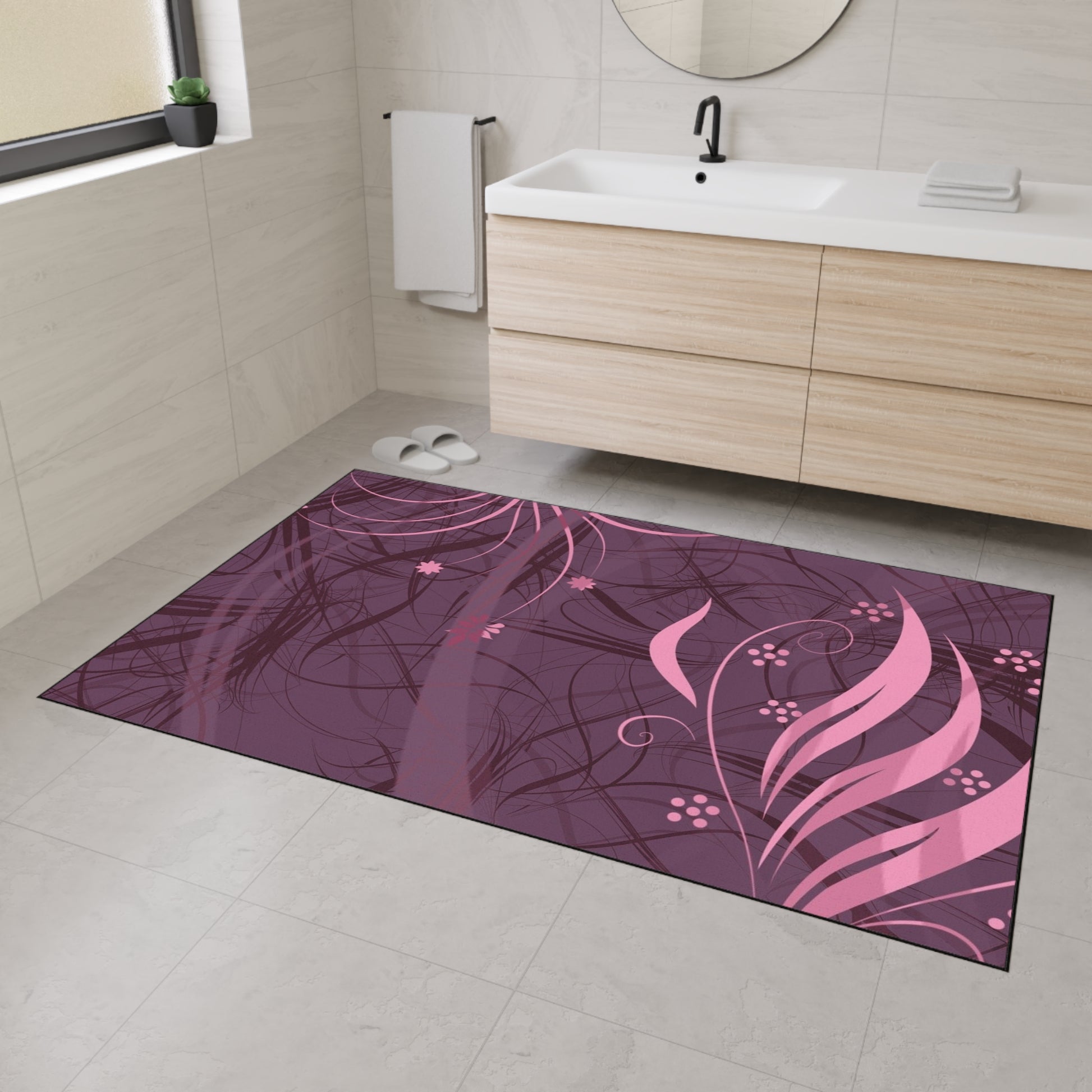 This heavy-duty floor mat brings bold, artistic energy right to your space. The rich plum background and flowing pink botanical swirls create a calm, creative pulse underfoot — like a little garden of movement that steadies everyday routines. It’s built to take traffic: a durable polyester face captures the vibrant print while a textured rubber back grips the floor so the mat stays where you place it. Lay it by a studio easel, inside a cozy entryway, or beneath a favorite reading chair to anchor the room with color and quiet motion.