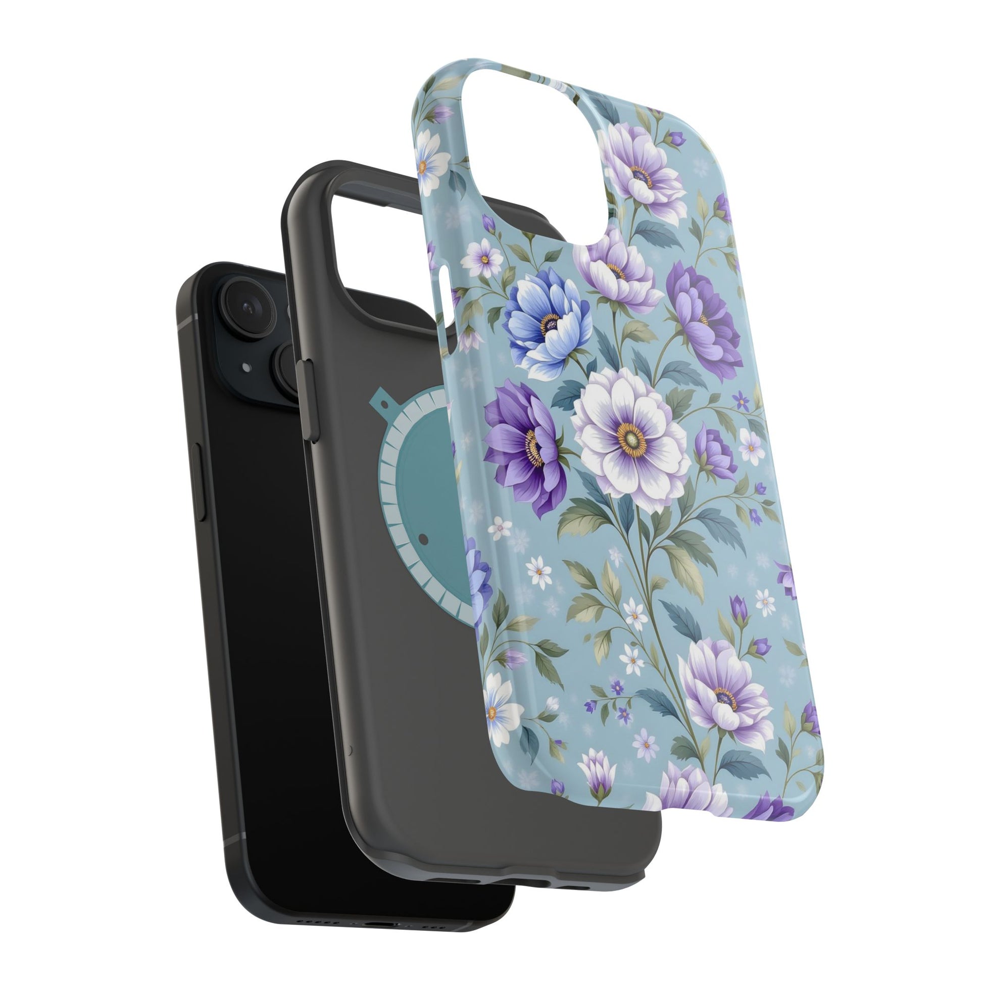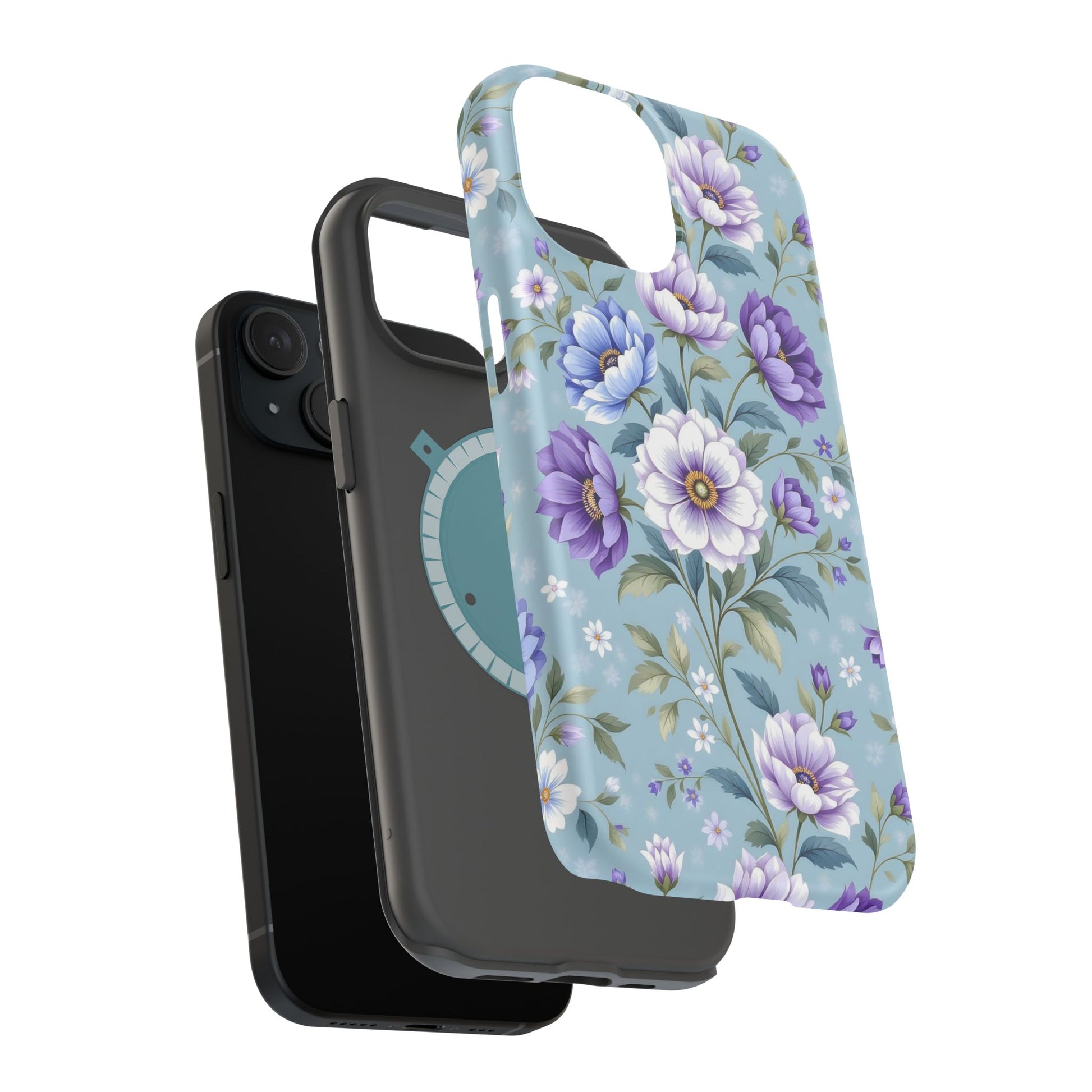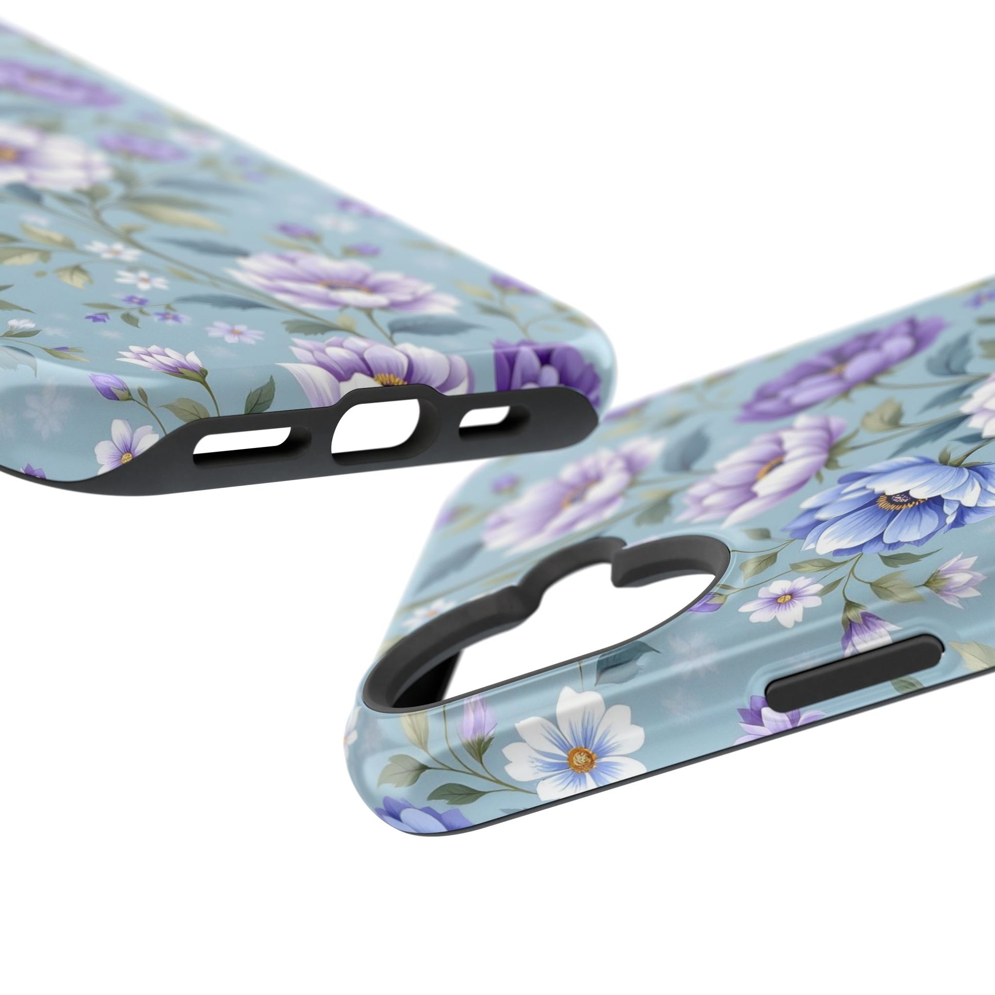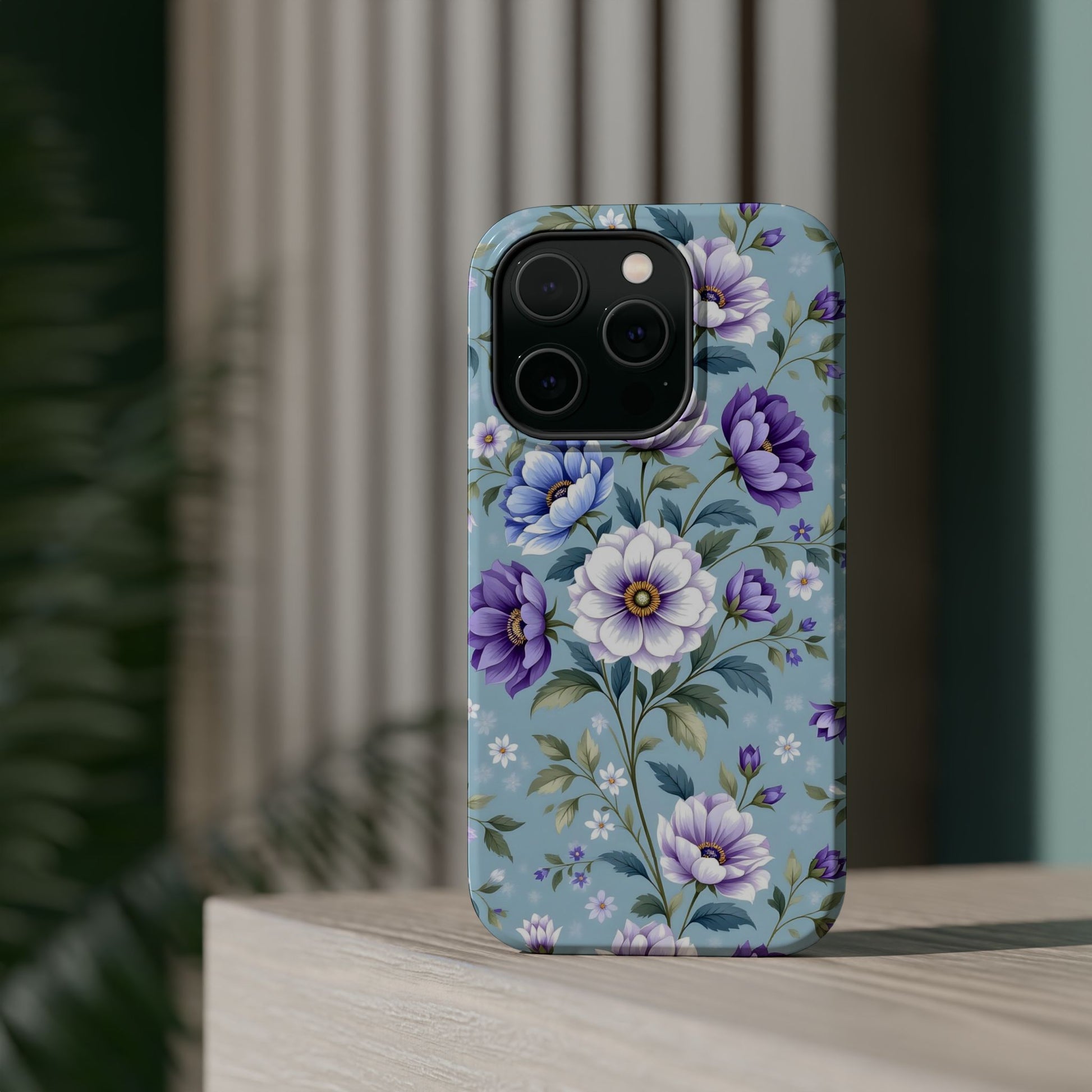 A slim, impact-resistant phone case with a soft vintage floral print that brings quiet romance to everyday carry. The full-wrap design shows layered purple and white blossoms against a muted blue background, finished in your choice of glossy or matte. Inside, a cushioned black TPU liner absorbs shocks while the rigid polycarbonate shell resists scratches and keeps the print vivid. Built-in magnets support MagSafe-style accessories so your routine stays effortless — slide it on, snap on a charger or wallet, and head out with a little floral calm at your fingertips.