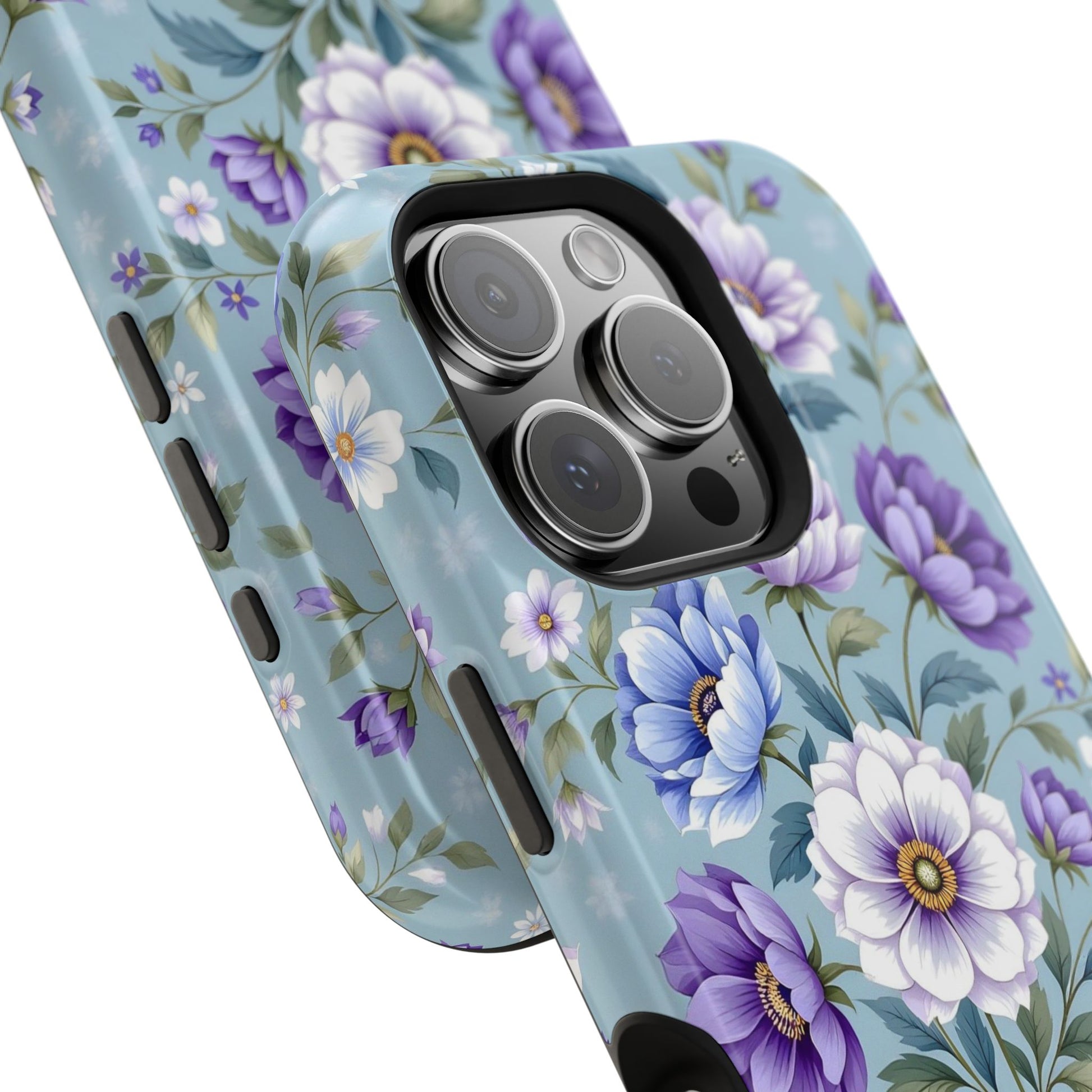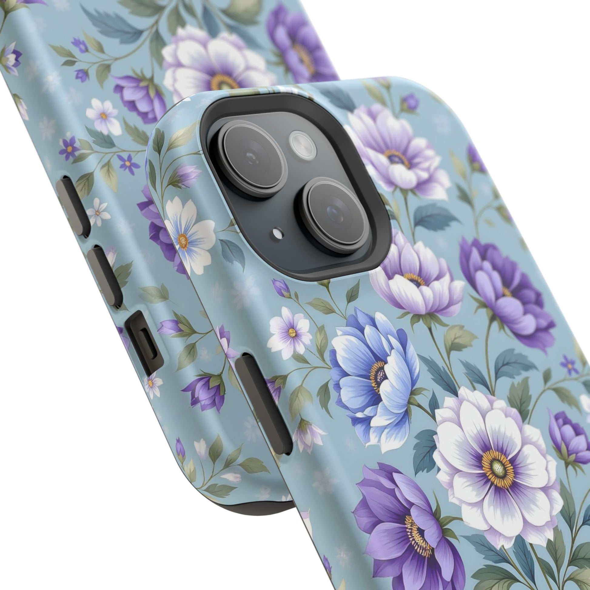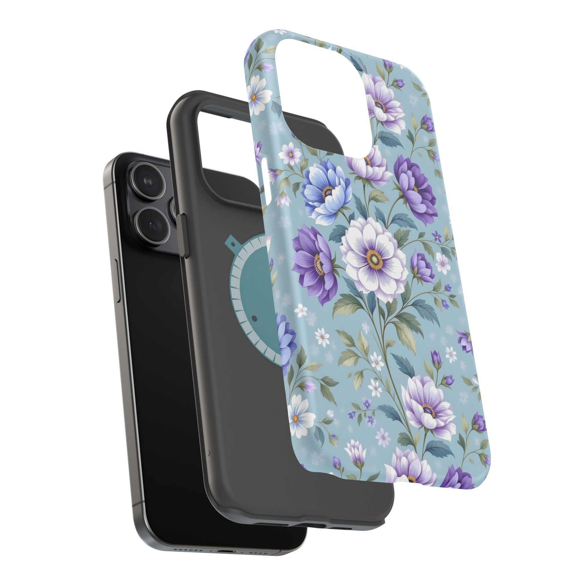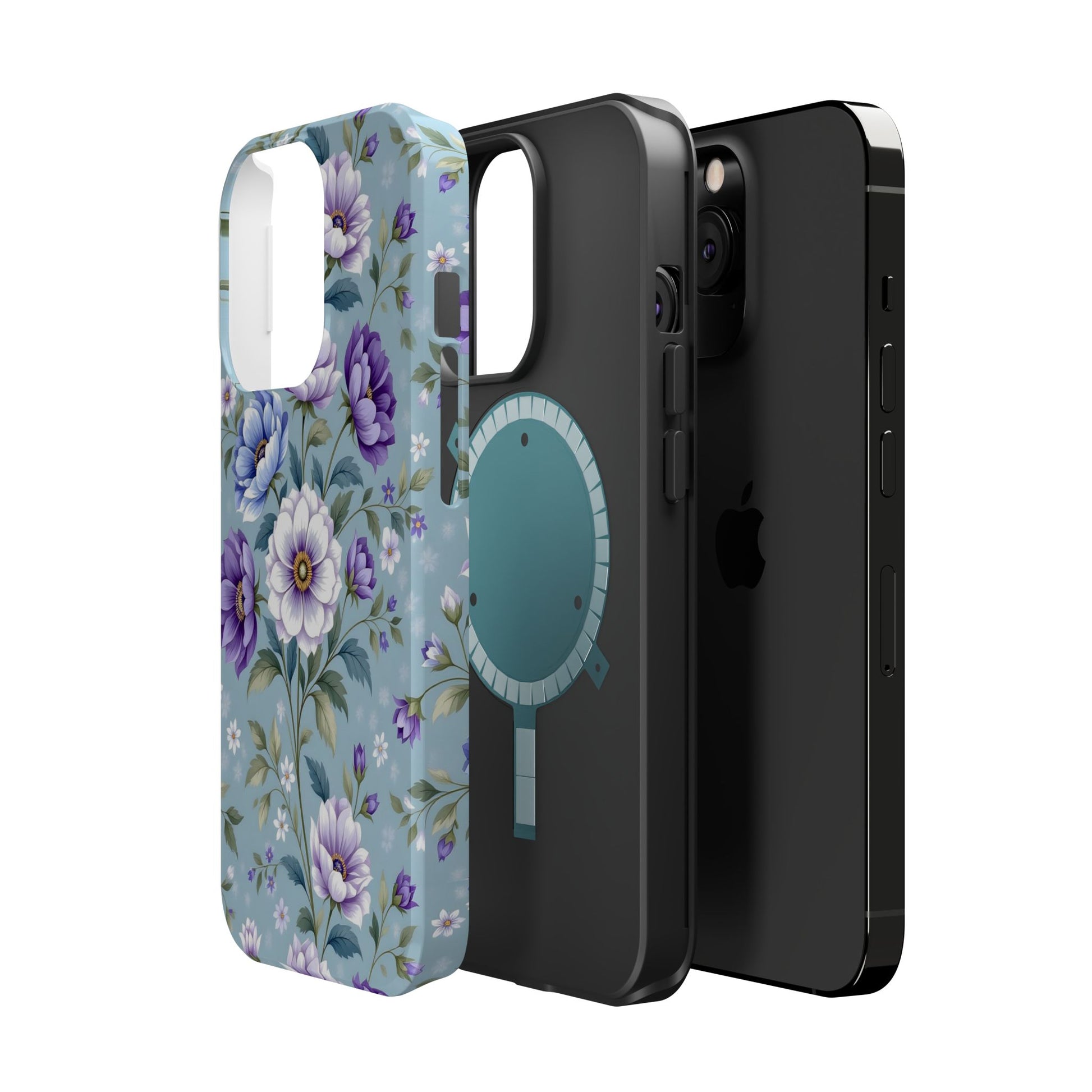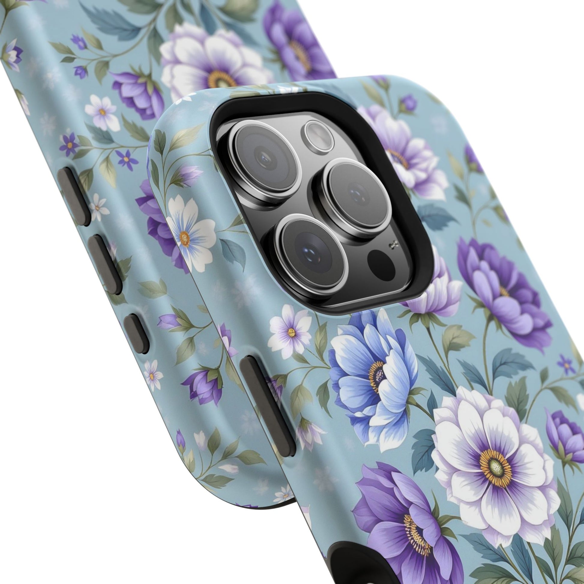A slim, impact-resistant phone case with a soft vintage floral print that brings quiet romance to everyday carry. The full-wrap design shows layered purple and white blossoms against a muted blue background, finished in your choice of glossy or matte. Inside, a cushioned black TPU liner absorbs shocks while the rigid polycarbonate shell resists scratches and keeps the print vivid. Built-in magnets support MagSafe-style accessories so your routine stays effortless — slide it on, snap on a charger or wallet, and head out with a little floral calm at your fingertips.