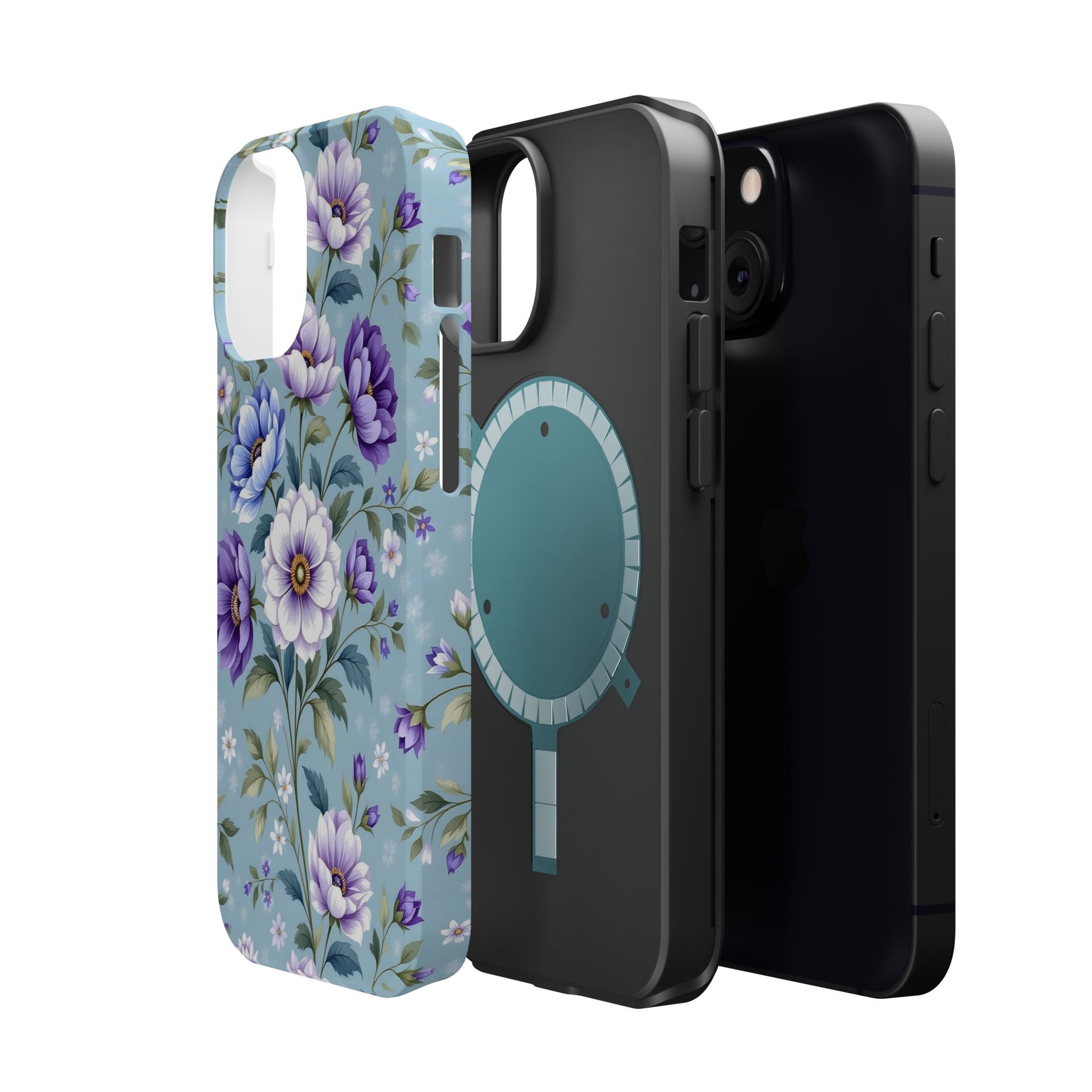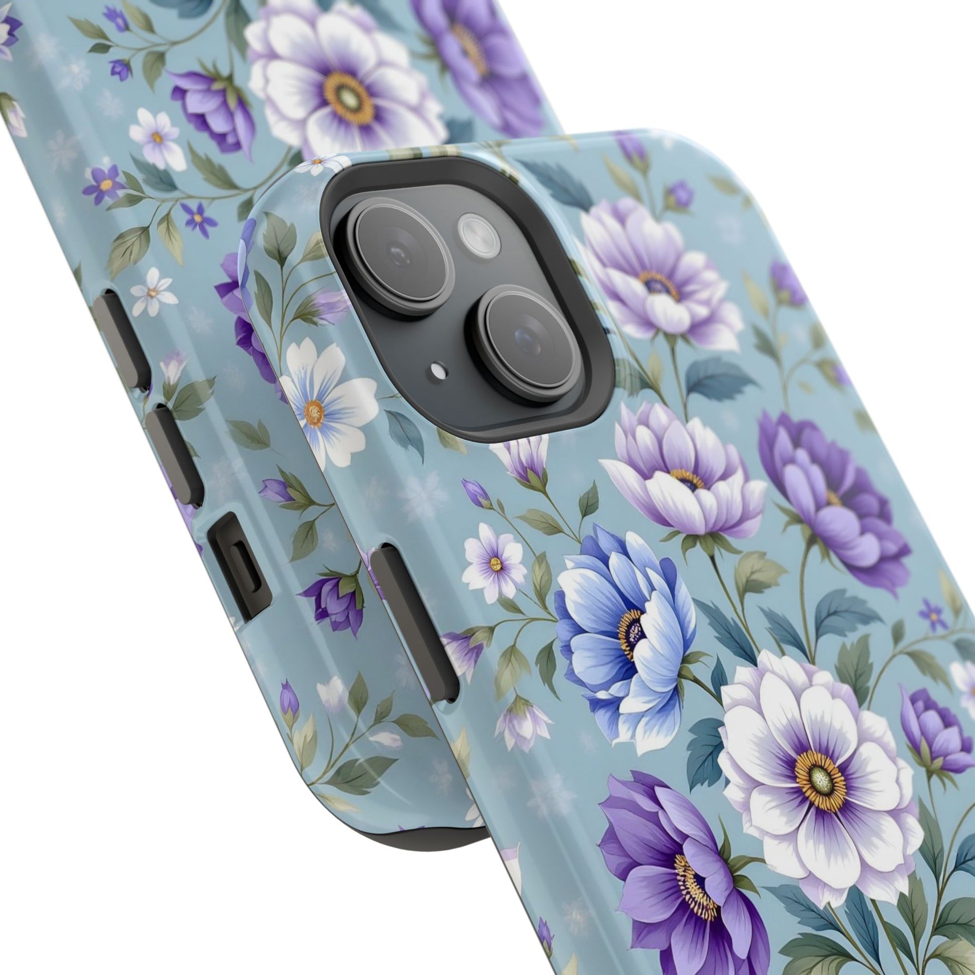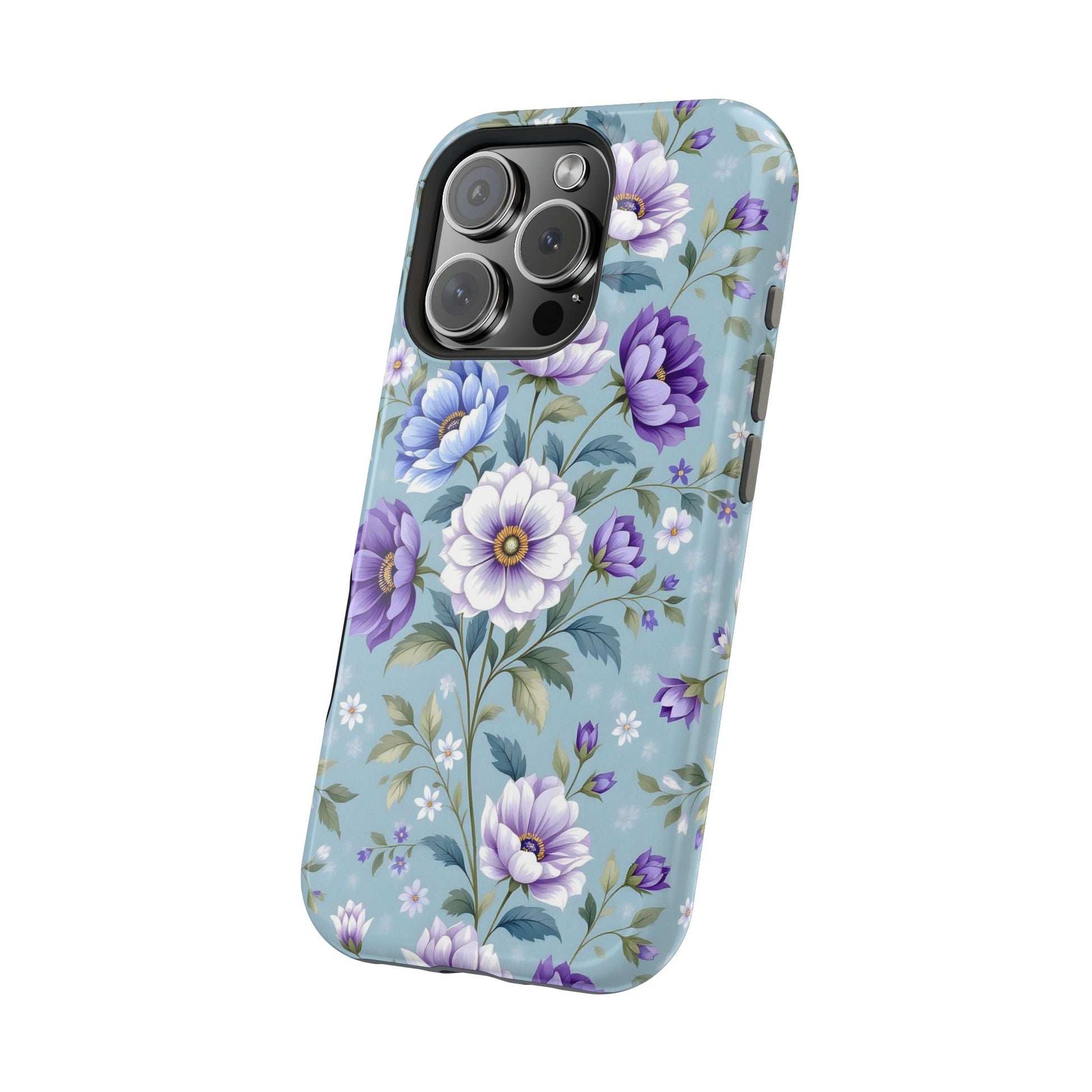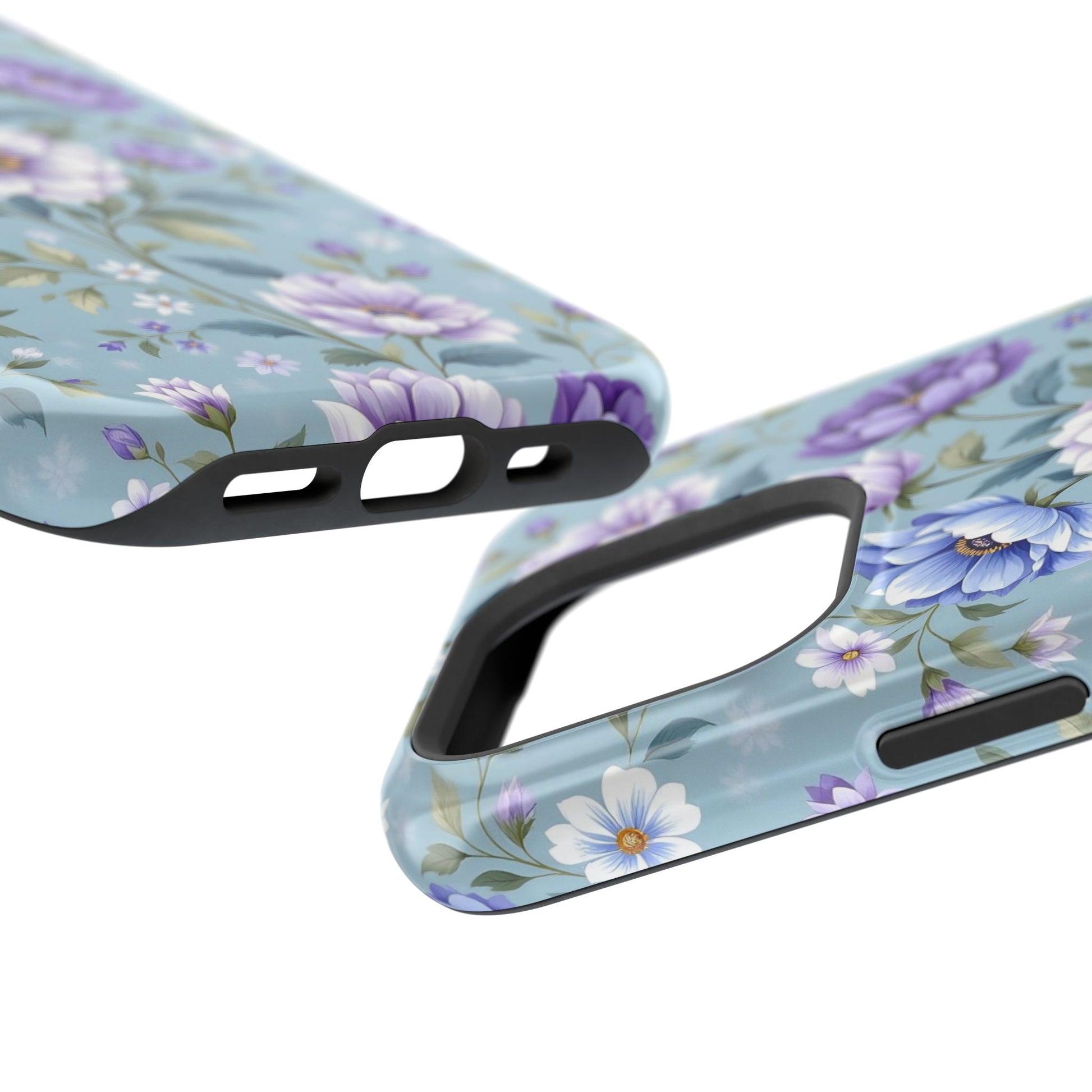 A slim, impact-resistant phone case with a soft vintage floral print that brings quiet romance to everyday carry. The full-wrap design shows layered purple and white blossoms against a muted blue background, finished in your choice of glossy or matte. Inside, a cushioned black TPU liner absorbs shocks while the rigid polycarbonate shell resists scratches and keeps the print vivid. Built-in magnets support MagSafe-style accessories so your routine stays effortless — slide it on, snap on a charger or wallet, and head out with a little floral calm at your fingertips.