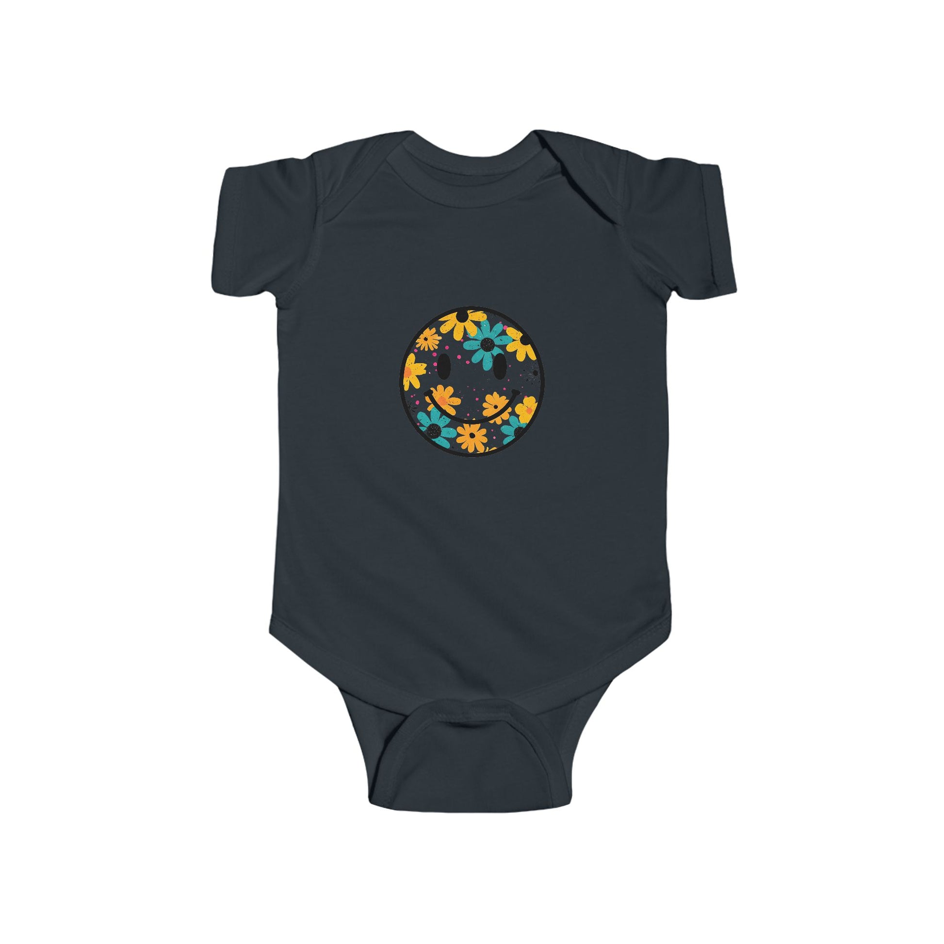 A soft, breathable bodysuit designed for everyday snuggles and sunny strolls. The lightweight combed ringspun cotton feels gentle against newborn skin while ribbed knit binding at the neck and sleeves lets tiny arms move freely. A cheerful floral smile graphic on the chest brings a warm, playful note — the kind of small detail that sparks a grin during diaper changes or photo moments. Side seams and reinforced snaps keep the shape intact across washes and make dressing quick and simple. REACH-certified materials and a tear-away label show attention to comfort and safety so little ones stay cozy and parents stay relaxed.