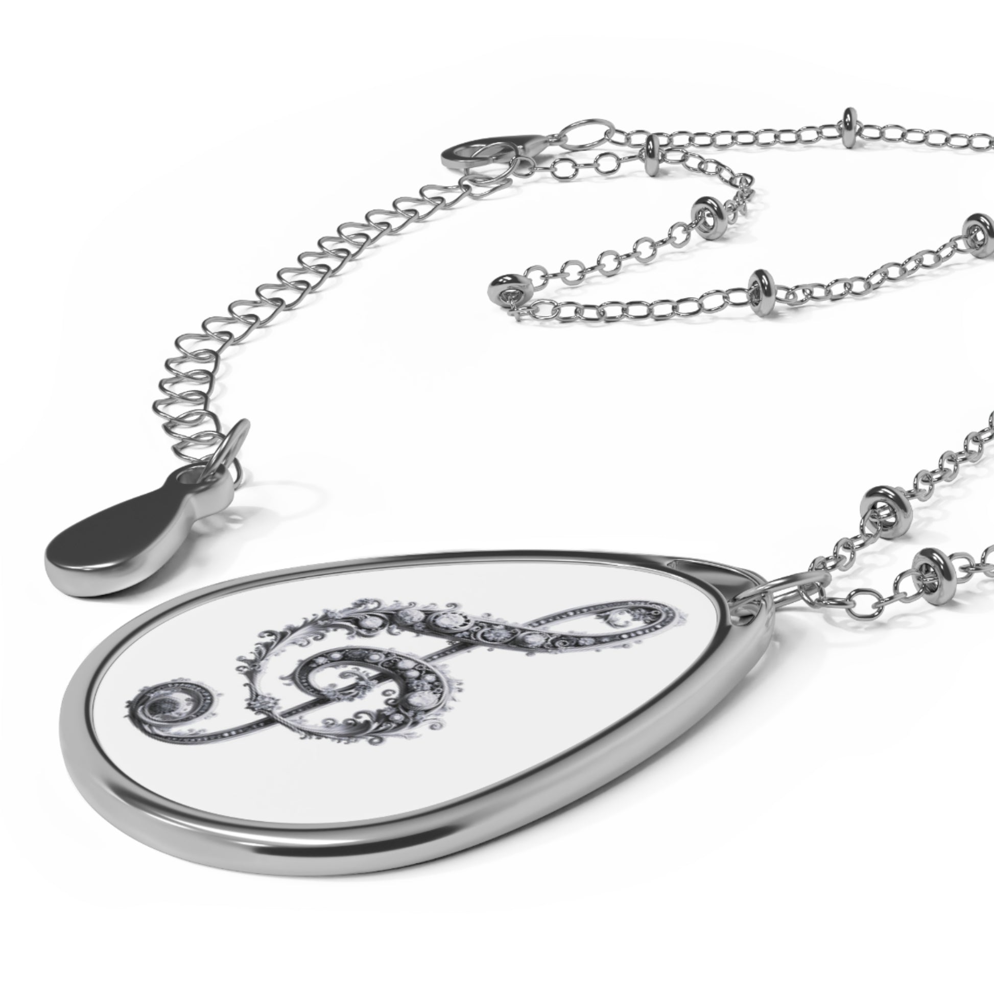 A delicate ellipse pendant that turns a simple melody into wearable memory. The glossy, full-color print sits on a white aluminum surface, so designs sing with bright, crisp tones. The teardrop silhouette rests close to the collarbone on a slender zinc-alloy chain threaded with tiny accent beads. A sturdy lobster clasp keeps the piece secure while the smooth metal back offers a sleek, mirror-like finish. Wear it to carry a favorite tune, a meaningful symbol, or a custom illustration — a quiet, personal accent that feels both modern and intimate.