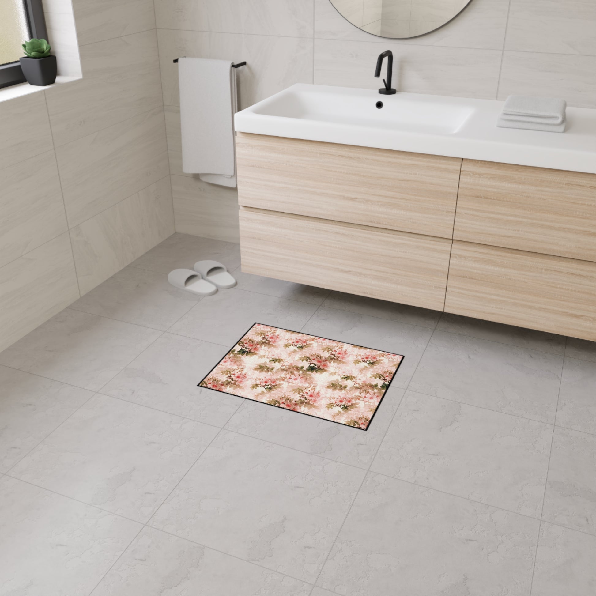 Lay down a warm, vintage bloom where you need a touch of calm. This heavy-duty floor mat pairs a soft, watercolor floral pattern in blush and sage with a tough polyester face and textured rubber back — it feels like a gentle welcome underfoot but stands up to daily traffic. The subtle black trim frames the design, making doorways, entryways, or a cozy reading nook instantly feel curated. Colors stay vivid thanks to crisp printing, and the anti-slip backing keeps the mat settled while you come and go. Assembled in the USA, it blends practical durability with an easy, lived-in charm that complements cottage, shabby-chic, and vintage-inspired spaces.