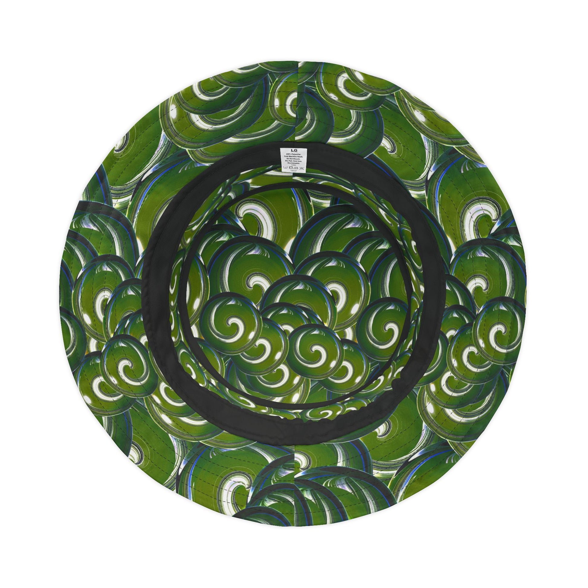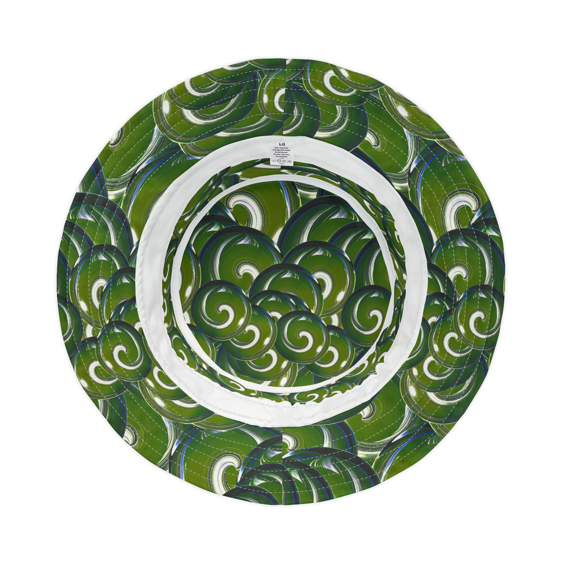 This green swirl bucket hat brings playful motion to sunny days and crowded festival fields. The all-over print mixes deep forest tones with lively, looping white accents — like leaves caught in a gust. Lightweight polyester keeps the hat breathable and resilient, while visible top-and-brim stitching gives it a hand-sewn, streetwise edge. Choose one of two stitching colors and pick the size that fits your head; a neat sewn-in label adds a discreet, quality finish. Wear it low over your eyes for shade on long walks, or tipped back while dancing to a late set — it moves with you, not against you.