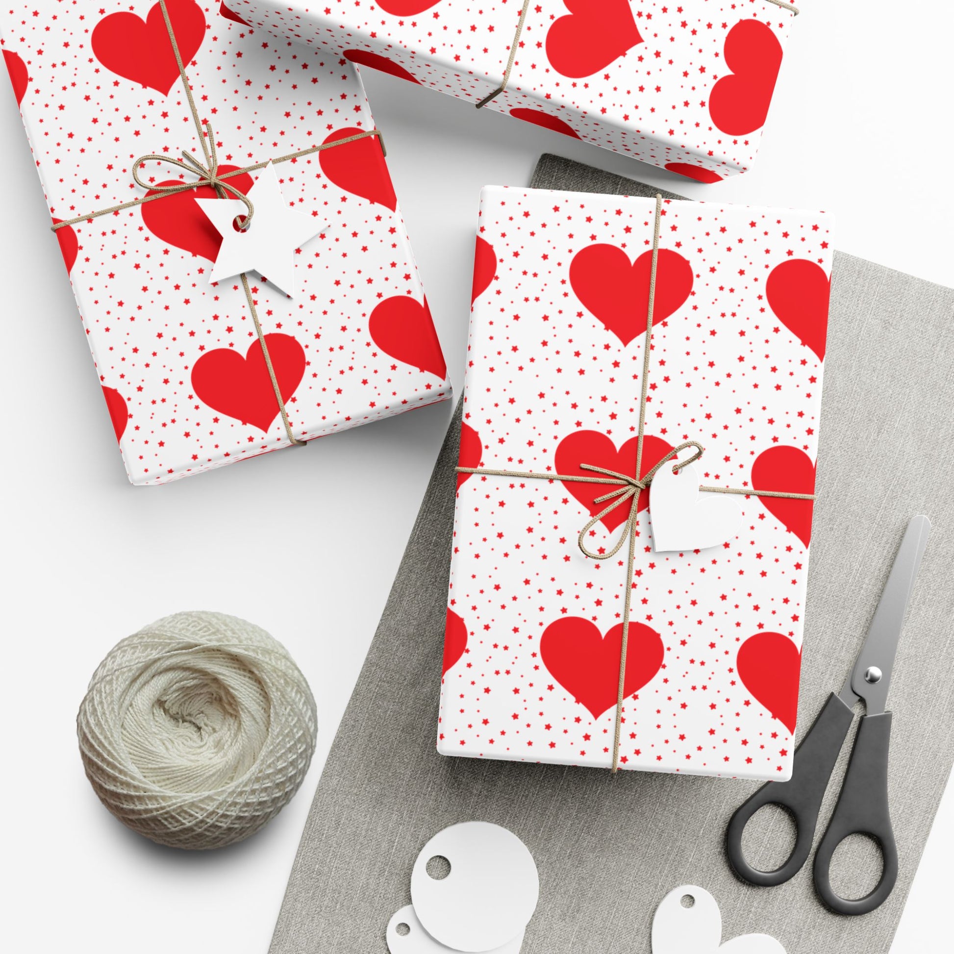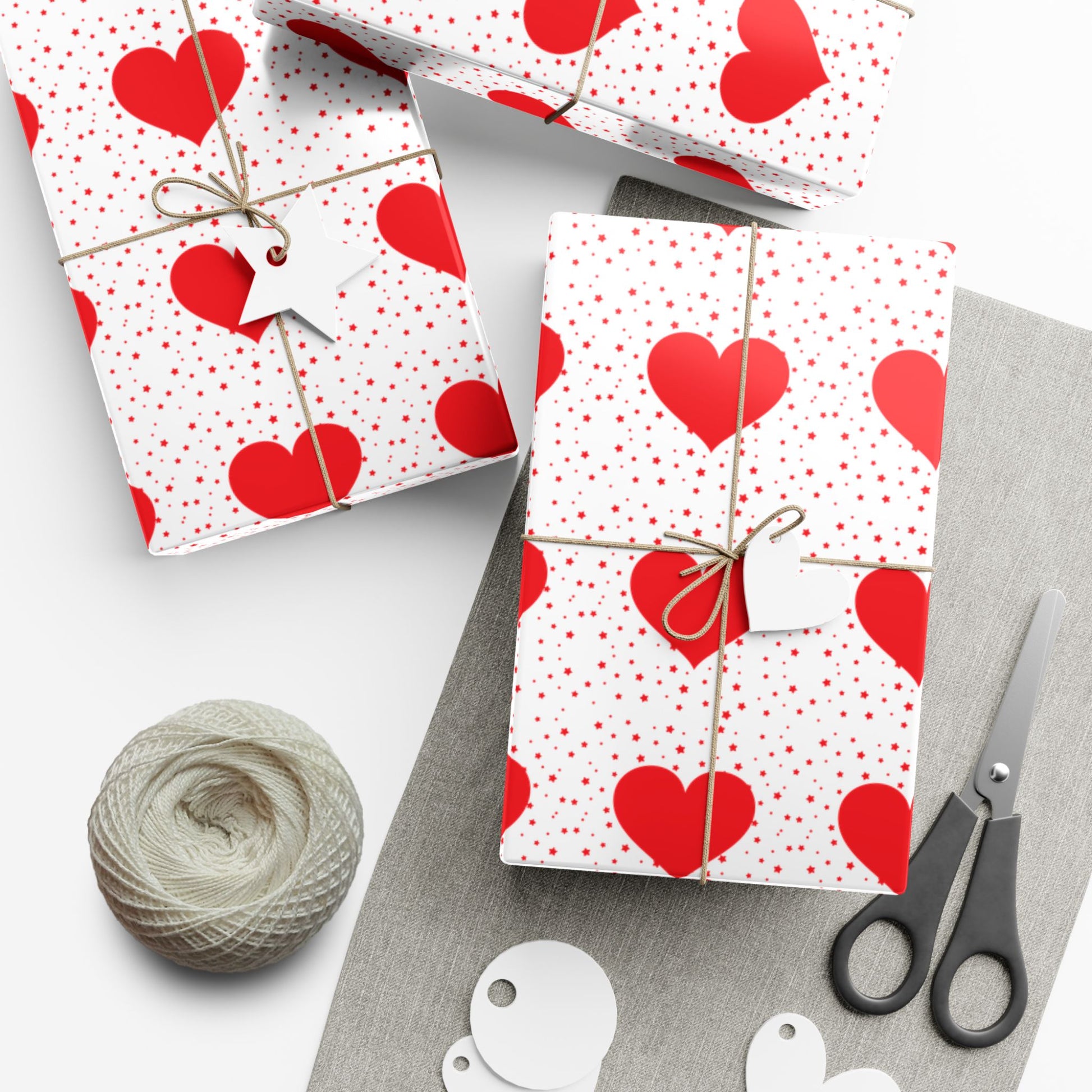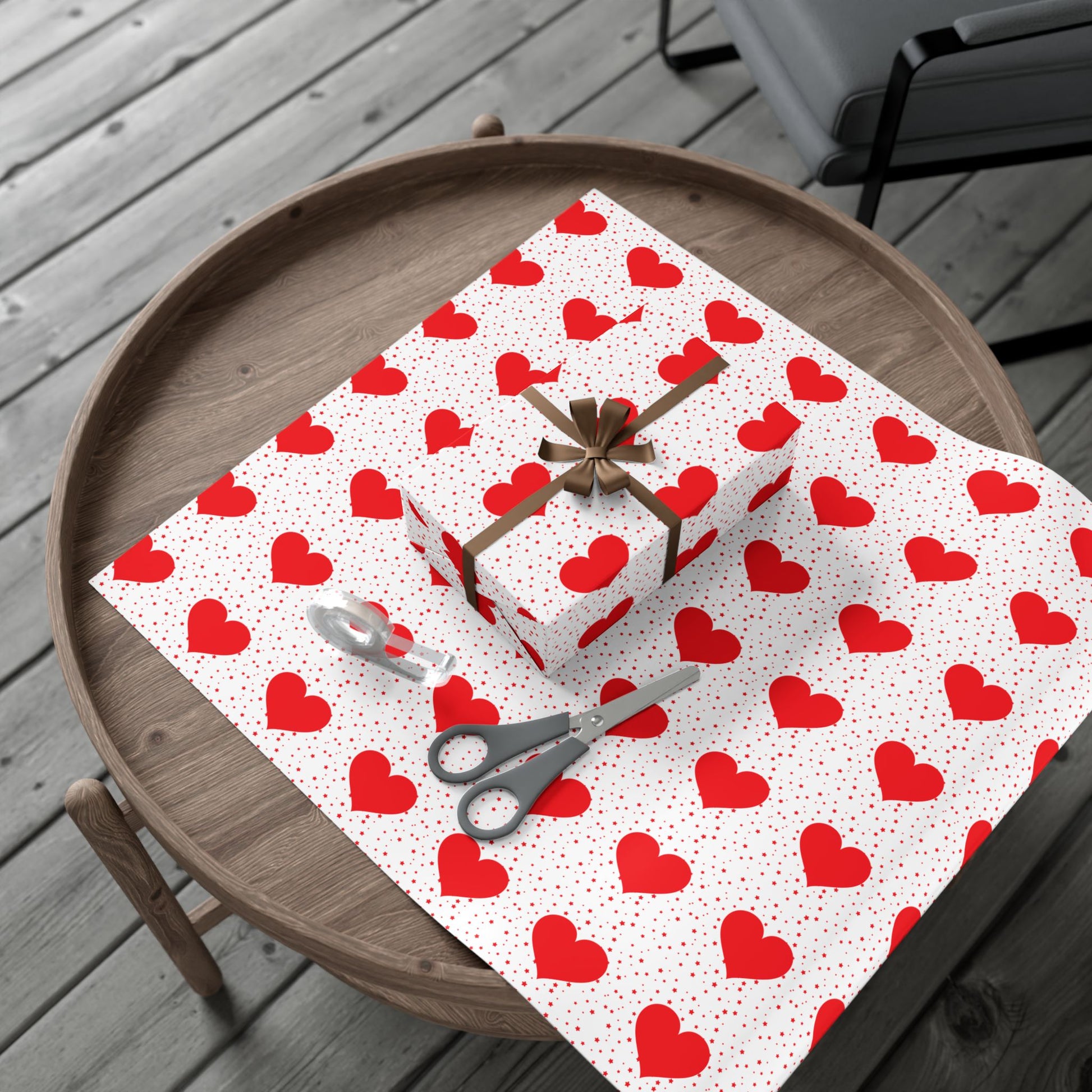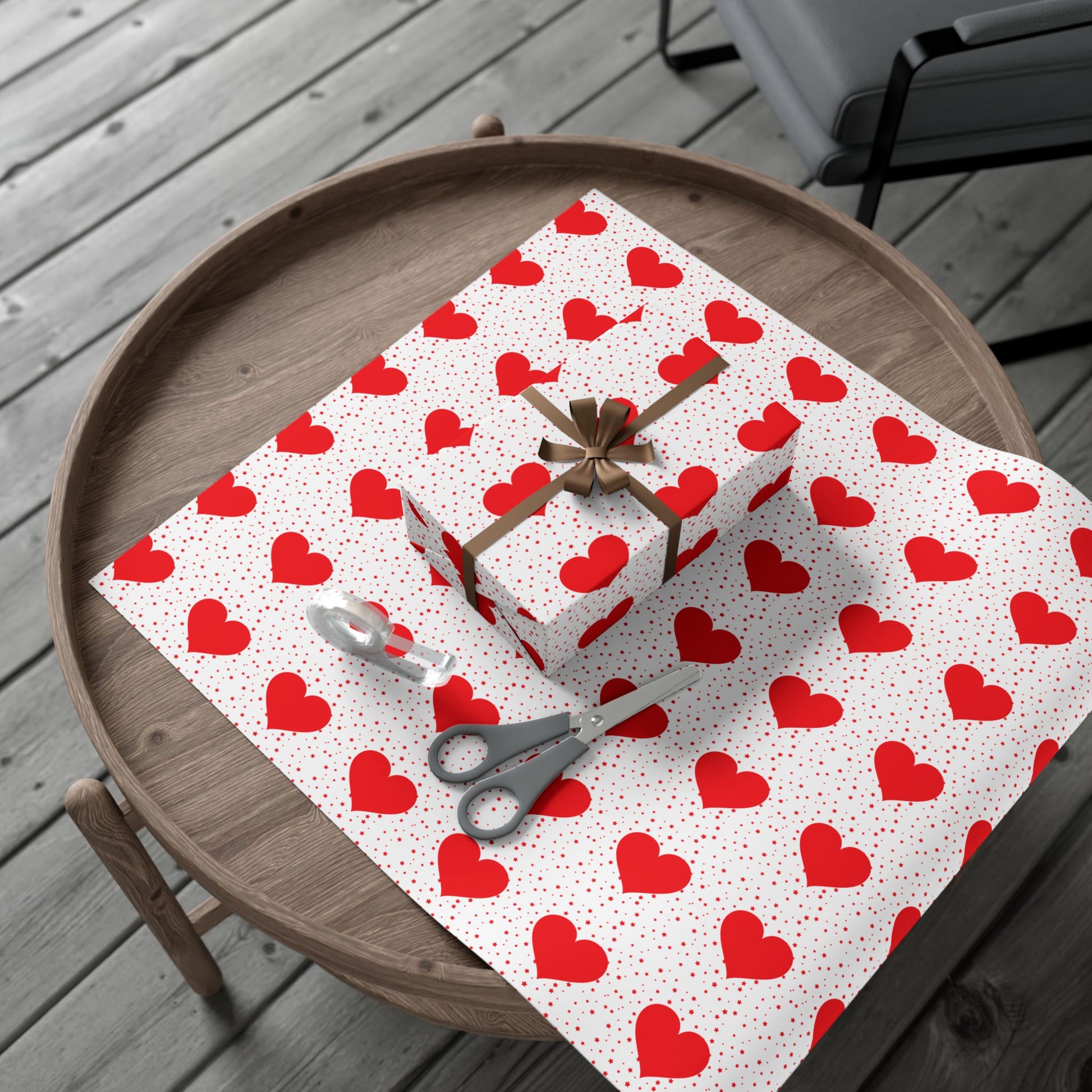 Bright, heart-patterned gift wrap that brings warmth to every present. The repeating red hearts sit on a soft white field peppered with tiny confetti dots, creating a playful yet elegant look that reads as both festive and heartfelt. Choose satin for a luminous sheen that catches light, or matte for a modern, tactile finish. The paper is durable and flexible — it folds cleanly without cracking, resists scratches and light moisture, and holds crisp creases for neat corners. Printed with water-based, Greenguard UL Certified inks, the sheets deliver vivid, long-lasting color while meeting strict safety and environmental standards. Recyclable and made from 100% paper, this wrap arrives ready to dress gifts for anniversaries, birthdays, Valentine’s moments, or cozy gatherings where thoughtful presentation matters.