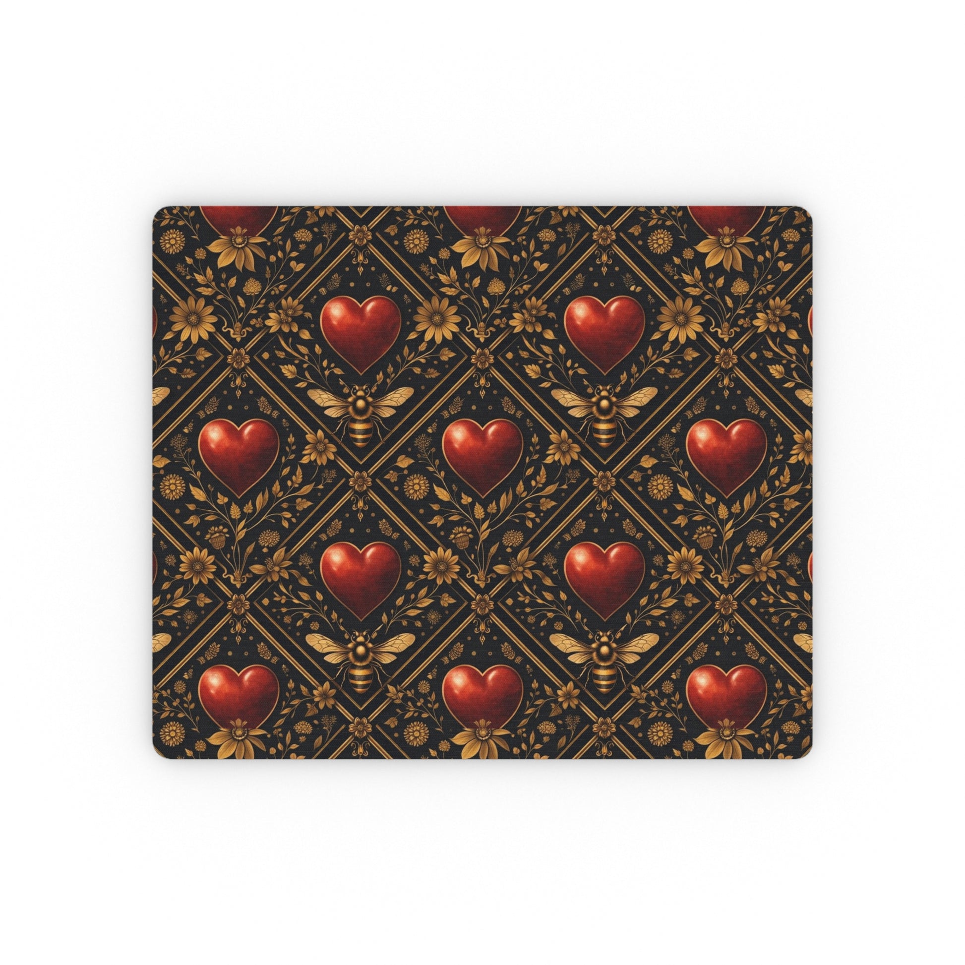 A richly patterned mouse pad that turns a work surface into a little cabinet of curiosities. Deep, burnished blacks and antique-gold filigree frame rows of glossy red hearts, giving the piece a vintage, romantic edge. The low-profile cloth top feels smooth under the hand and the optical-friendly surface keeps cursor tracking precise. Sturdy rubber backing holds the pad in place while you sketch, game, or power through spreadsheets. It’s the kind of desk detail that quietly lifts the mood every time you reach for the mouse.