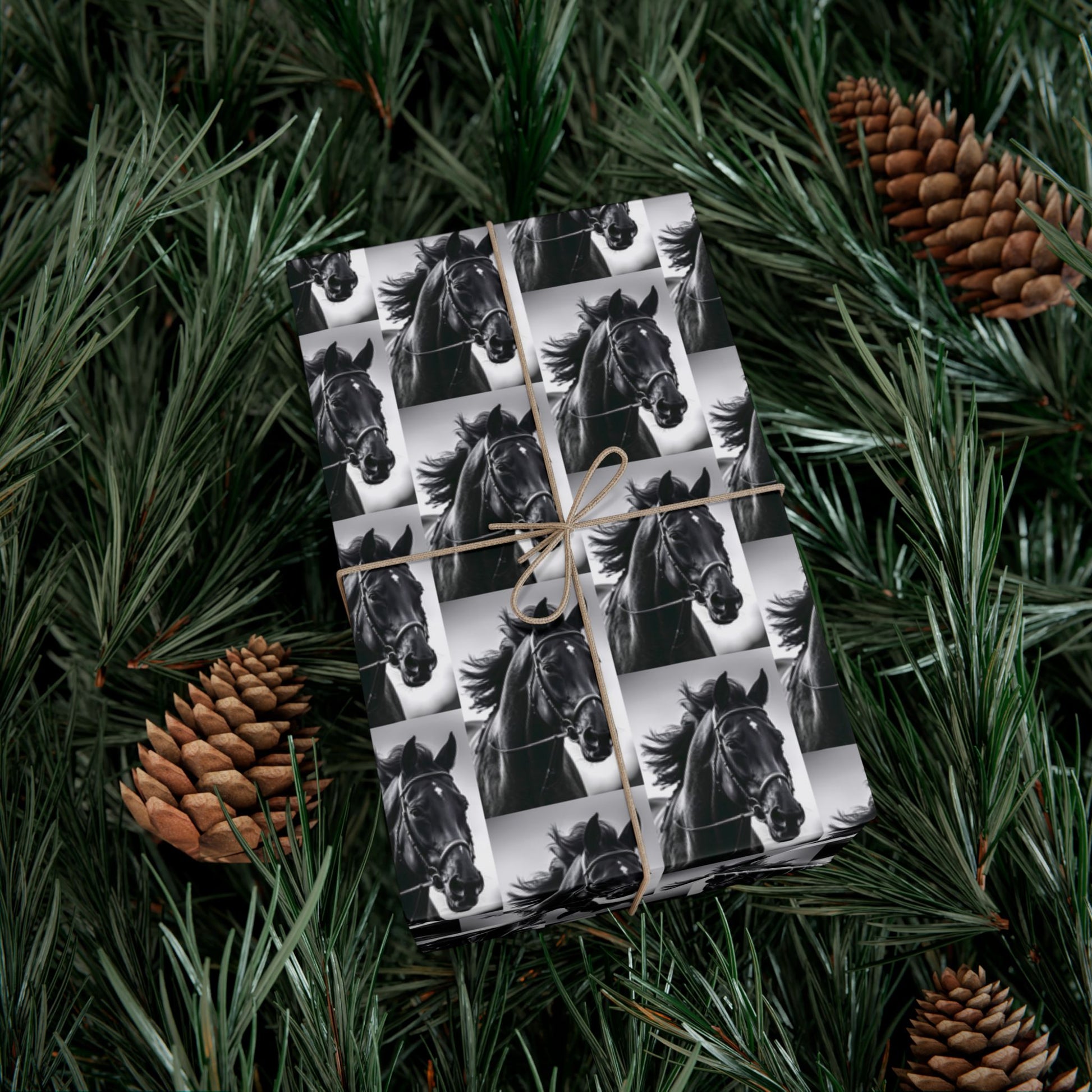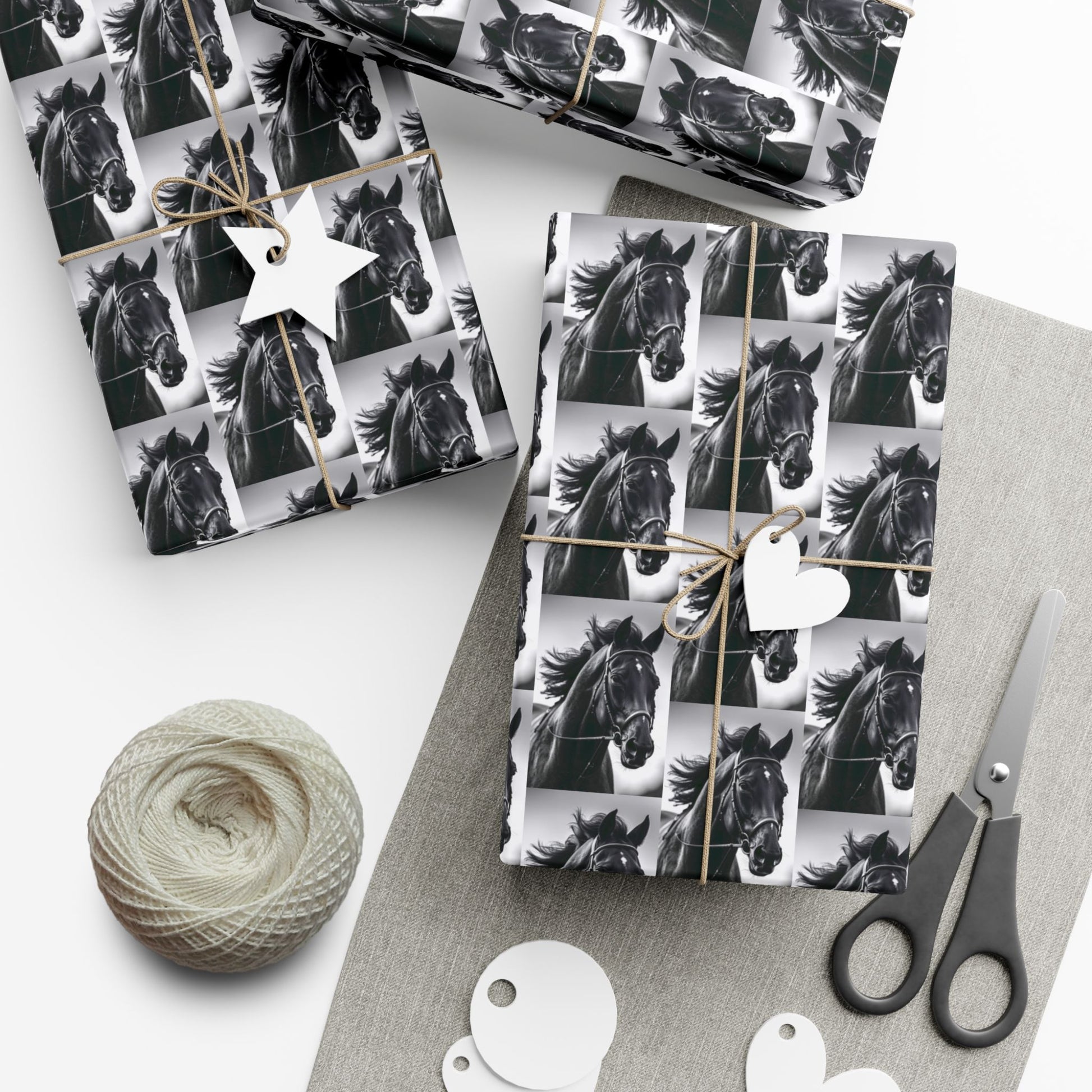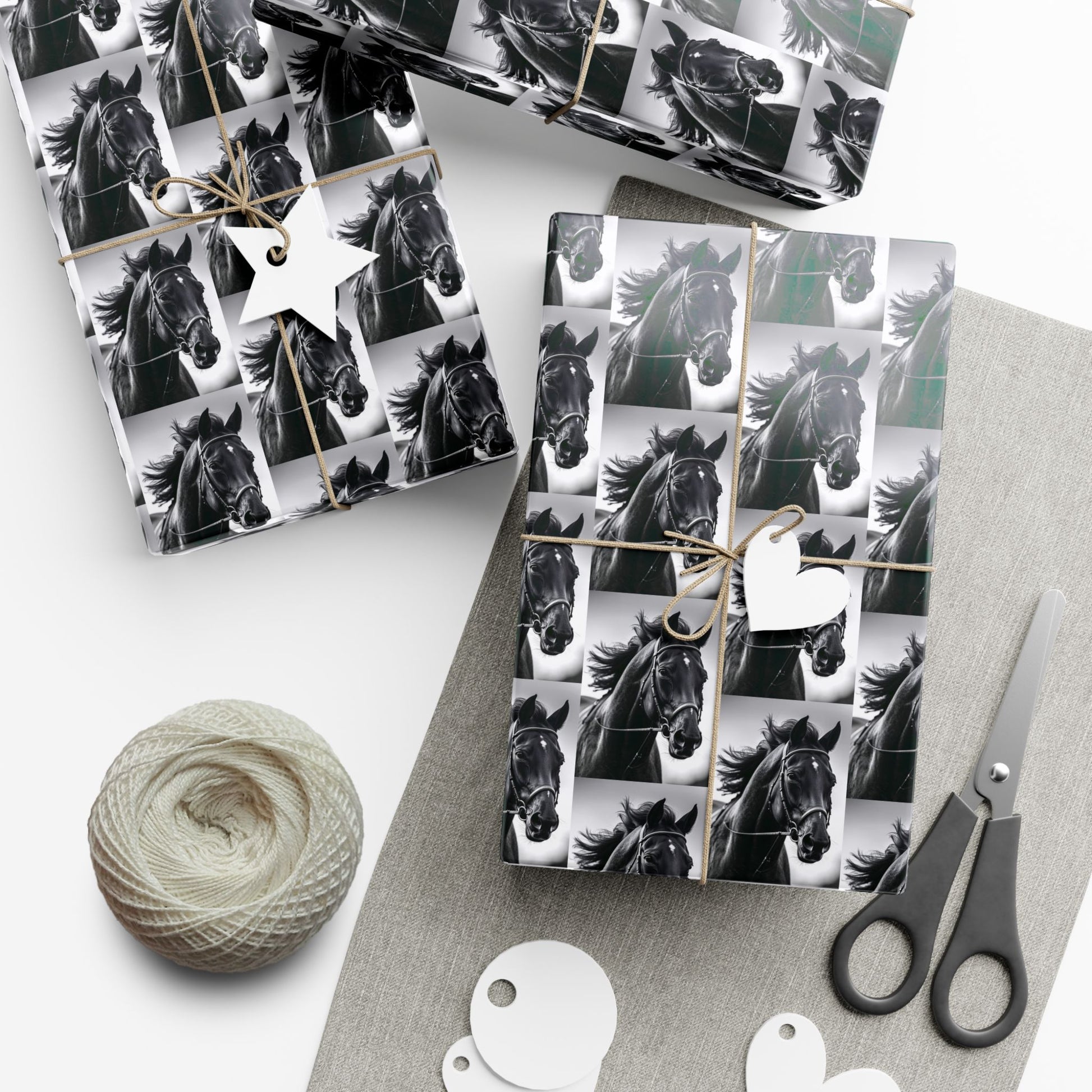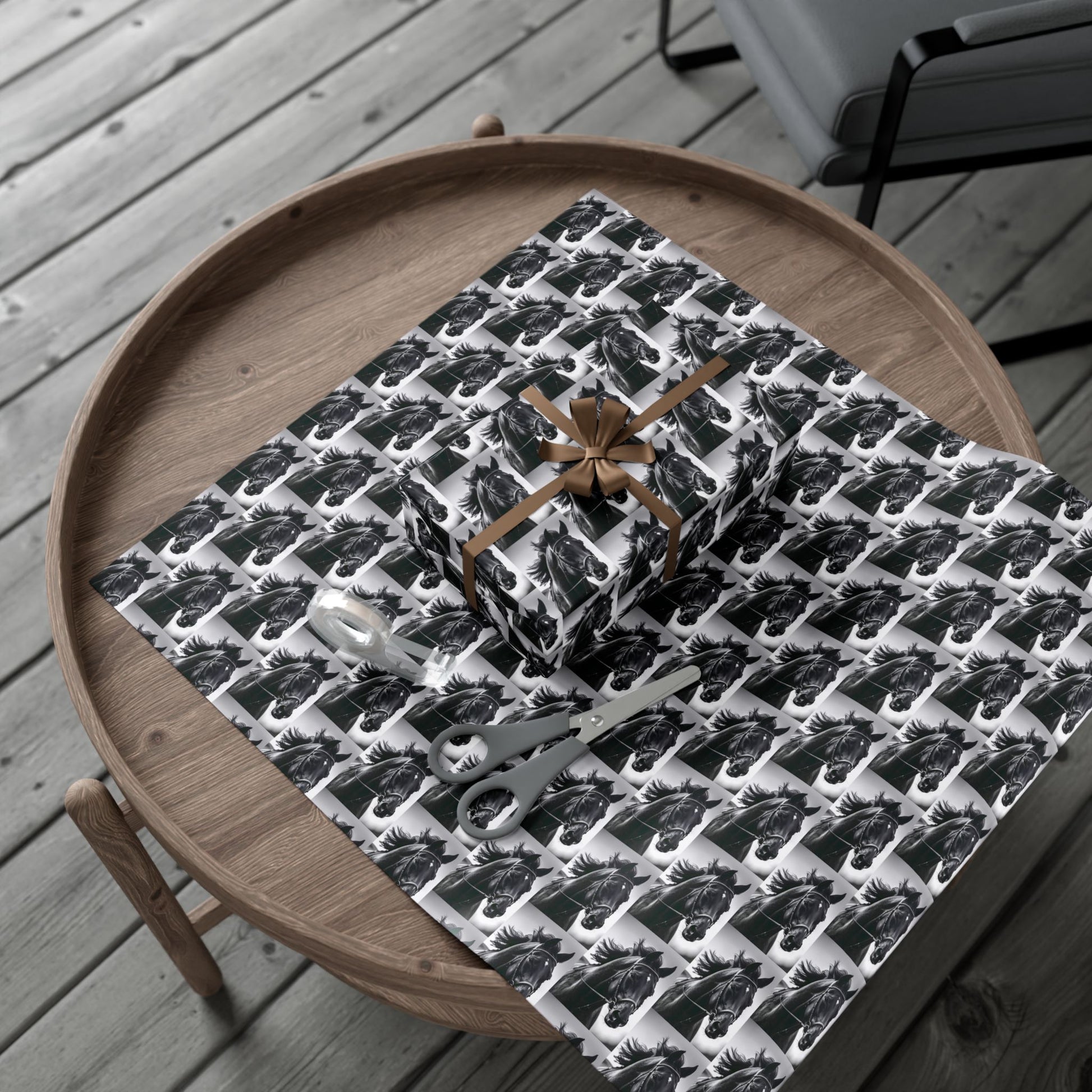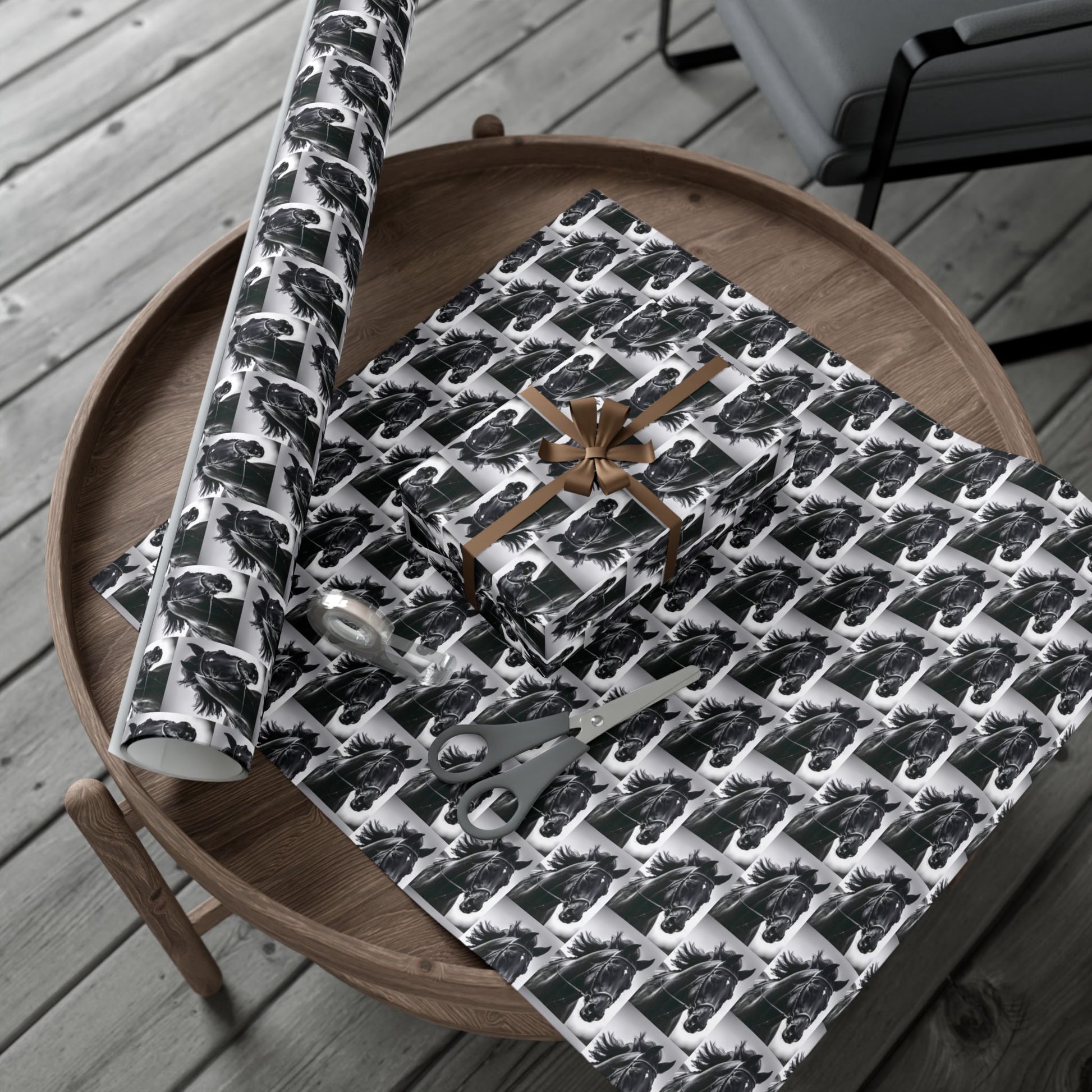 This gift wrap is made for people who love bold, monochrome style with a touch of wild spirit. The repeating black-and-white horse portrait creates a rhythmic, vintage-meets-modern look that reads as both elegant and energetic. The paper feels substantial and smooth — pick satin for a subtle sheen or matte for a refined, low-gloss finish. It holds folds without cracking and resists scratches or light moisture so your wrapped boxes arrive looking crisp. Because the inks are water-based and Greenguard UL certified, the prints are bright without harsh chemicals. Use it to turn ordinary packages into statement-wrapped surprises for barn parties, equestrian-minded friends, or anyone who appreciates timeless animal imagery.