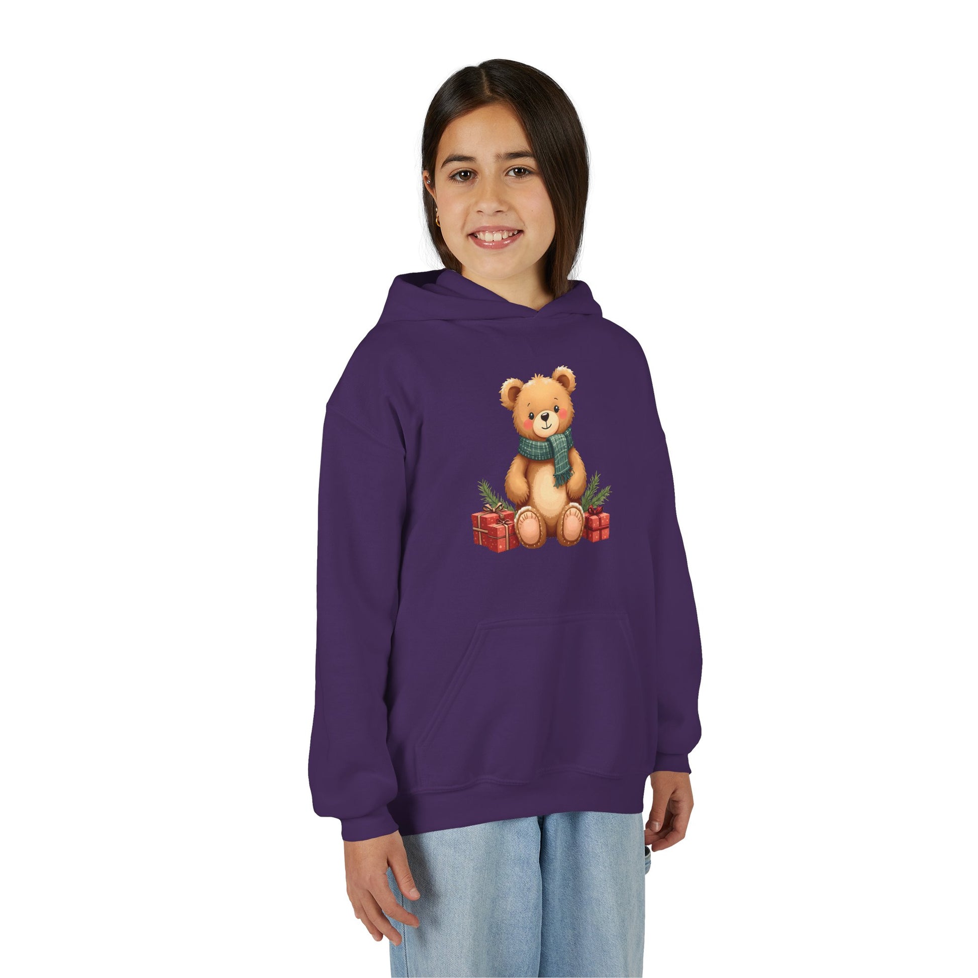 This cozy youth hoodie brings a small, warm moment to chilly days. A soft, illustrated teddy sits at the center, wrapped in a knitted scarf and flanked by tiny gift boxes — a gentle, nostalgic scene that reads like a hug. The medium-weight fabric and relaxed fit make it an easy layer for school mornings, holiday playdates, or quiet evenings by the fireplace. The kangaroo pocket keeps little hands warm and holds treasures found along backyard adventures. Subtle embroidery or printed wrist details add a handcrafted touch that children notice and parents appreciate.