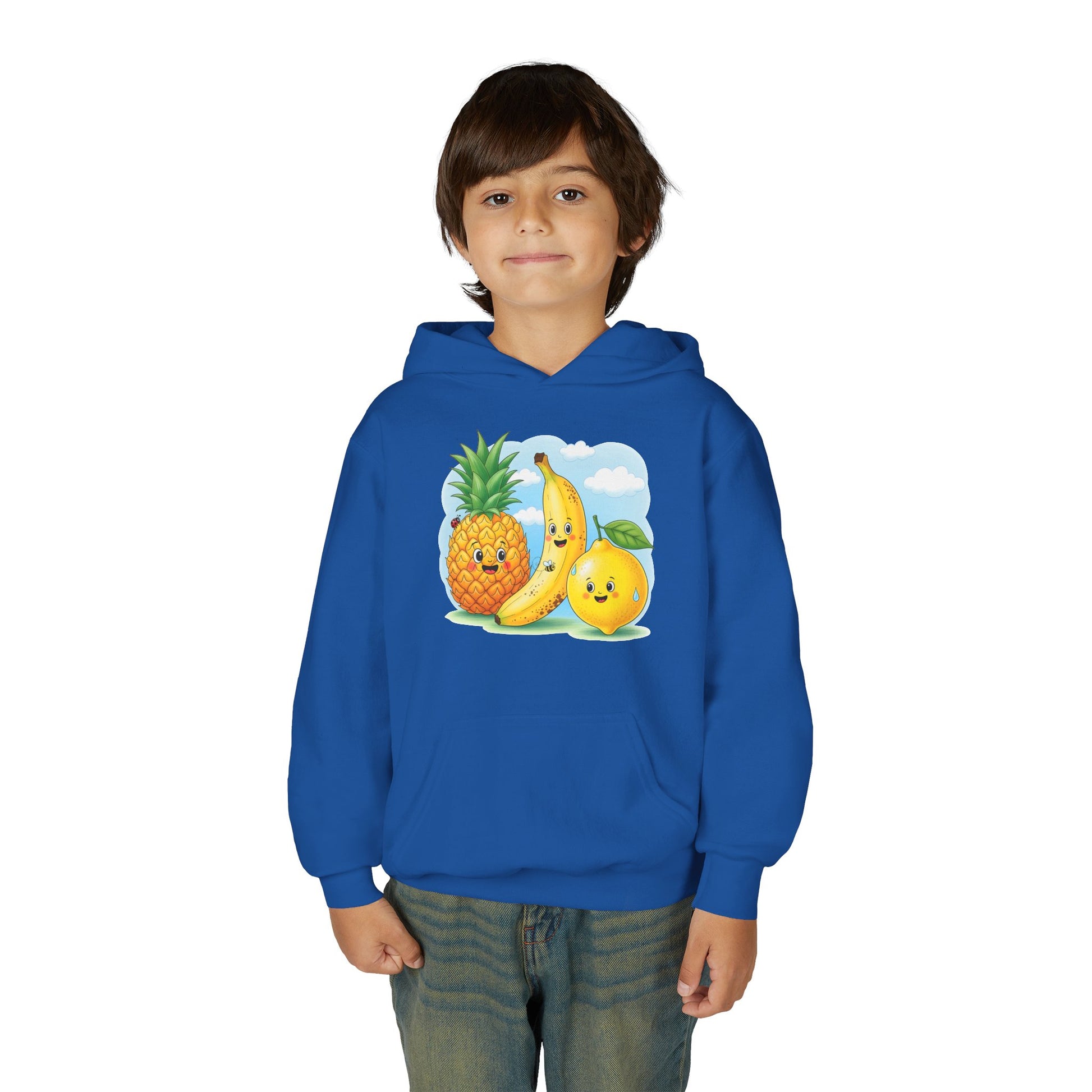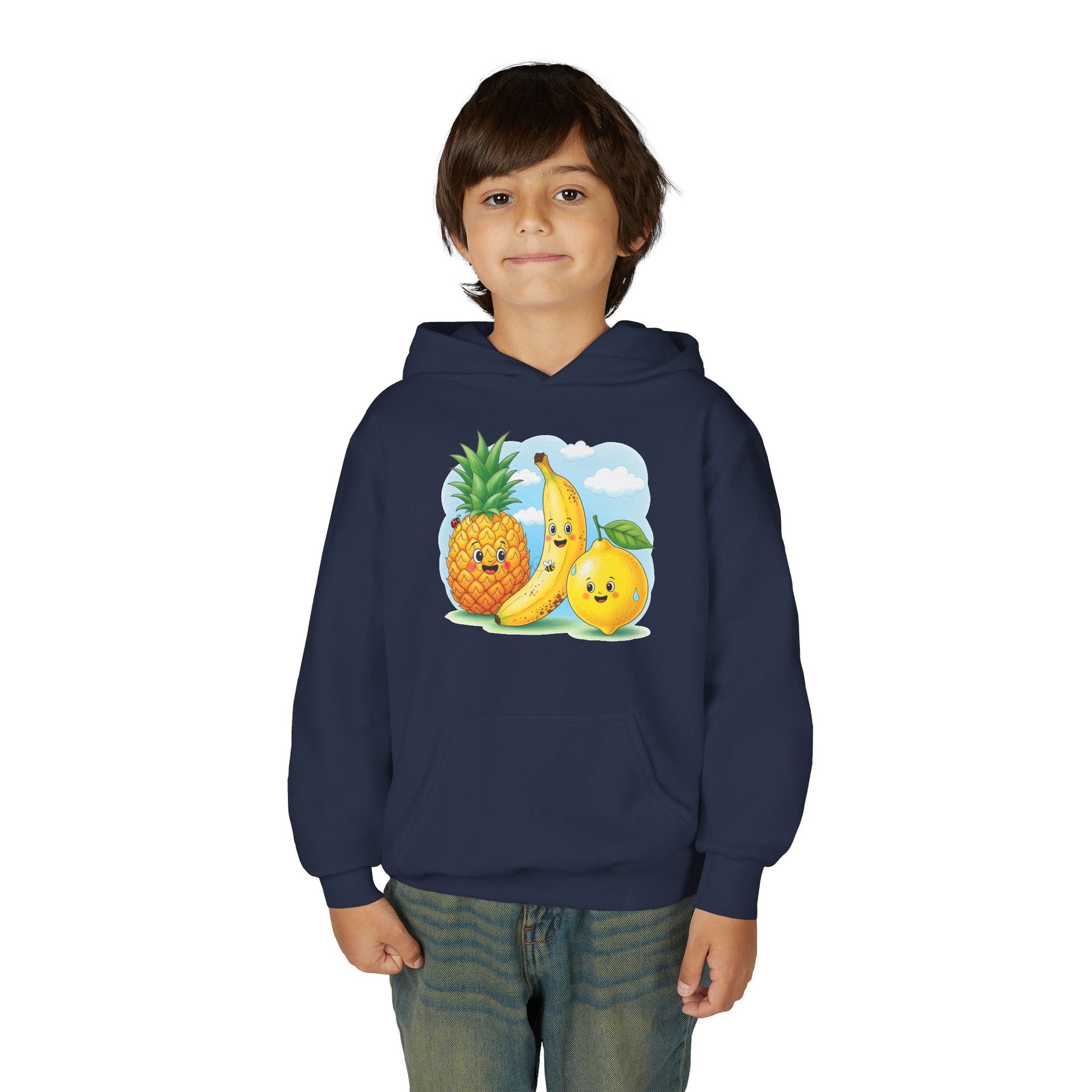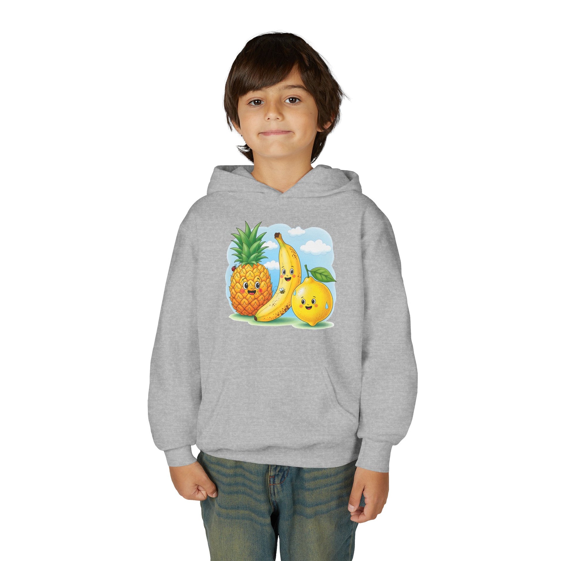 This cozy youth hoodie brings playful fruit characters to everyday wear. Soft yet sturdy midweight fabric keeps kids comfortable through playground adventures, while the roomy kangaroo pocket is perfect for little hands and hidden treasures. The cheerful pineapple, banana, and orange graphic adds a burst of color and friendly charm that sparks smiles on chilly mornings. Built with reinforced neck tape and reliable stitching, it stands up to active days and frequent washes. Offered with optional chest embroidery or durable DTF/DTG prints, this sweatshirt blends fun design with dependable construction — a warm layer kids will reach for again and again.