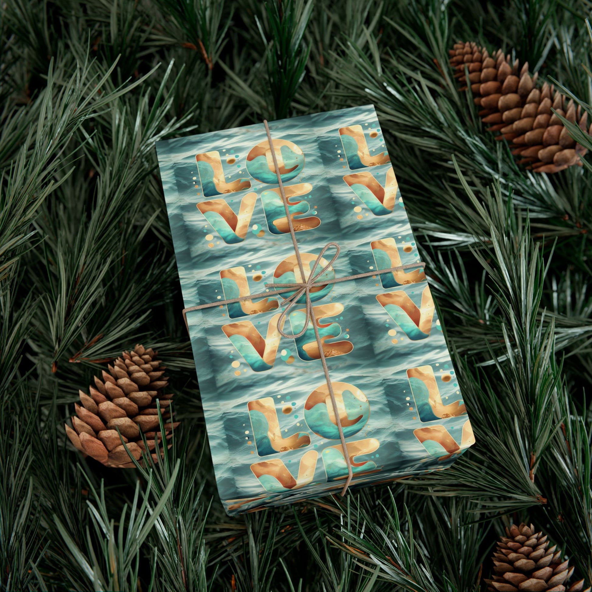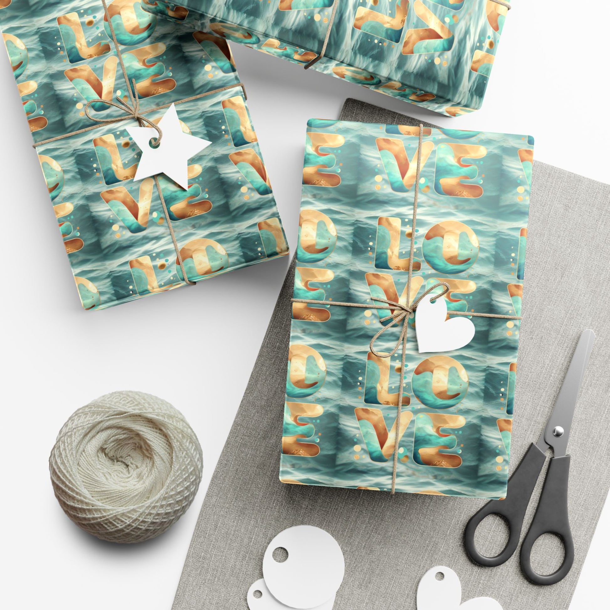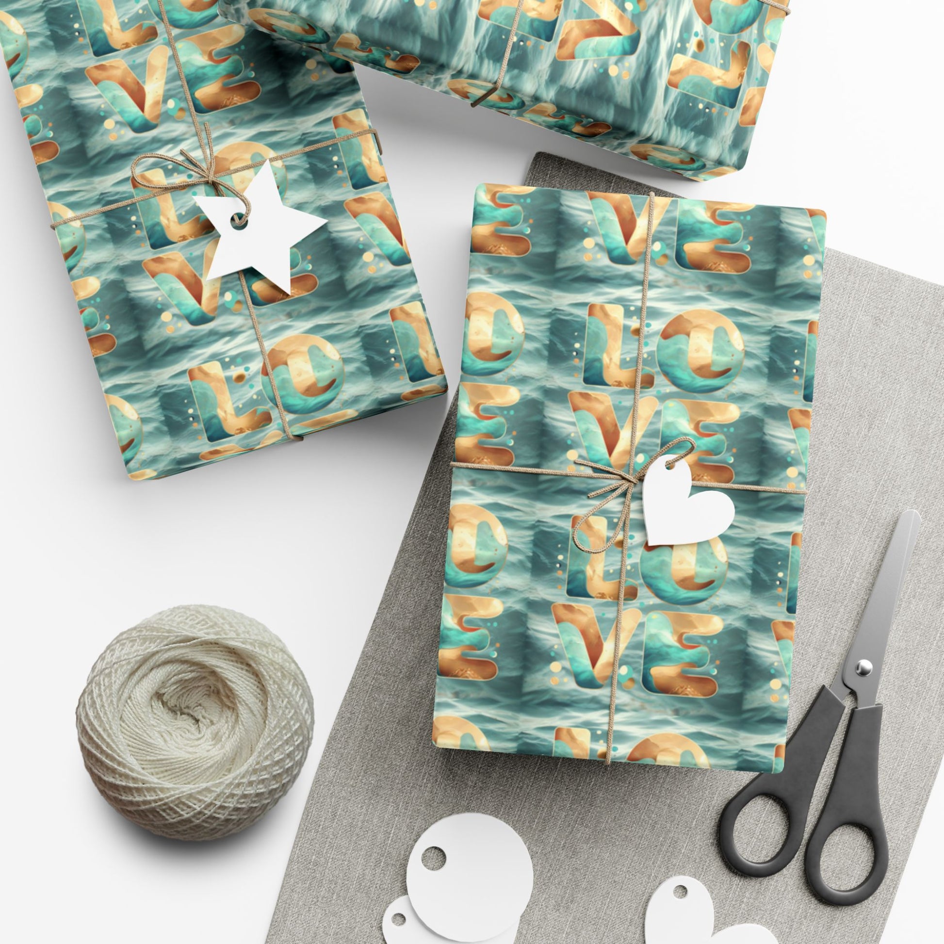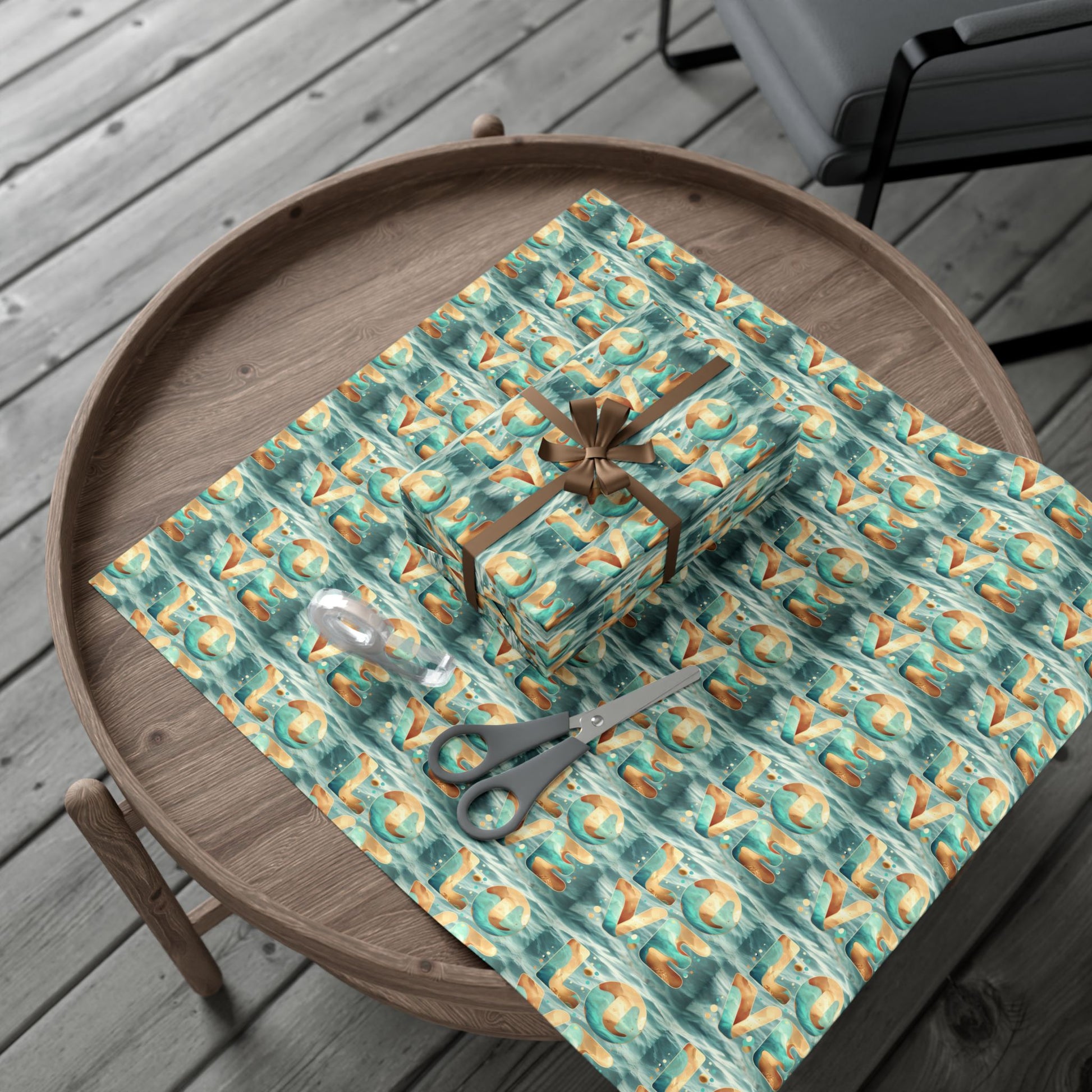 Soft waves of color roll across this printed gift wrap, where the letters L-O-V-E float like paper boats on a teal sea. The look reads handcrafted and artful — an easy way to dress a present with personality. The finish options let you choose either a gentle satin sheen that catches light or a refined matte that feels understated and modern. Because the paper is durable and resistant to scratches, water, and cracking at folds, it stays crisp from wrapping table to unwrapping moment. Printed with water-based, Greenguard UL Certified inks and fully recyclable, it brings a thoughtful, eco-aware touch to celebrations, whether you're dressing holiday surprises or small tokens for intimate gatherings. Assembled in the USA, this wrap blends vibrant color and lasting quality so your wrapped gifts look cared for before the ribbon is even tied.