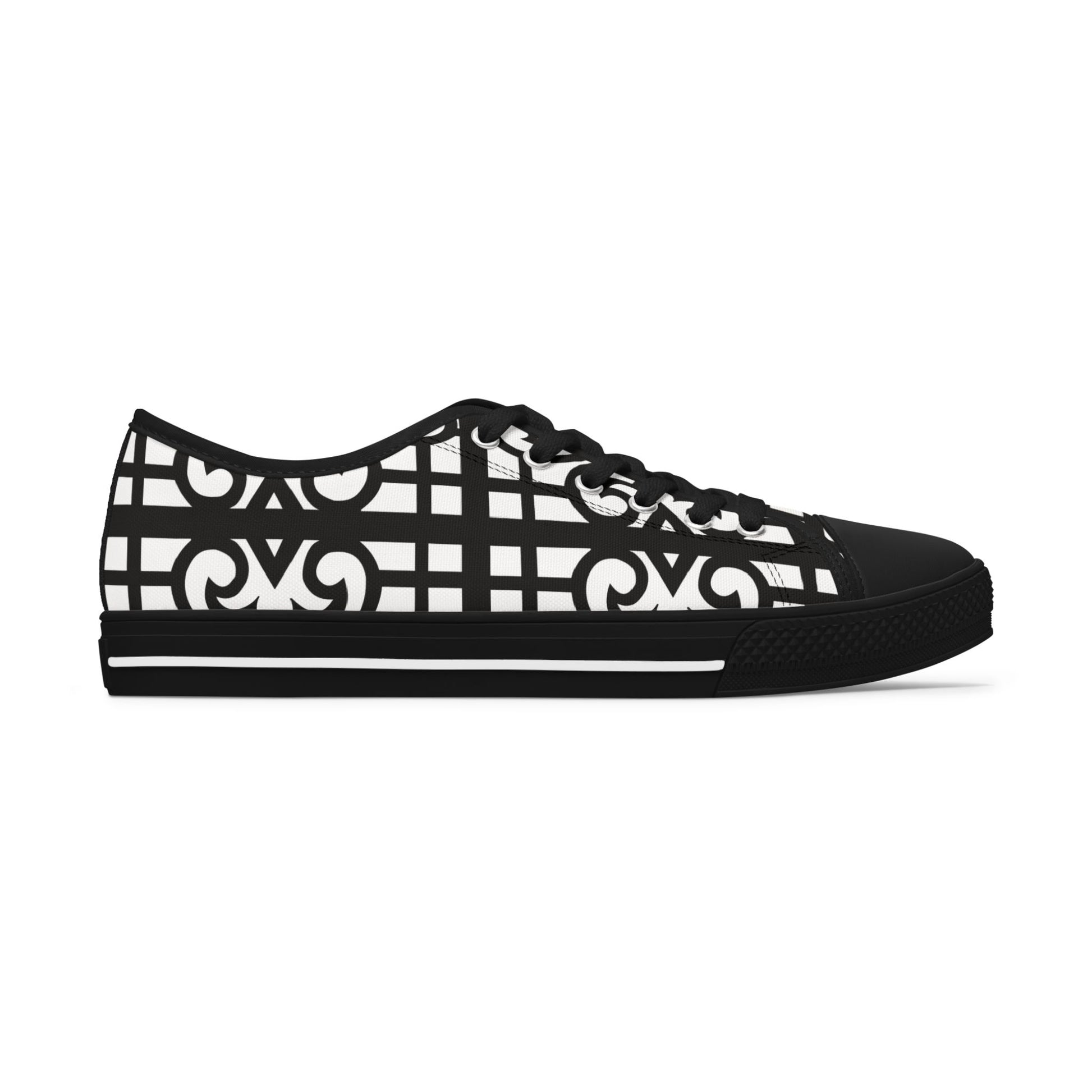 These low-top canvas sneakers blend bold monochrome graphics with everyday comfort. The black-and-white lattice and scroll pattern wraps around the whole shoe — sides and tongue — for a cohesive, eye-catching look that reads modern and a little vintage at once. Soft polyester canvas, pleather-reinforced toe, and memory foam insoles keep steps light and comfortable, while an EVA shock-absorbing midsole and durable rubber outsole stand up to daily wear. Silver metal eyelets, clean black-or-white trim options, and full-wrap printing give them a polished, wearable-art vibe that pairs easily with jeans, skirts, or casual workwear.