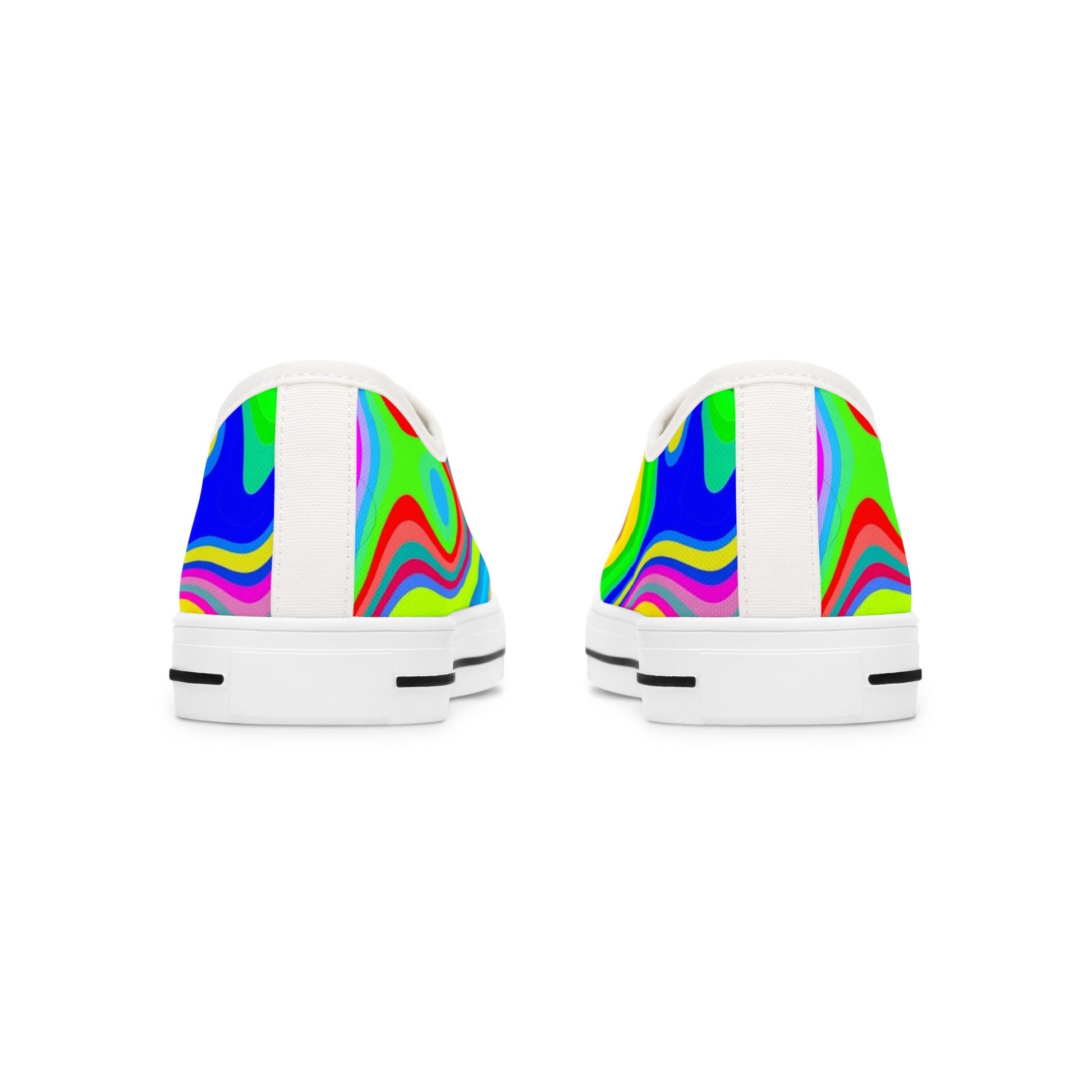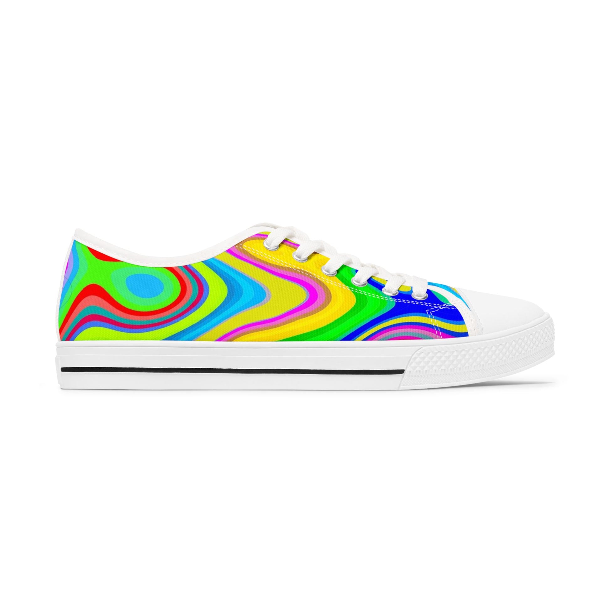 Slide into color and movement. These low-top canvas sneakers wear a swirling, neon-marble print that feels like a summer street festival on your feet. Lightweight EVA cushioning and memory foam insoles keep steps bouncy and easy; the pleather-reinforced toe and rubber outsole stand up to city sidewalks and long days on your feet. Bright, full-wrap artwork covers both sides and the tongue so your look reads from every angle. Pair them with denim, a slip dress, or a bold graphic tee to let the colors lead the outfit — they bring an upbeat, playful energy to afternoons at the market, art openings, or weekend coffee runs.