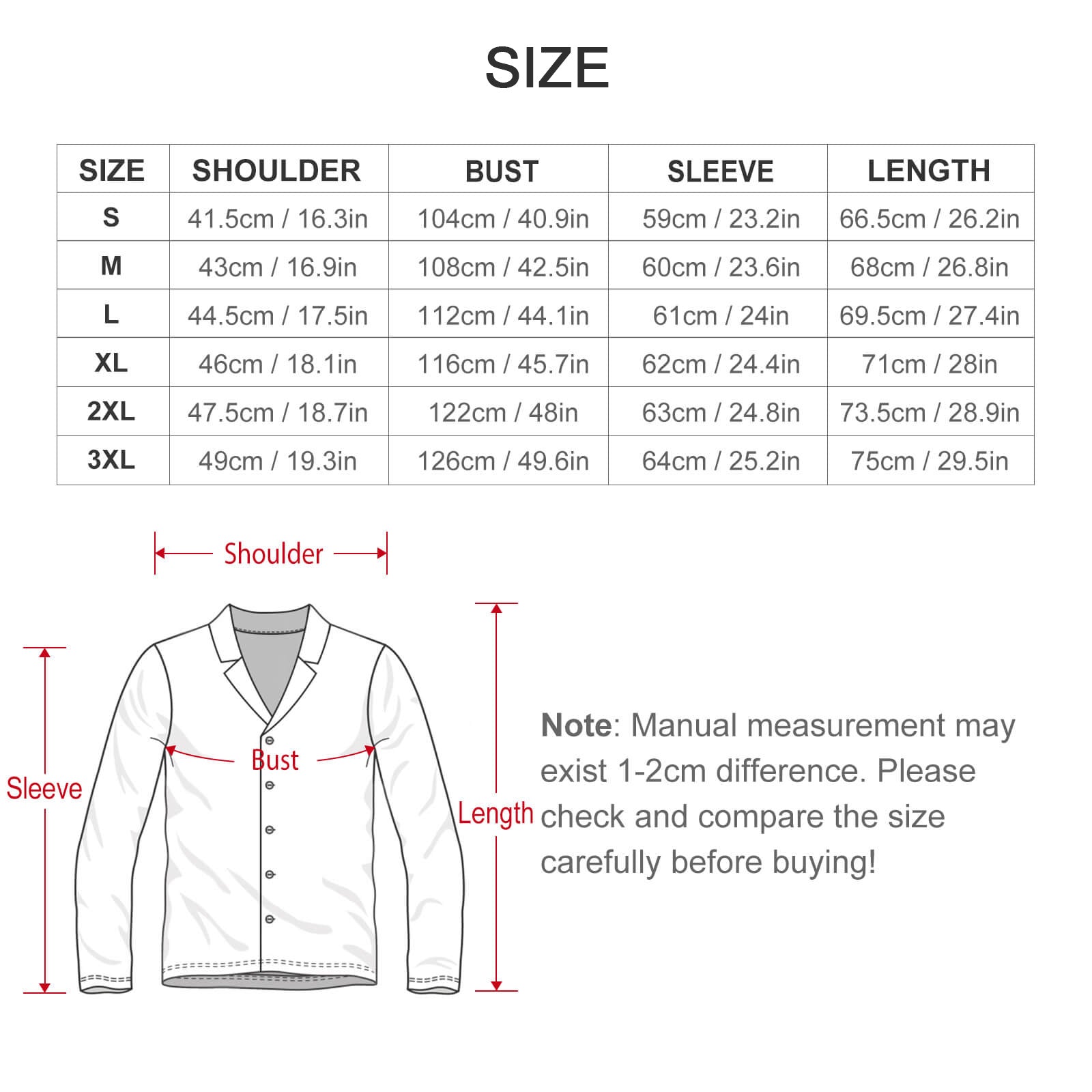 - Special Description: The data is measured with the garment laid flat. Due to varying measurement methods, an error of 1–2 cm is considered normal. Additionally, do NOT use colors identical to the garment's background color for design images, as this may cause ink failure during production. Such issues will not be covered by after-sales service.